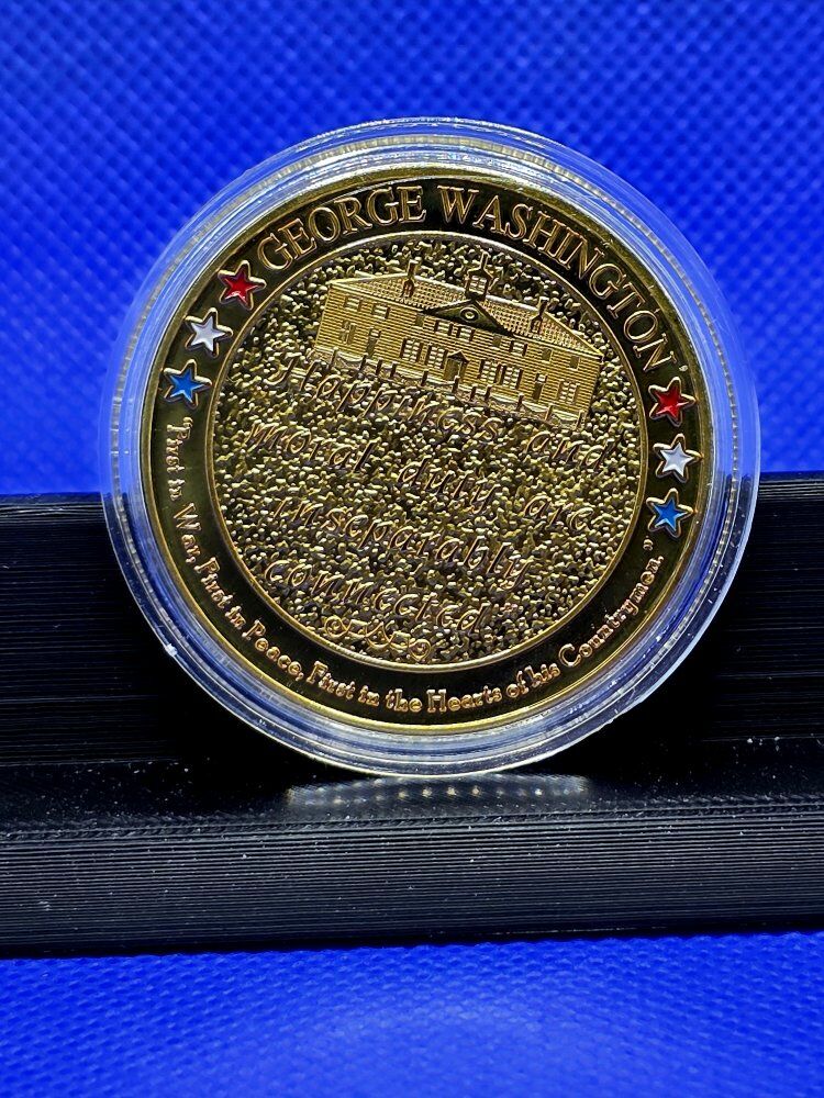Back: Mount Vernon with the quote: “Happiness and moral duty are inseparably connected.” Surrounded by red, white, and blue star details And the iconic phrase: “First in War, First in Peace, First in the Hearts of His Countrymen”