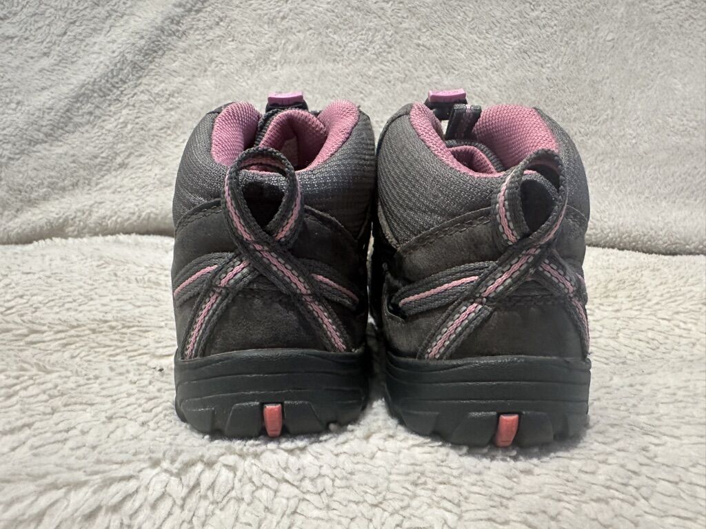 Keen youth size 1 gray with pink trim, and elastic laces with a toggle at the top waterproof mid hiking boots. These are in excellent condition, see photos for details. I take cash or Venmo, but cash is preferred. Text is best. 801-201-4446. Check out my other ads for additional sizes and styles.