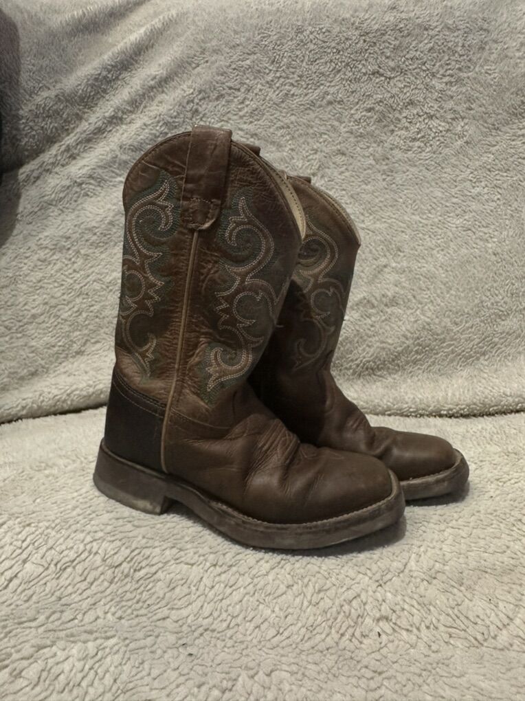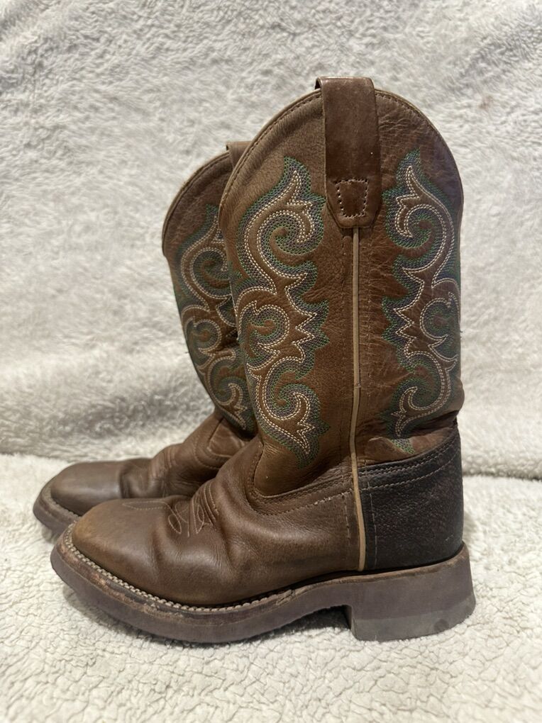 Old west toddler size 13 brown leather square toe western boots with green embroidery on uppers. These are in good condition, see photos for detail details. I take cash or Venmo, but cash is preferred. Text is best. 801-2014446. Check out my other ads for additional sizes and styles.