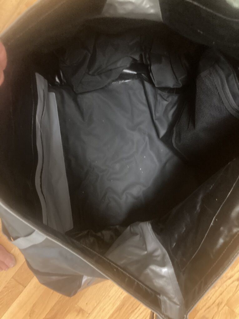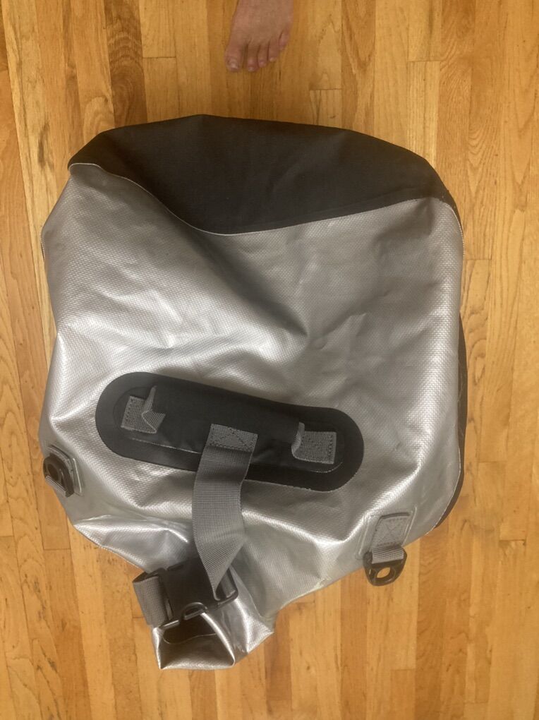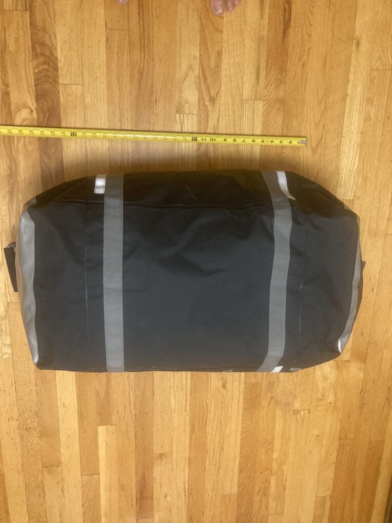 VenmoOverBoard Adventure Duffel Bag - 90 L - Black - pre owned NEVER use only in a display during a three day equipment show. Manufactured from strong and hard wearing PVC tarpaulin with double stitching. Has exterior mounting points for backpack straps no backpack strap included. Roll top with side buckle closures.; 3 internal zip pockets and two external zip pocket - compression straps Weather and Waterproof. Pictures of the actual item for sale part of the description