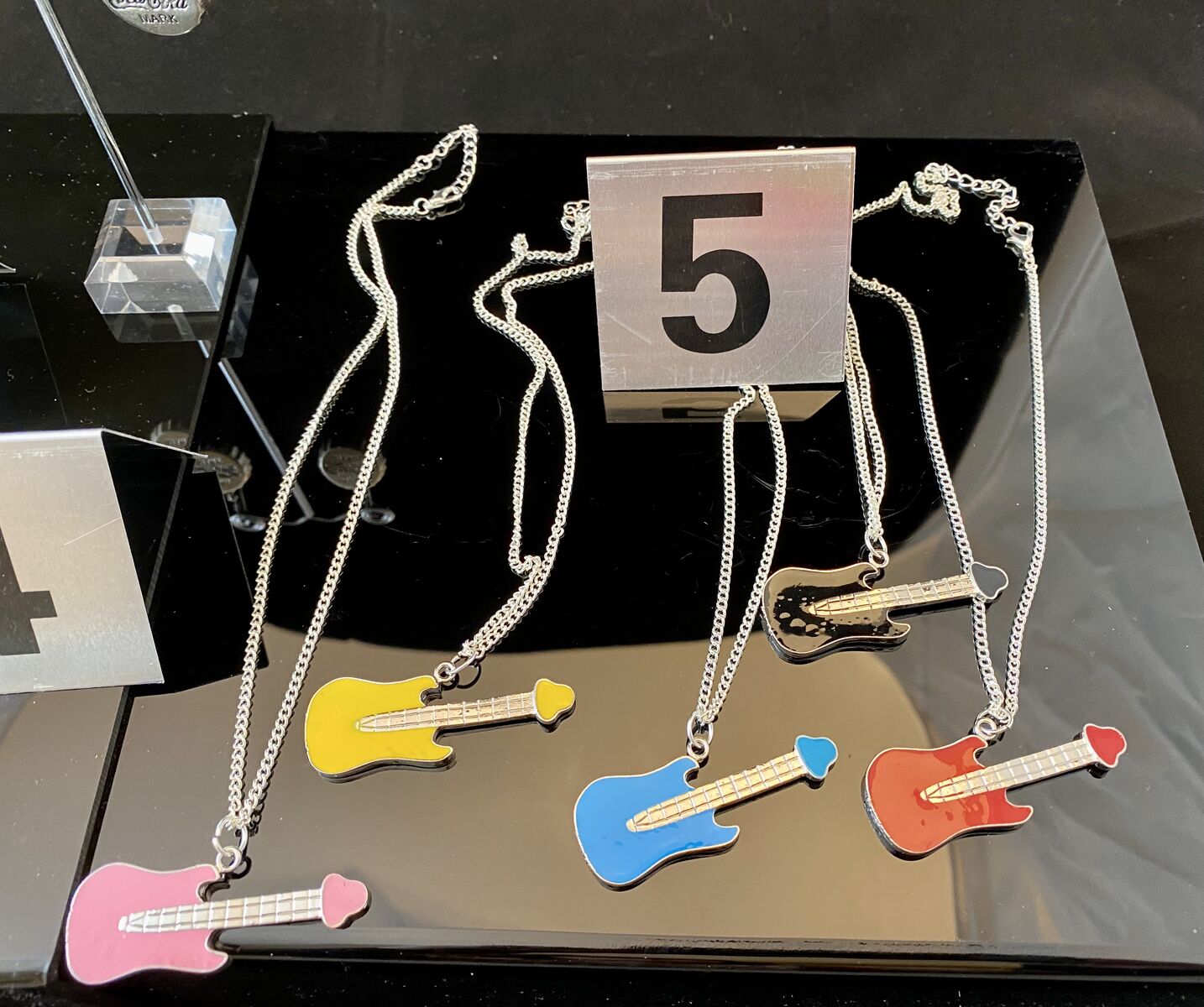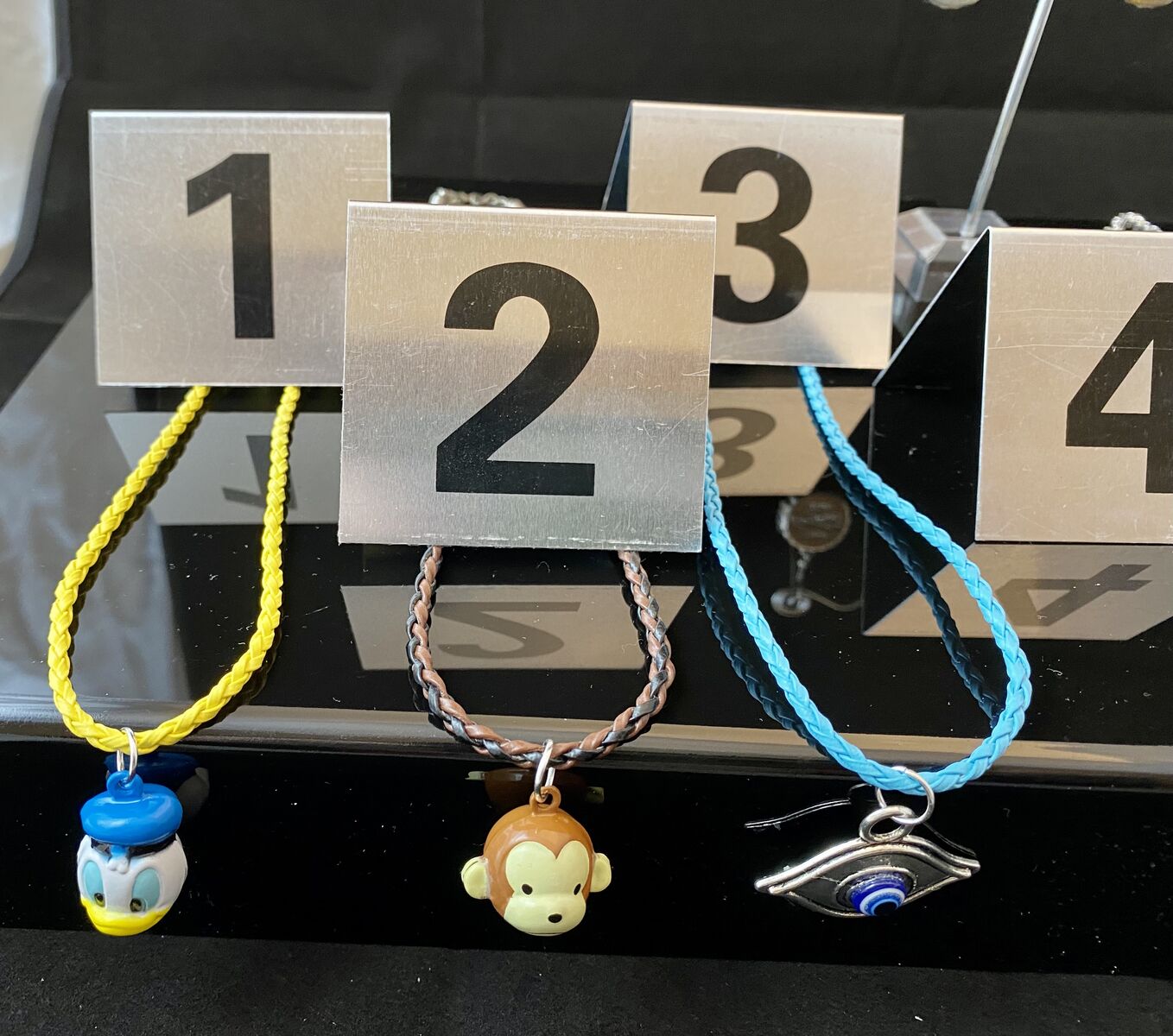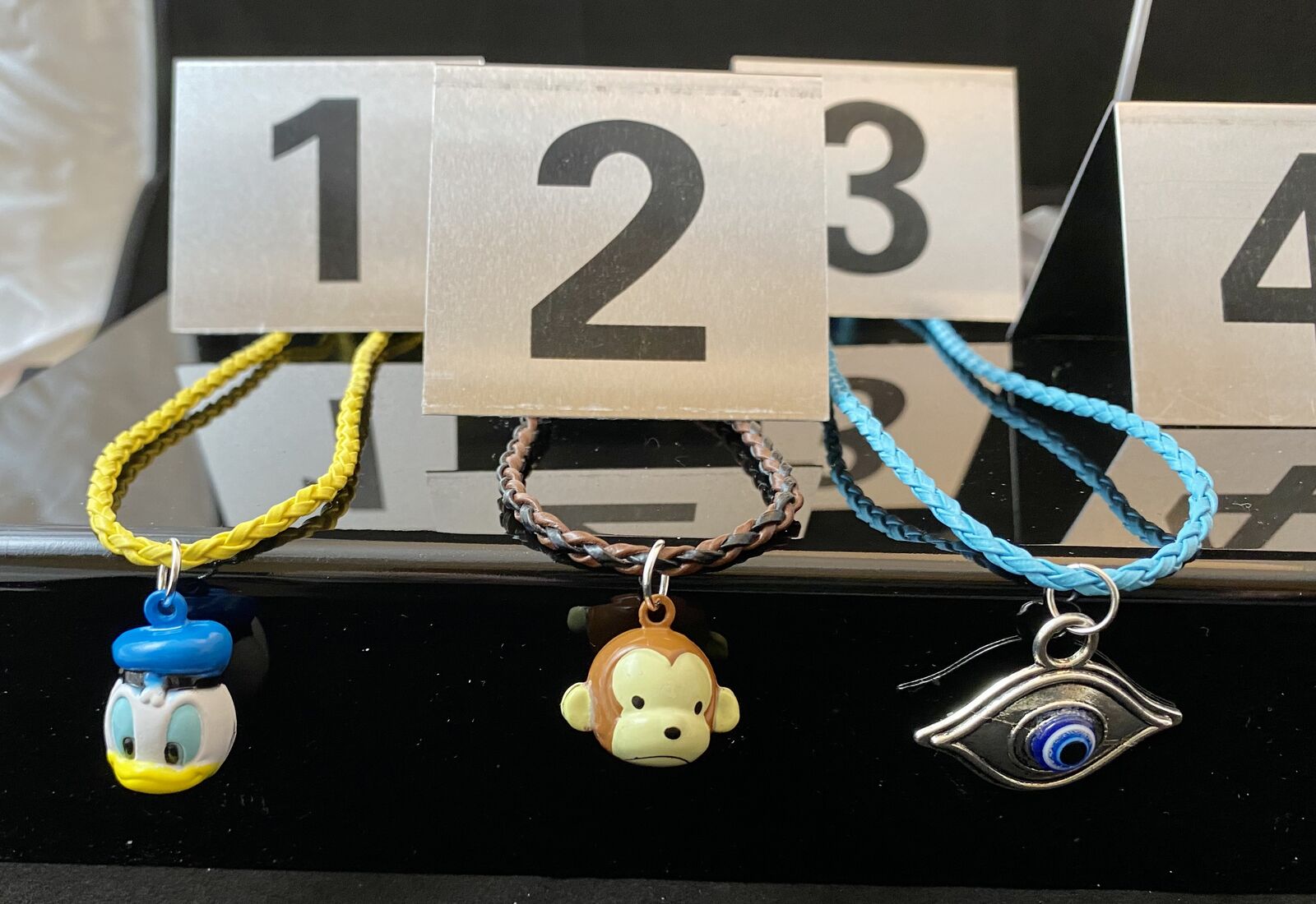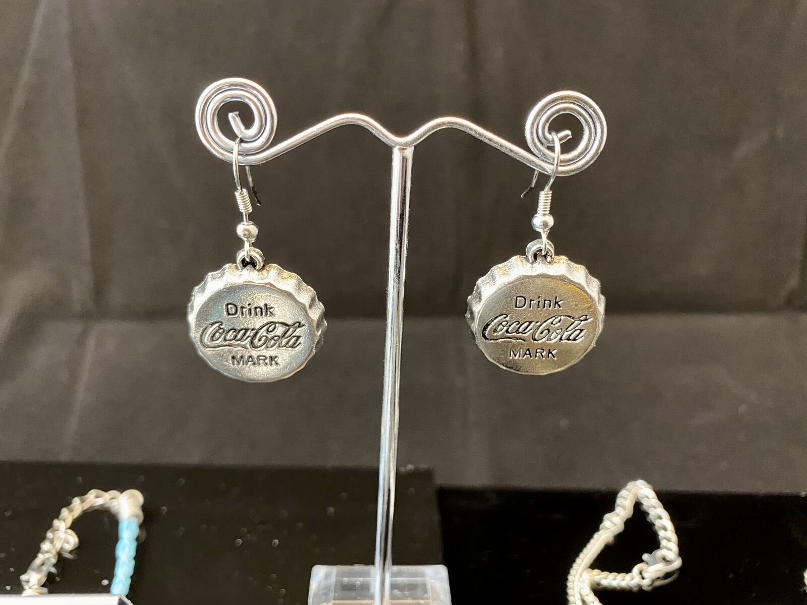 VenmoNEW - Donald Duck & Curious George Bell, Blue EYE, Colorful Enamel Guitar Necklaces & Coke Earrings - PICS. The first 3 necklaces come on 18 braided leather cord And the bells jingle. Enamel Guitar Necklaces come on 18 Silver Plated Chains and I only have one in each color. I have 3 pair of the Coca Cola earrings. I have several of 1, 2, and 3.