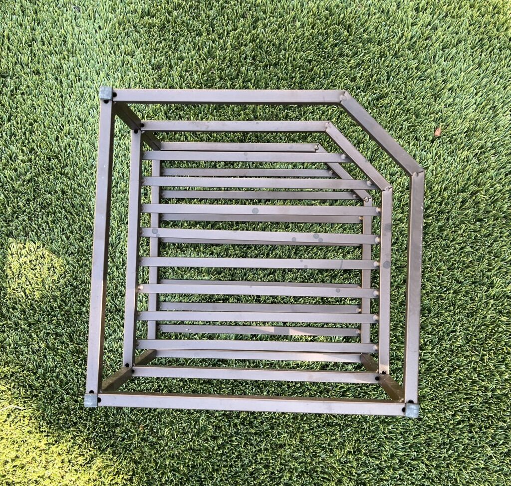 VenmoMetal storage organizer for plates/cutting boards etc. It is 9” high x 10” x 10” wide. Space between the dividers is 4,5”. $12