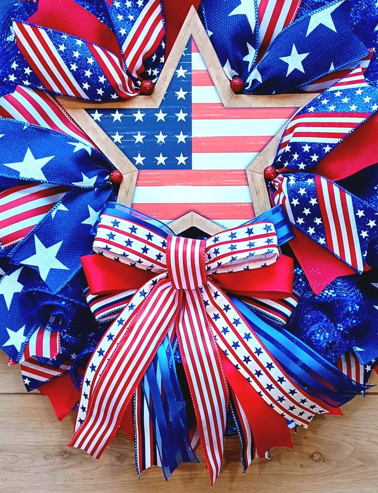 Embrace the spirit of freedom with this 24" Patriotic Wreath. This would make a beautiful gift for anyone who loves this Country. With lots of ribbon and a beautiful sign. I can customize and ship. Just ask!!!