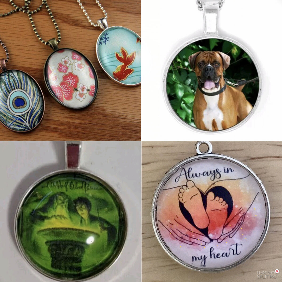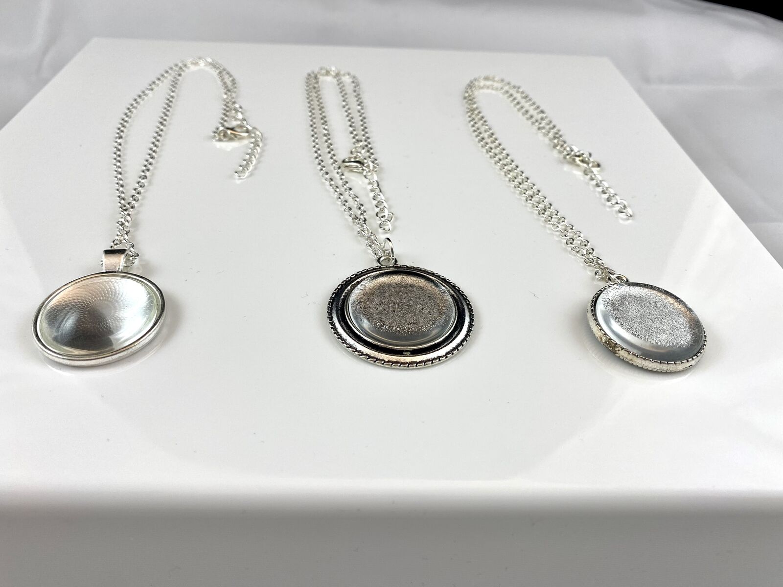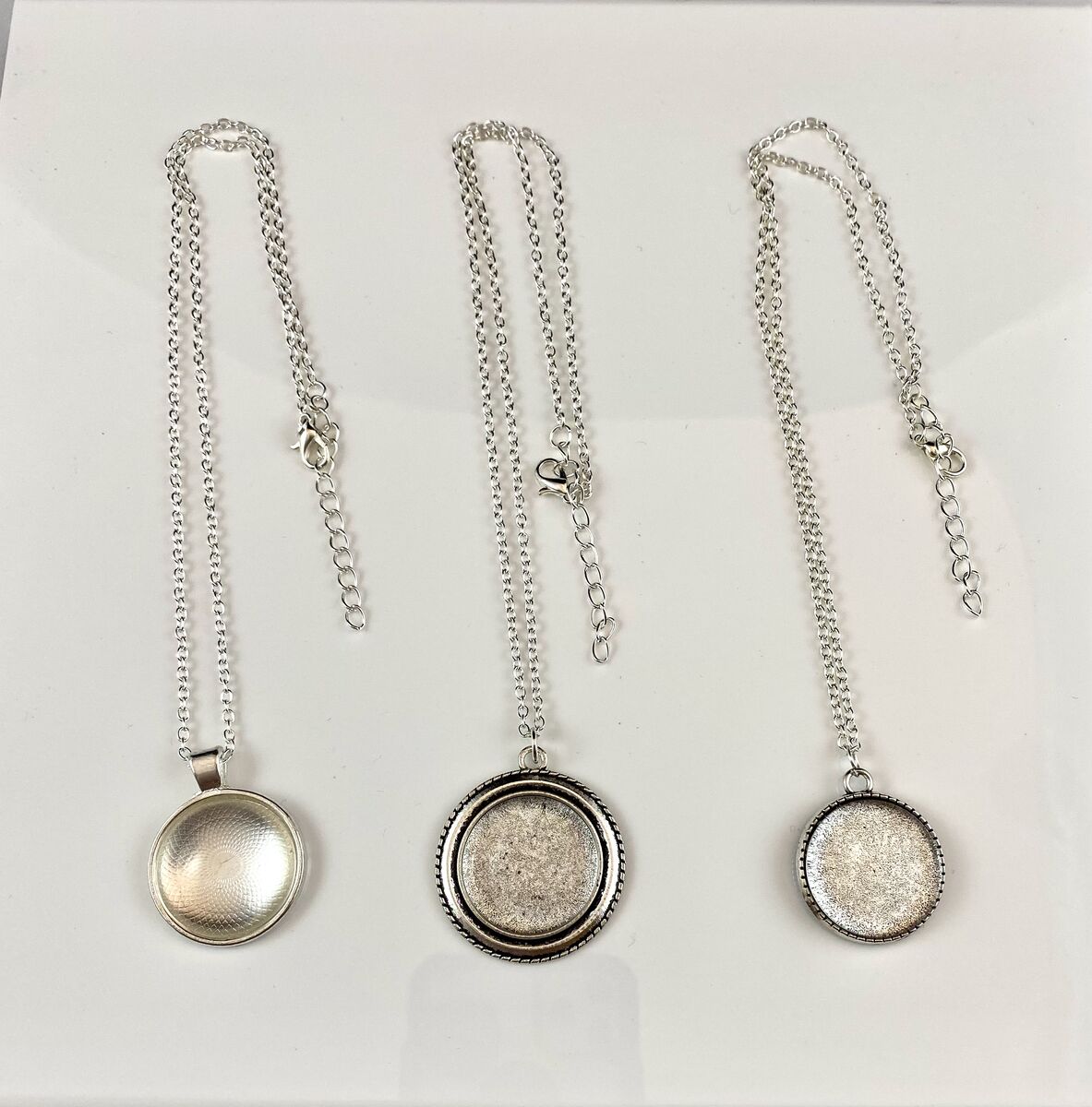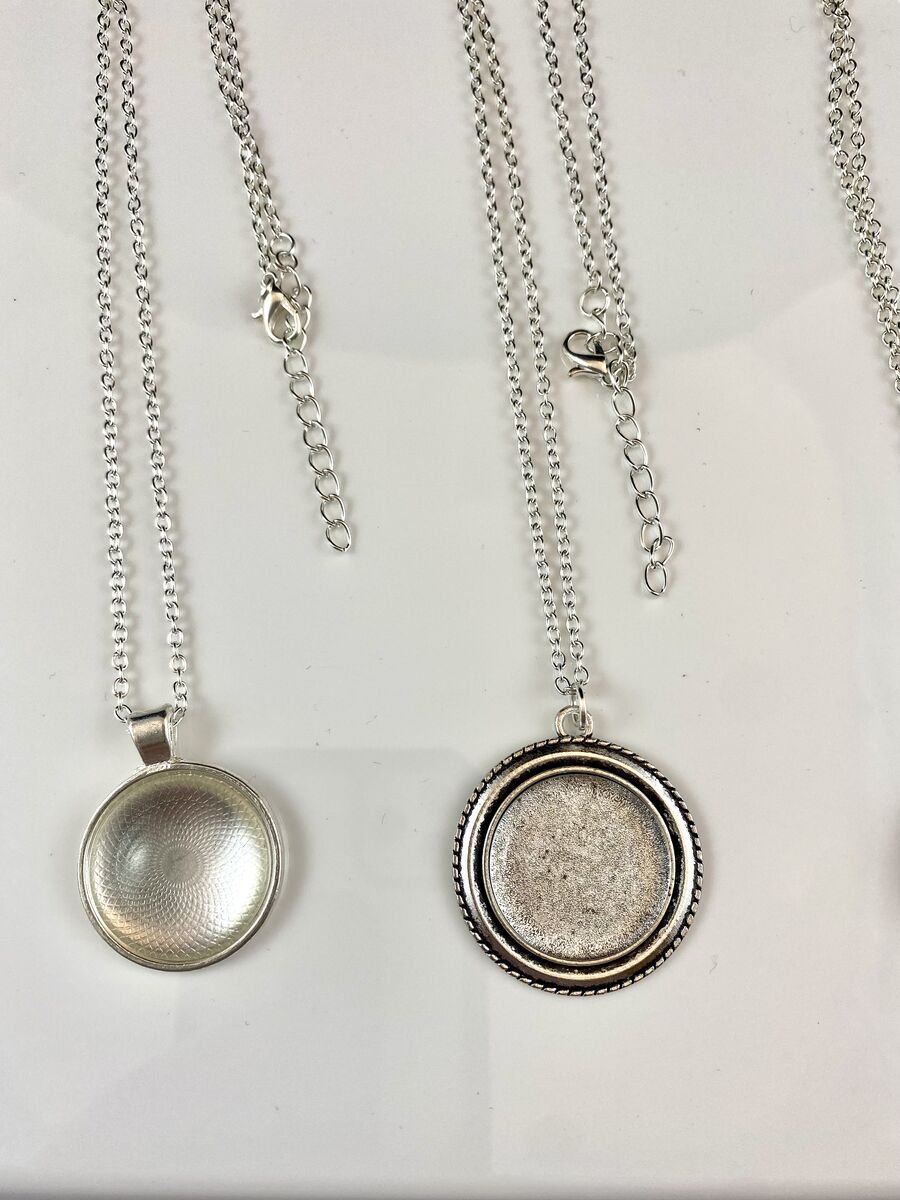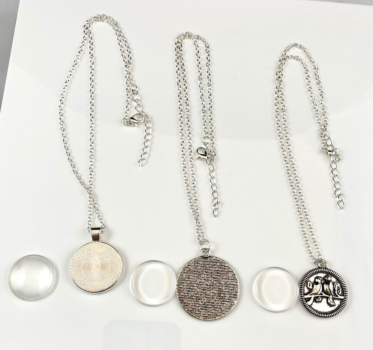 NEW - Silver Bezel Frame w/ Glass Cabochon - Included Silver Plated Chain - Add Words Art or Photos- C PIX. Each Bezel is a little different. I have photos of the front and back and some with the glass cabochon out. The last photo is just a few of the ideas you can do. You are only limited by what you can imagine. Check out my other jewelry listings and receive $1 off each qualified listing when you purchase 5 or more items.
