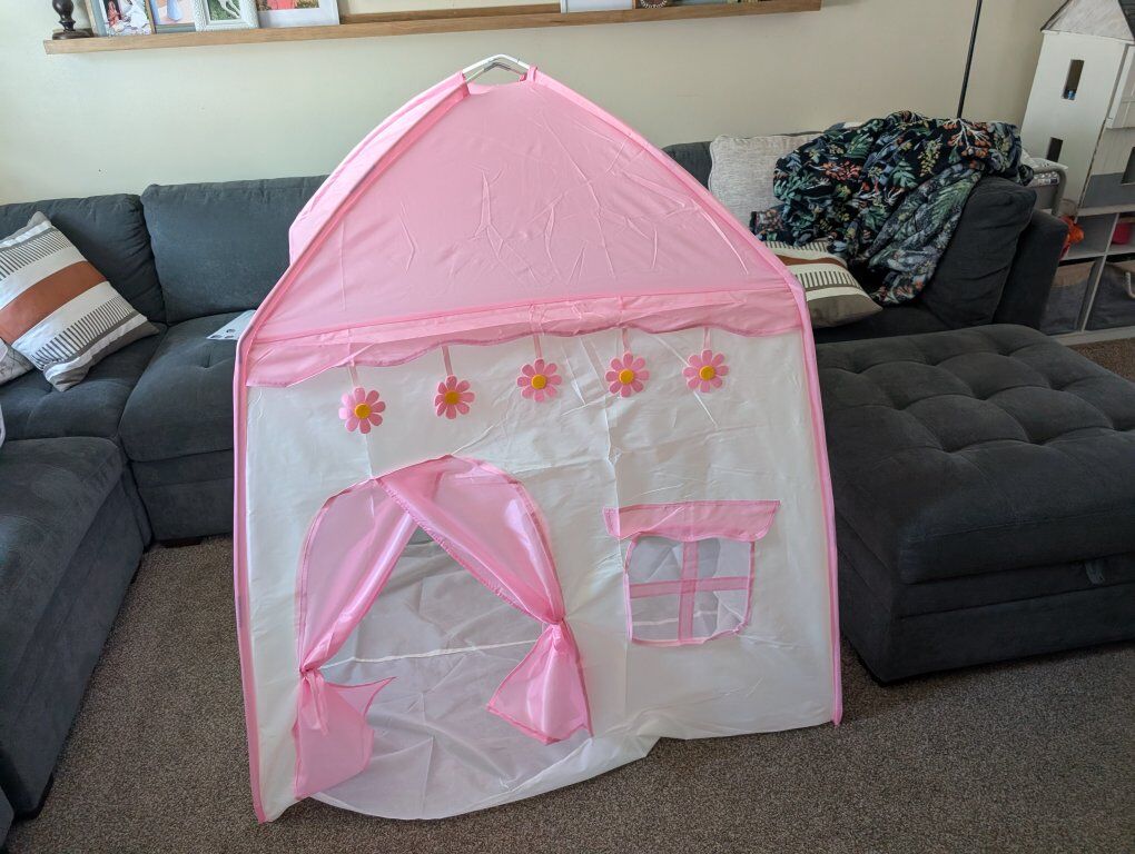 VenmoNew kids play tent. Pretty simple and straightforward. Only uses two tent poles and sets up like a normal tent. Dimensions are in the pictures. Nothing too fancy but does the trick. I have a few and kept one and it works just fine. Kids are having a blast playing in it. Asking $10. Text if interested 801-903-8337