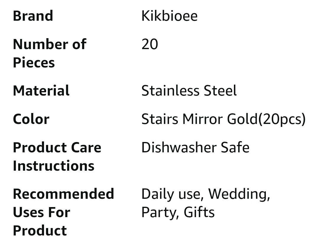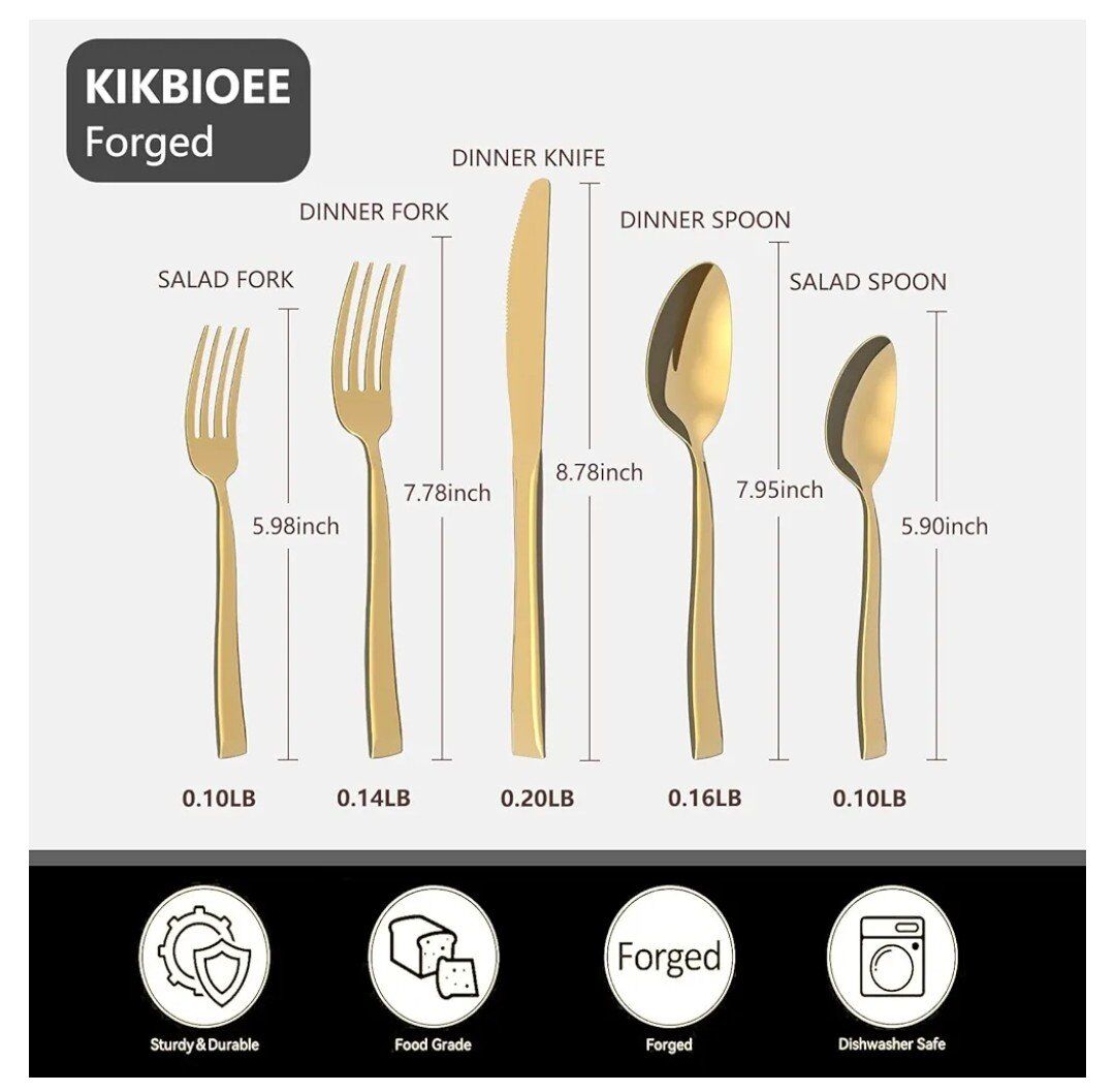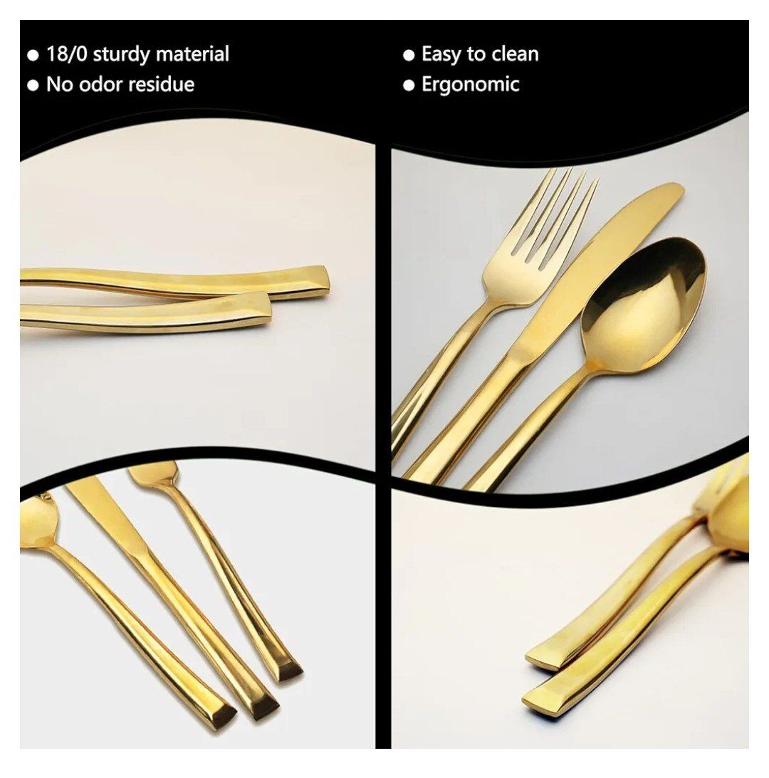 VenmoKikbioee 20-PIECE SILVERWARE: 20pcs stainless steel silverware set comes with 4 dinner forks, 4 dinner spoons, 4 dinner knives, 4 teaspoons and 4 salad forks. FOOD-GRADE STAINLESS STEEL: Our 18/0 stainless steel flatware set will not bend, break, or get damaged by heat. The appearance adopts exquisite titanium gold plating process. It is also designed to provide firm grip for children and adults alike. CLASSIC BUT UNIQUE DESIGN: Handle design and unique style - each handle is evenly wrought into the perfect joint shape, with proper weight and perfect balance to ensure maximum comfort during use. EASY CARE AND DISHWASHER SAFE: Our silverware pieces are dishwasher safe. It's still perfect after tens of thousands of washes.