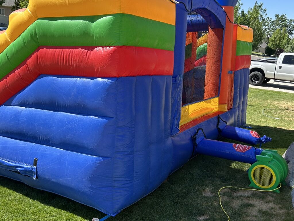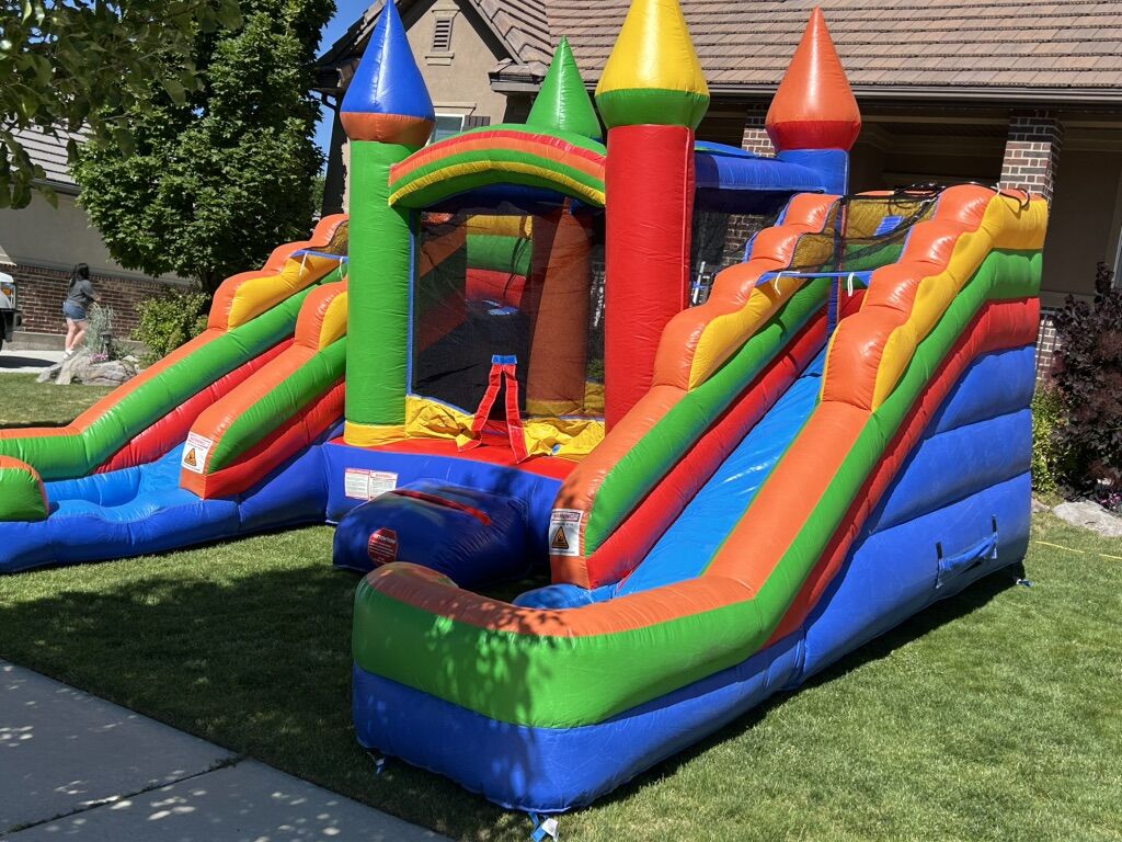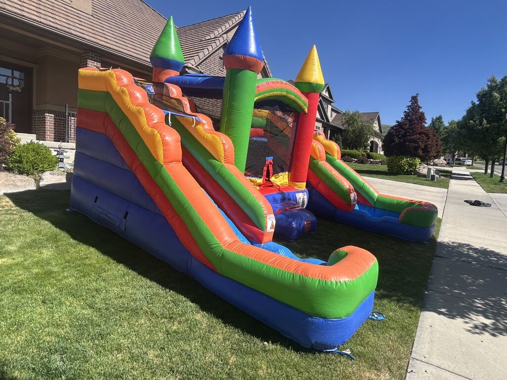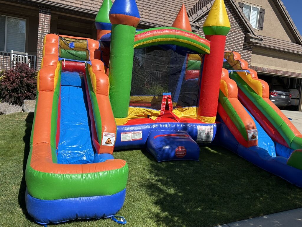 Bounce house in the center waterslides on the sides. Can be used with or without water.