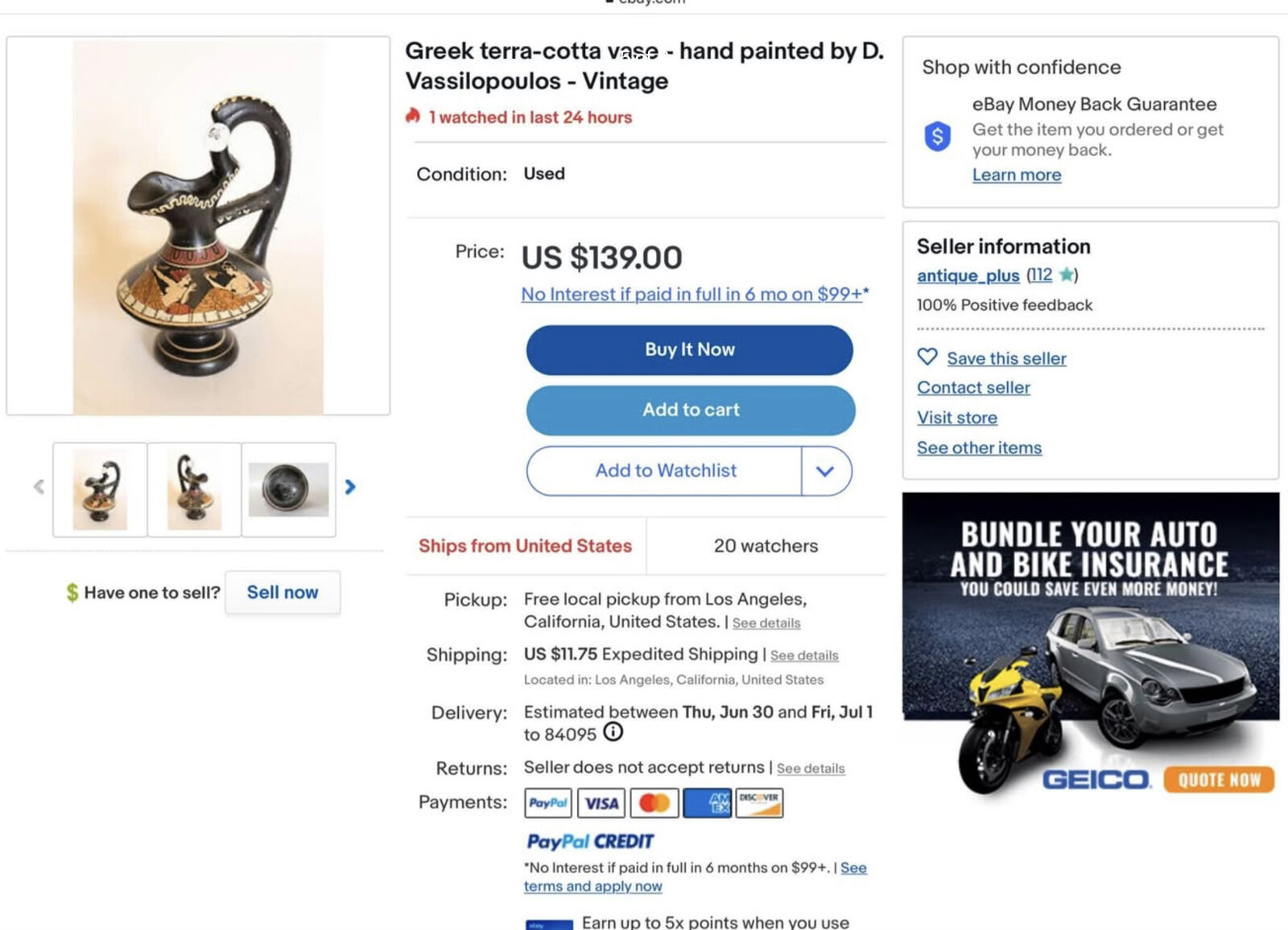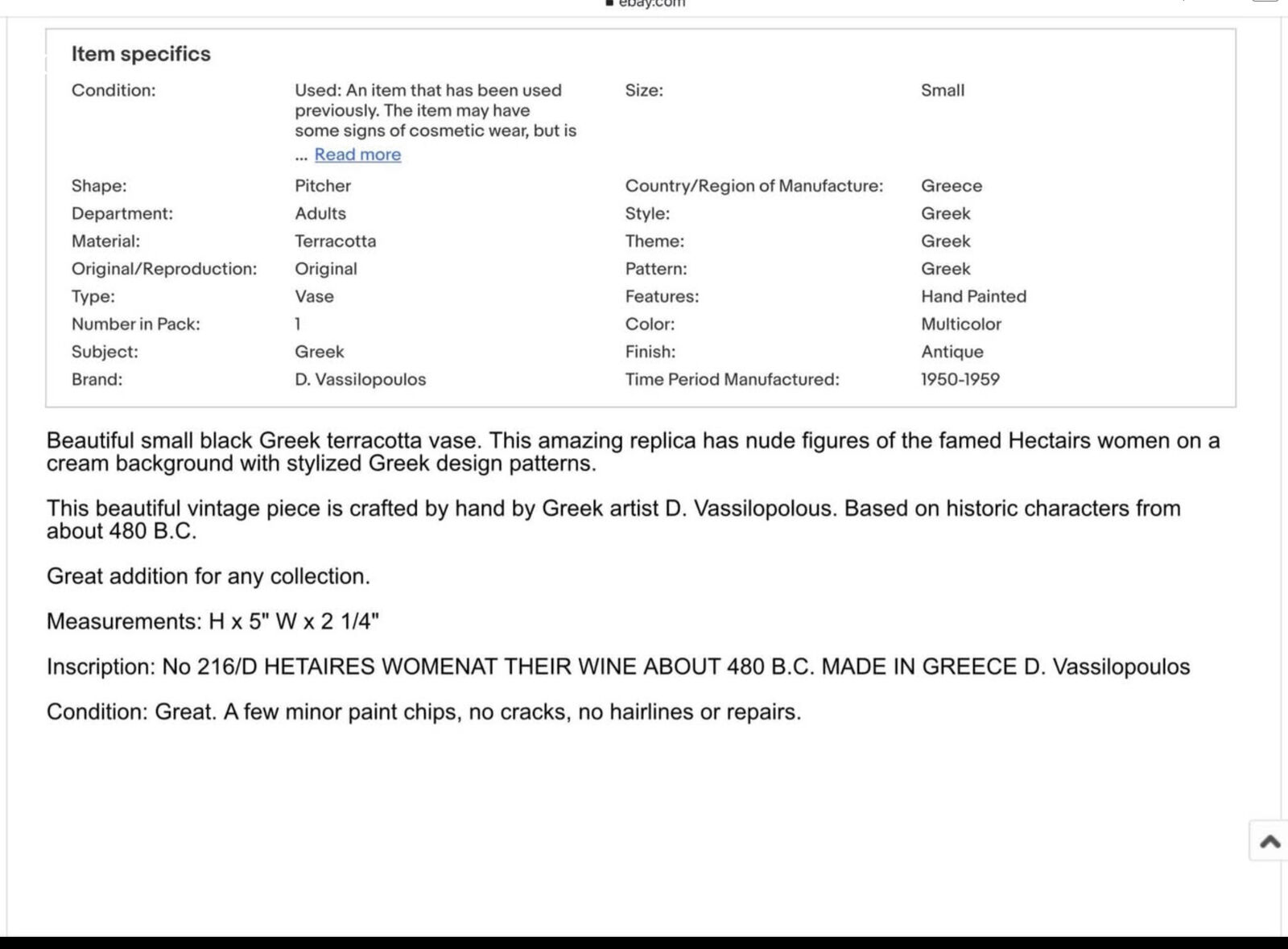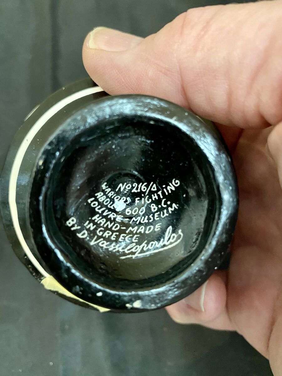 VERY RARE - GREEK VASE Warriors Fighting 600 B.C - By D. Vassilopoulos - Similar @ $151 - C PICS. Highly Collectible replica from Louvre Museum Hand-Made. # 216. Comparable sells on eBay for $139 + 12 shipping.