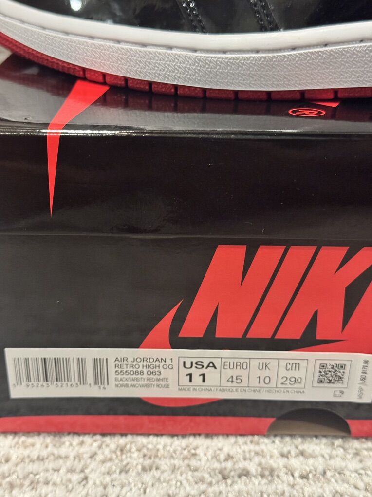 VenmoI am selling a brand new pair of Nike Jordan 1 High Retro OG sneakers in the Patent Bred color way size 11 Men. Shoes are new, unused and come in original box. I can not hold items, first come first served. Cash or Venmo only please but I do not take Venmo that is marked as a good or service. Thanks