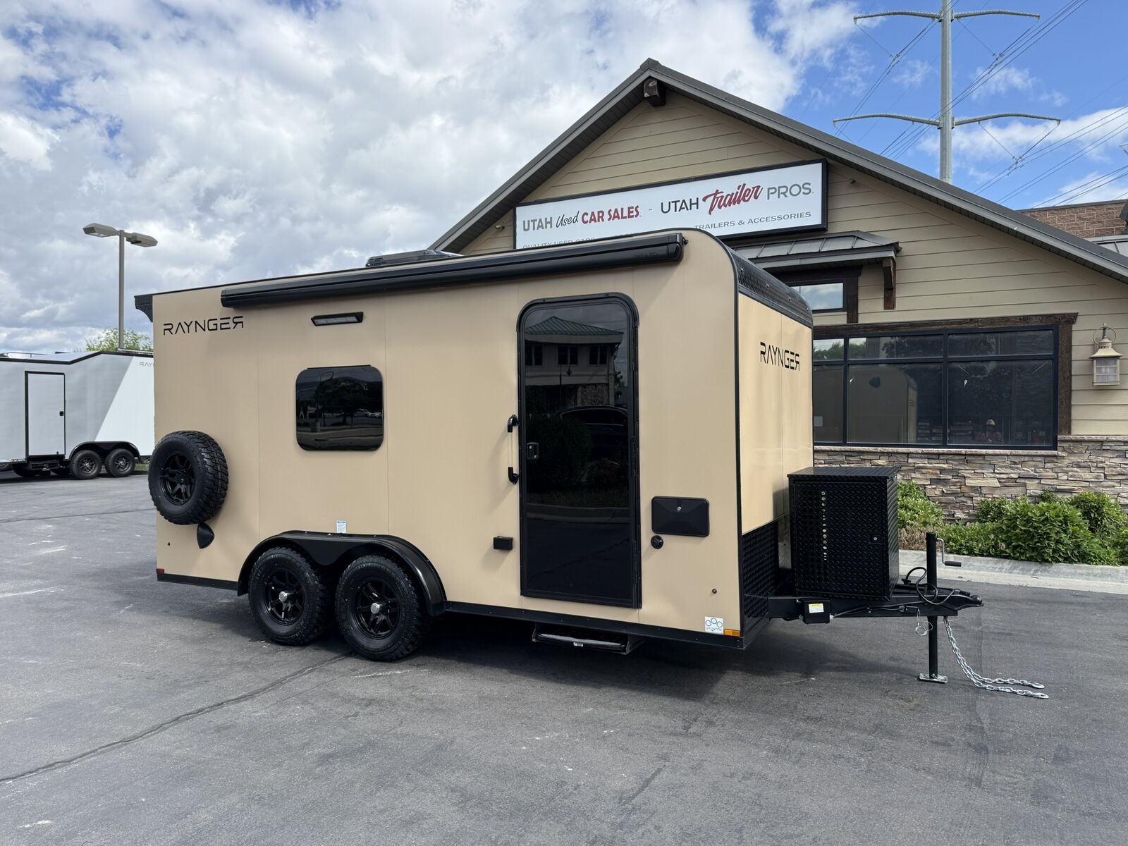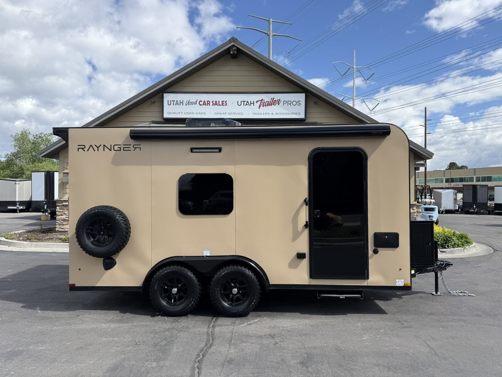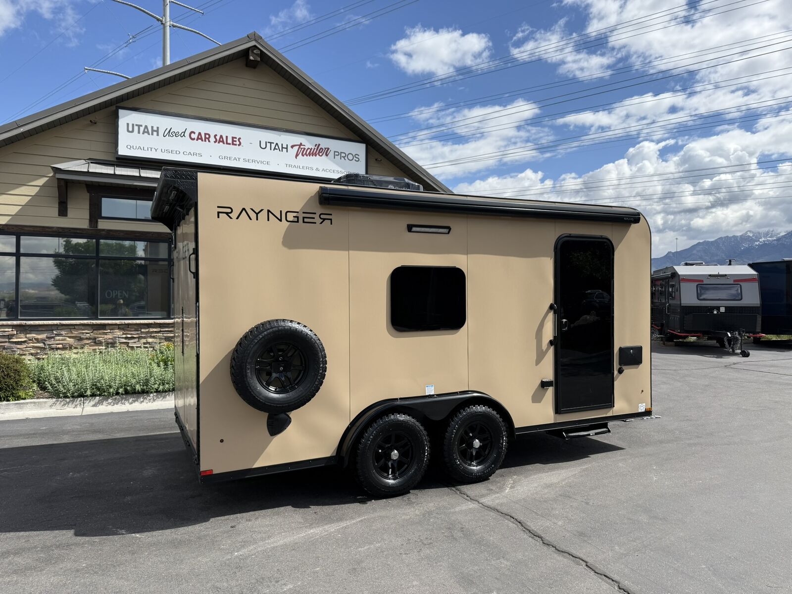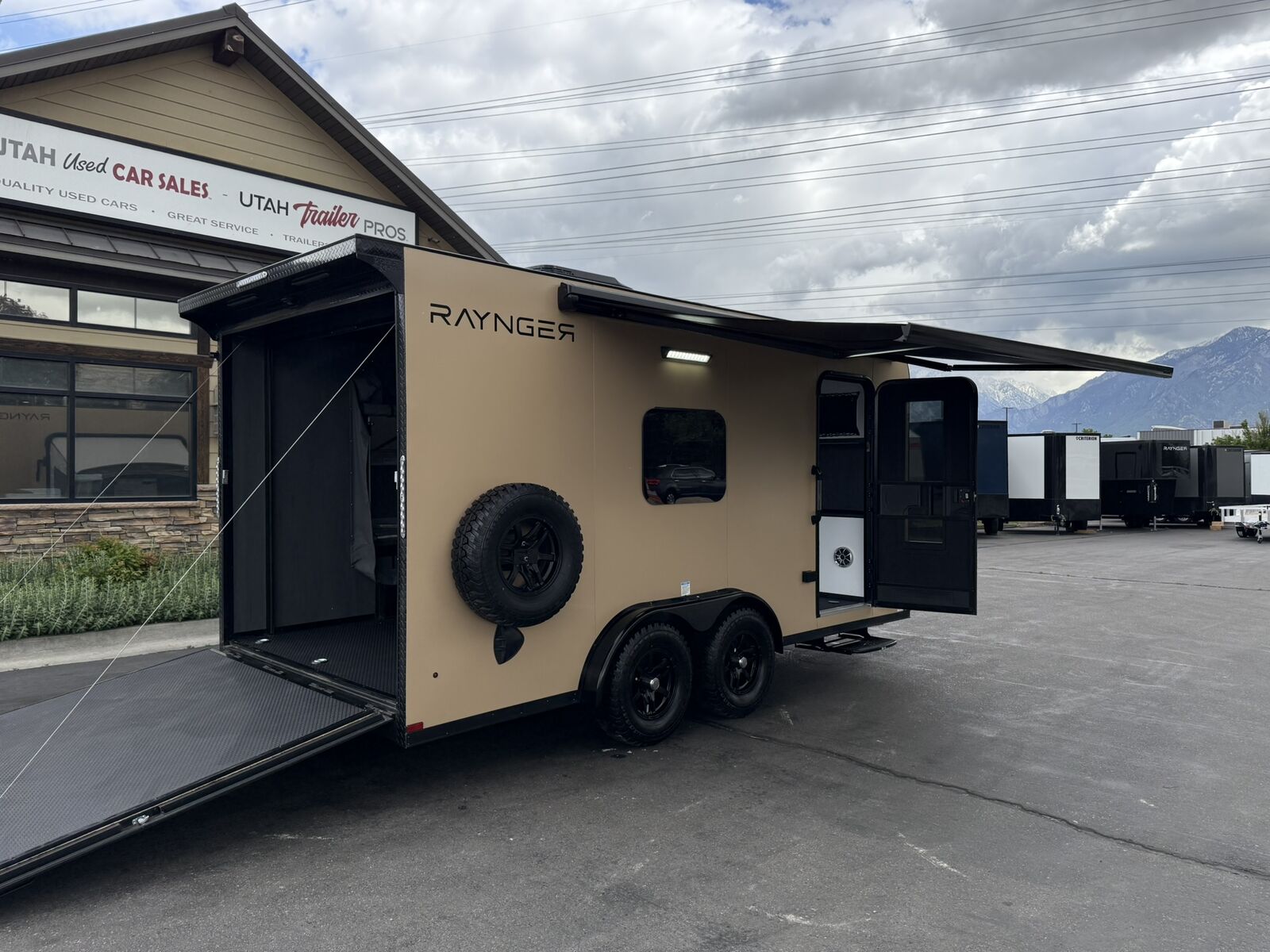 LIMITED TIME $222 A MONTH WITH ZERO DOWN WITH OUR SPECIAL LOCAL CREDIT UNION PARTNER!!! NO PRE-PAYMENT PENALTIES!!! NEW 7.5 WIDE MODEL!!! FITS ANY STOCK SIDE BY SIDE UTV!!! RAYNGER PREMIUM OFF ROAD TOY HAULER CAMPER!!! 20 Gal Fresh Water Tank with On Demand Water Heater and Water Pump! Outdoor Shower! 18 INCH GROUND CLEARANCE!!! OFF ROAD TIRES!!! FULLY INSULATED!!! HEATING AND A/C!!! WET SOUND STEREO!!! FOLD OUT/POP OUT TENT WITH MATTRESS!!! Ventilated Locking Generator Box!!! UPGRADED TORSION AXLES!!! 14.2 Foot Long Garage Space!!! And Much MUCH MORE!!! Check out our Specs!!! Also available in 18 foot models. 18 Foot Models can have 3 Fold Out Beds/Pop Out Tents. 16 Foot and 18 Foot Models will fit ANY stock 4 Seater Side by Side • 6” I Beam Frame• Flat Top Design• Flat Front Design• Wall Posts 16” on Center• Cross Members 16” on Center• Roof Bows 16” on Center• Rust Inhibiting Z-Tech Protection on Chassis• Ameraguard on Tongue• Ameraguard on Rear Bumper• Ameraguard Around All Door Openings and Stepwell• Ameraguard Around Edges of Ramp Door• 3500 LB Spring Axles• 2-5/16” Coupler• One-Piece Aluminum Roof• ST235/75R15 Aluminum Wheels with Chrome Center Caps• 2000# Ramp Door with Eberhard Latch• 30” Tempered Glass RV Door with Screen Door• .030 Exterior Metal with Screwless Sides• 24” Black Stoneguard• 3” Black Bottom Trim• Sand Pad• Black Door Hold• 2.7mm Charcoal Textured Vinyl Ceiling • 9mm Charcoal Textured Vinyl Walls• 3/4” Engineered Wood Floor with Rubber Coin Overlay• (6) 1200 LB Floor D rings Installed with Backer Plates• LED Clearance Lights and Tail Lights• LED Back-up Lights• No Show Wheel Box• Spoiler with Toggle Switch• RV Step• 7’ Interior• (2) 17” Chrome Base Lights with Switch• (1) Black 17” Spot Light with Switch• (1) 30 Amp Panel with Marine Plug• A/C Unit with Heat Strip• (3) Interior Recepts• (1) Exterior Recept• 12V Battery and Charge Line• Prep for Backup Camera• Wet Sounds System• (3) Blue Interior Cabinet Lights• (1) 6’ Section of Flex Lights• Black ATP Rear Header and Hoop• Black ATP Fenders• Insulated Walls & Ceiling• Base Cabinets• Overhead Cabinets with Netting Over Compartments• Pop Out Tent• Black ATP Storage/Generator Box Mounted On Tongue 7SW092746