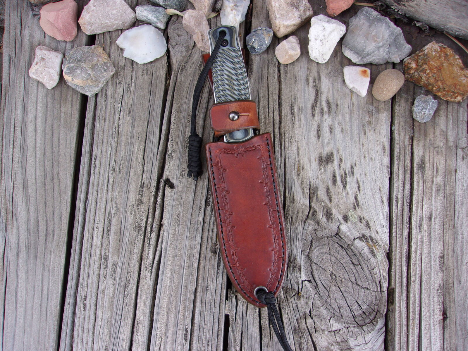 Also included is an LF Custom Leather Sheath that is “hand cut” & “hand sewn” using a saddle stitch for increased strength and durability. The leather is 8-10 oz. Full Grain Leather that has a dyed finish and treated with Sno-Seal for longevity and protection. On the face of the sheath is barbed-wire tooling. The knife is held in place with a leather retaining strap and secured with a button stud.