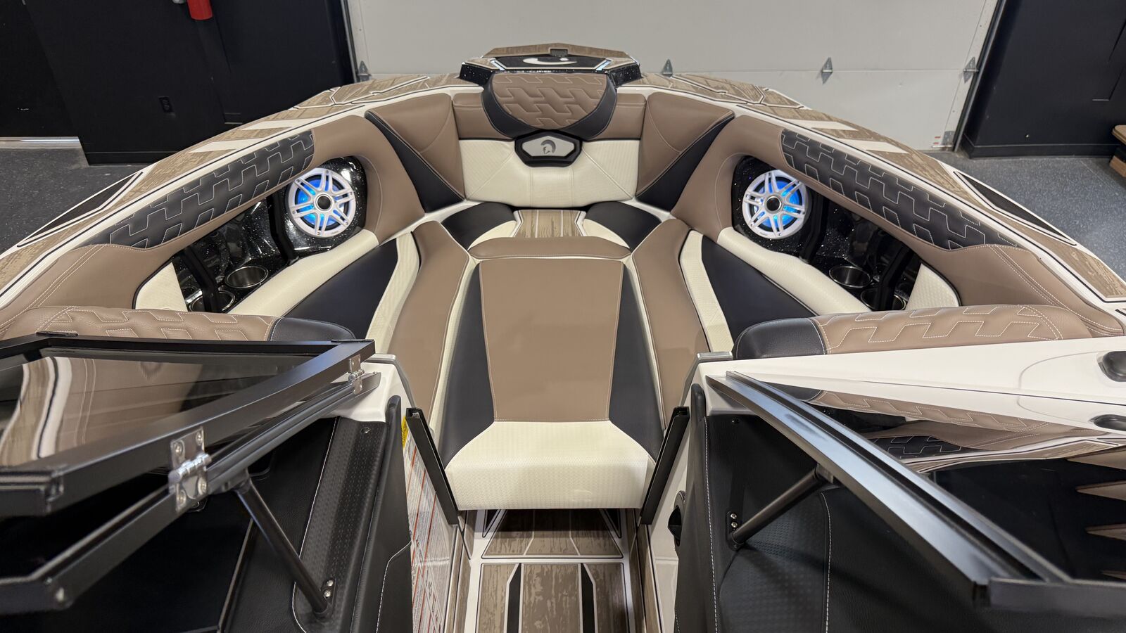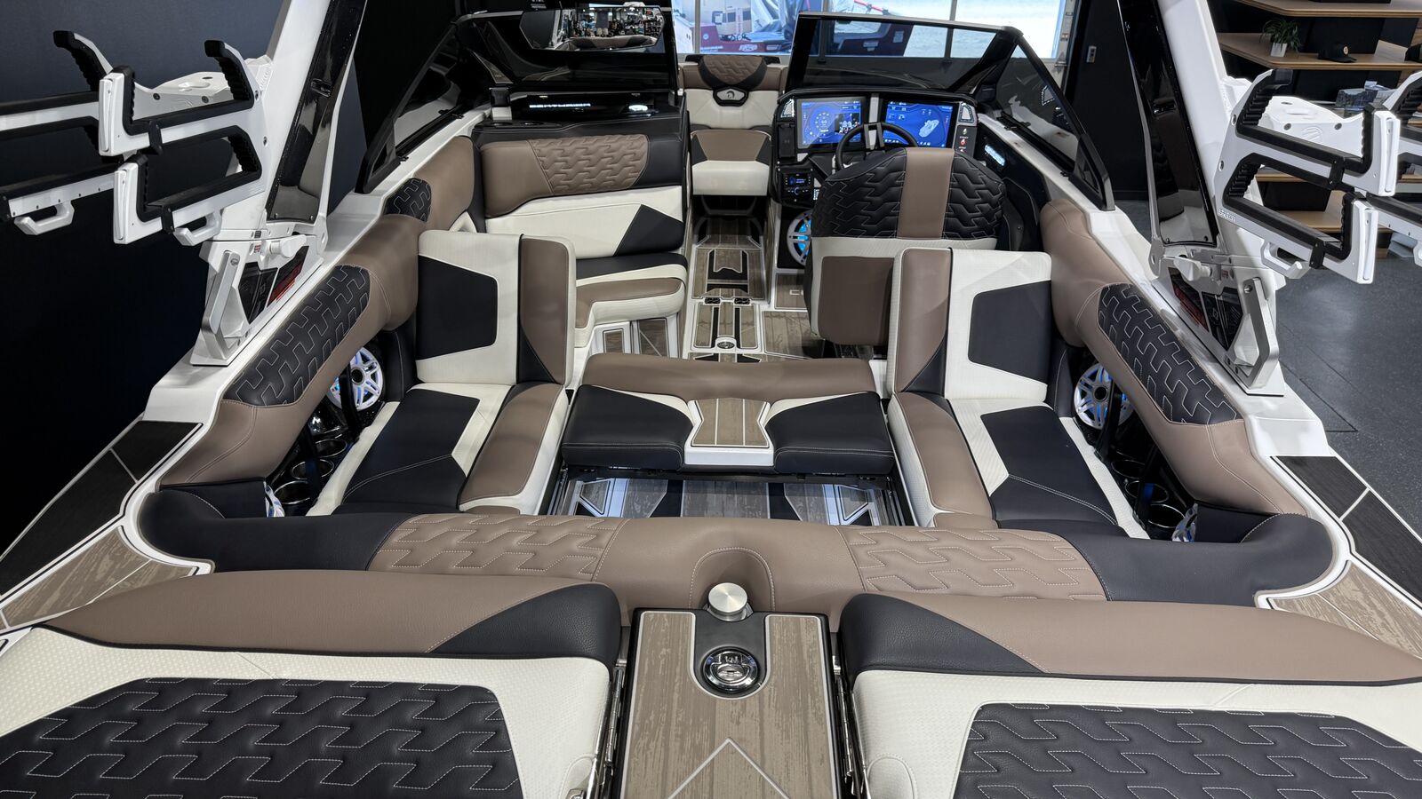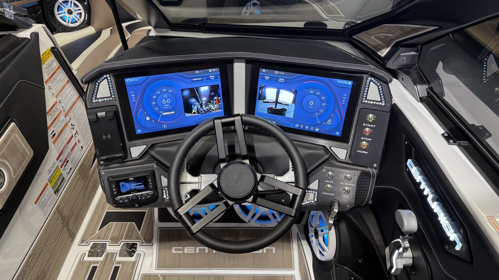Centurion’s Ri230 is twice as impressive as other boats due to its capacity as official tow boat of two World Championships in two distinct water sports disciplines – wake surfing and wakeboarding. Even during these prestigious events, the Ri230 pulls many professional and personal bests. All of our Ri Series models are flagship designs, but the Ri230 hits that sweet spot for the wake sports enthusiasts, whether professionals or beginners, seeking luxury in a 23-foot size. Its responsive handling, world class waves, wakes and ride are wrapped in comfort. It has all the things you want – as well as those you didn’t realize you want – to make your experience on the water unforgettable, whether you are an athlete or a passenger. From the Range of View (ROV) system that lets the driver see forward, behind and fuel usage data, to the four conveniently-located wireless clamping phone chargers, to the limo lighting beneath the three-position slide seat, the Lit throttle and the external plug-in access for battery charging – the Ri230 demonstrates that Centurion is paying attention to our customers’ needs. The Ri230 is the world’s best waves, wakes and ride for as many as 14 people, built with comfort and convenience in mind. Buy it for the performance, enjoy it for its luxury. You really can have it all.