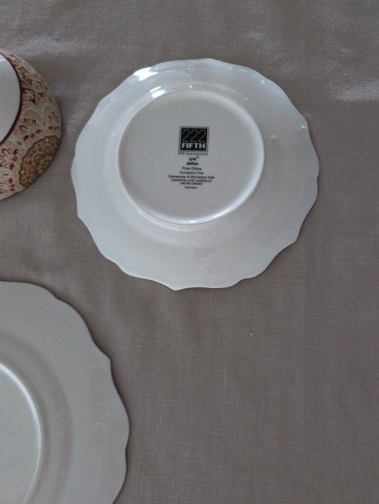 12 dinner plates 10 3/8" 12 salad or dessert plates 8 5/8" 12 bowls 5 5/8" and 2 3/4" deep No chips, no cracks and still have original boxes for all except 1 box for 4 bowls. These dishes are dishwasher and microwave safe and are Porcelain Fine China made in Indonesia. These are beautiful and still for sale on eBay and Replacements.com