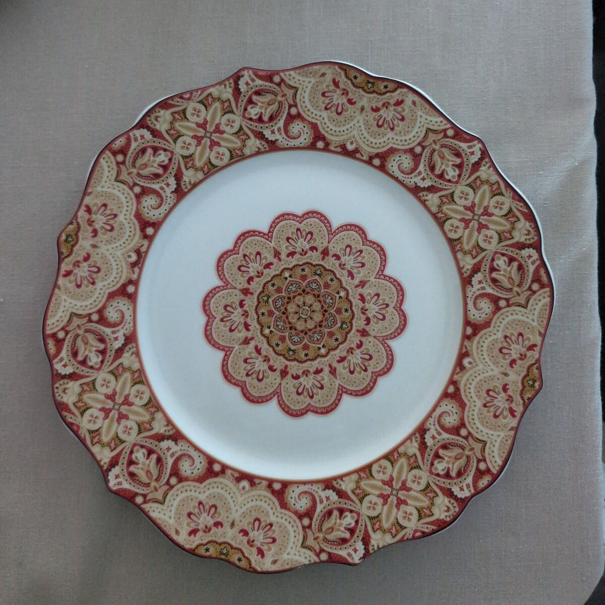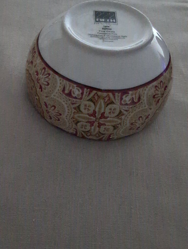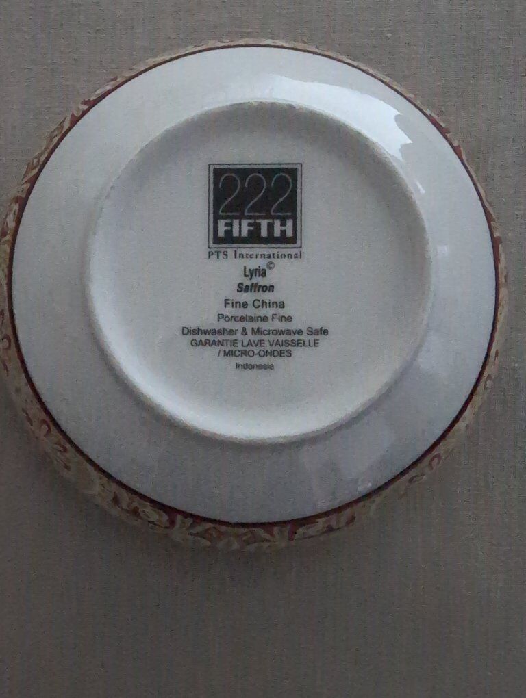 222 Fifth Lyria Saffron 36 pieces. 12 dinner plates 10 3/8 inches 12 salad or dessert plates 8 5/8 12 bowls 5 5/8 and 2 3/4 deep. No chips, no cracks and still have original boxes for all except 1 box for 4 bowls. These dishes are dishwasher and microwave safe and are Porcelain Fine China made in Indonesia. See them for sale on eBay and Replacements.com.