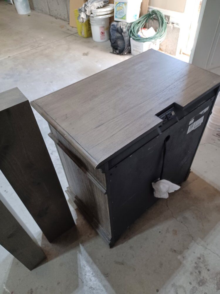 Nice Nightstand with USB and power connectors. A couple a minor cosmetic dings during shipping. Two matching floating shelves included. 34 inches long by 17 inches wide by 30 inches tall. The floating shelves are 34 inches long by 6 1/2 inches deep.