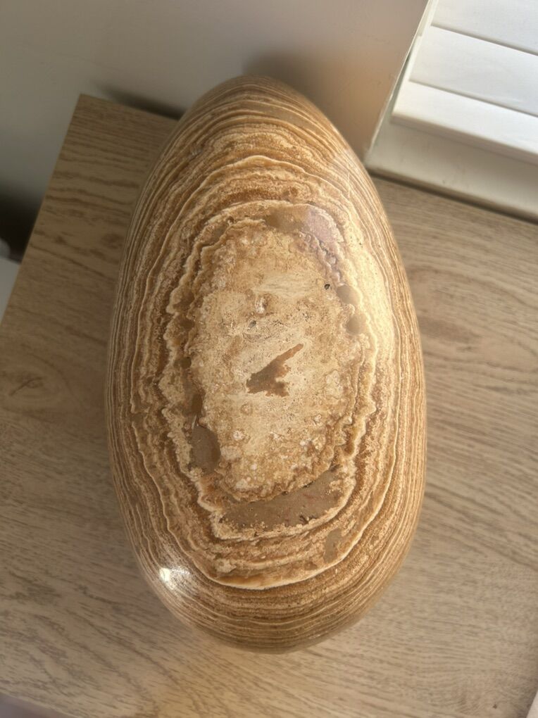 Egg shaped stone made from aragonite. A powerful symbol representing the earth, and fertility, Set your intention for new beginnings and blessings. Aragonite is a form of calcite. Aragonite is grounding and calming. It provides relaxation in a stressful period. It also relaxes and calms inner anger, irritation and hypersensitivity. It restores the balance of things in life and reconnects you with your inner power to allow you to stay true to yourself without being influenced too much by others. Also helps with chronic fatigue. It belongs to the 1st, 3rd and 7th chakra