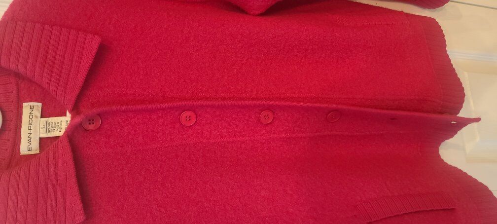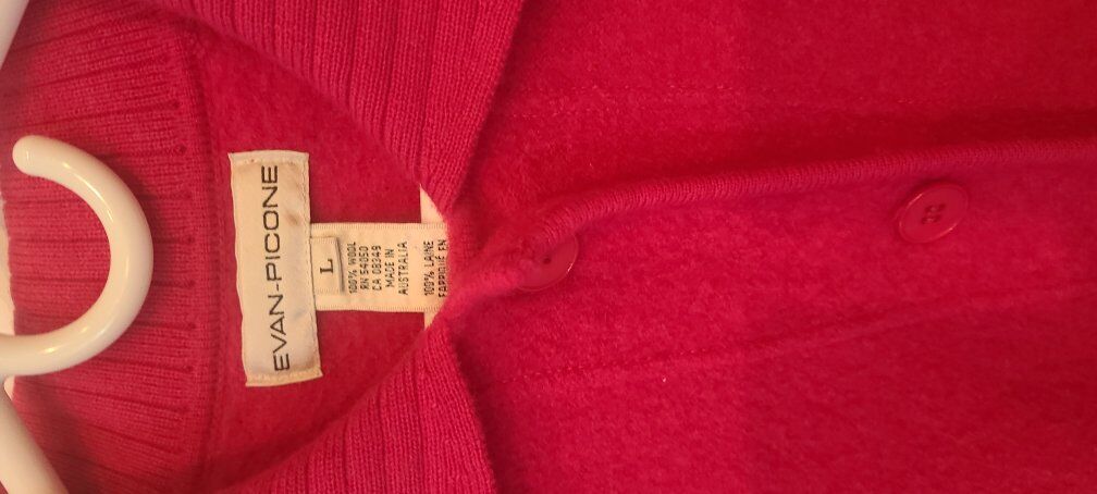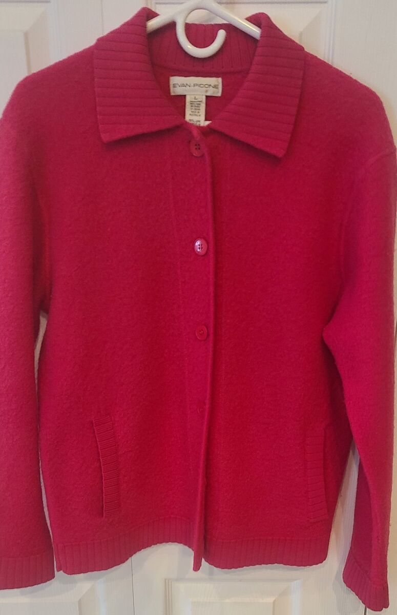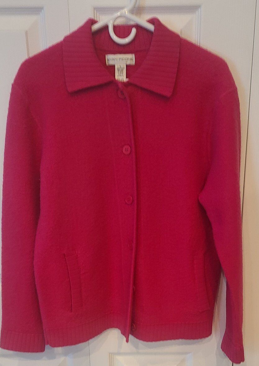 ZelleFor your consideration is this beautiful women's designer cardigan sweater in a vibrant bubble gum pink . My camera really doesn't capture the hue color of this sweater . Sweater is in near mint condition and only worn a few times. No snags..holes or repairs. Always stored in a climate controlled smoke free enviroment . Length is 27 " ..pit to pit is 21 1/2 " . I take Zelle for payment or cash upon pick up . Will ship at buyers expense .