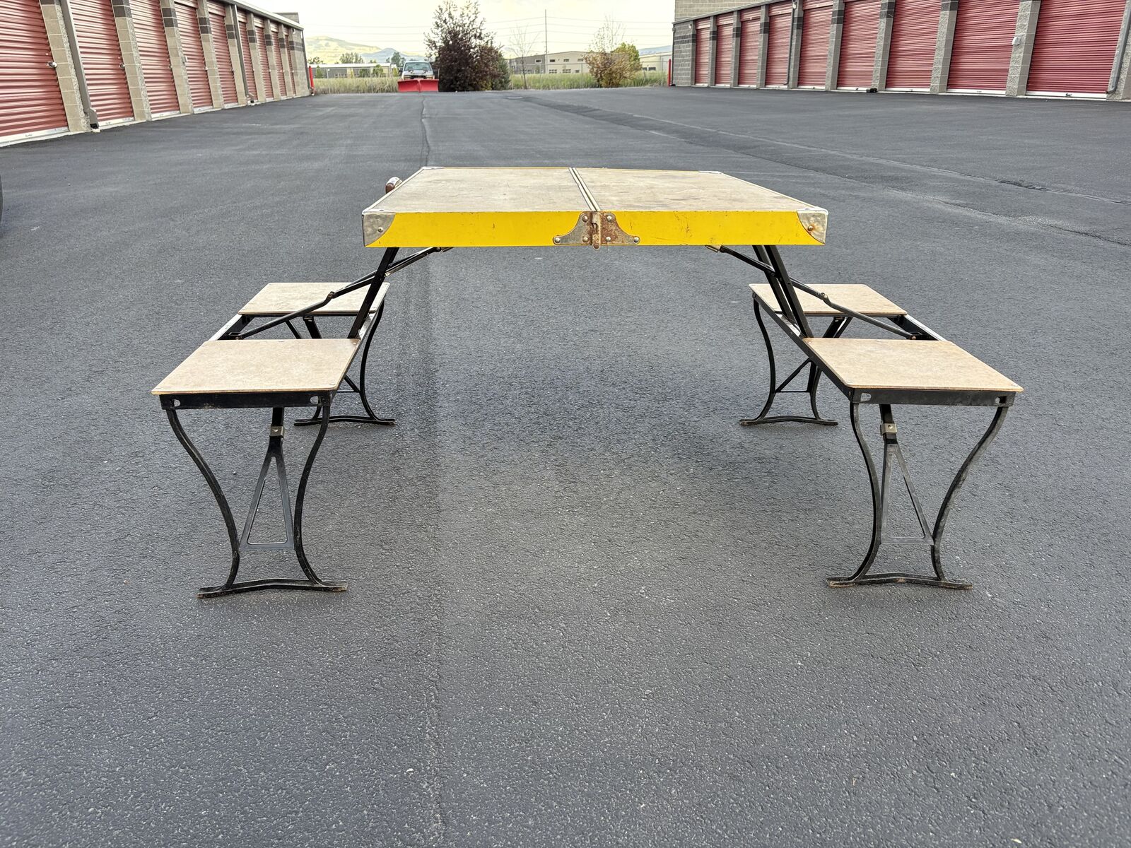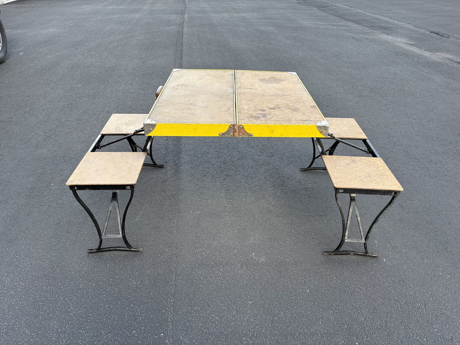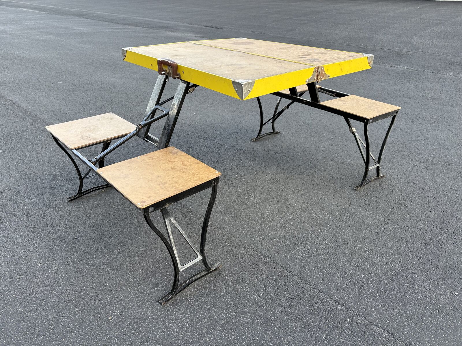 VenmoVintage Handy brand, antique folding camping table with integrated chairs works great, made in Milwaukee Dimensions (opened up) Tabletop is 28.75" deep x 33"wide. overall width is 58" x wide 32" deep table top height is 27.5 tall