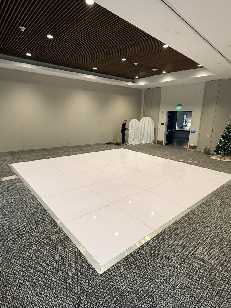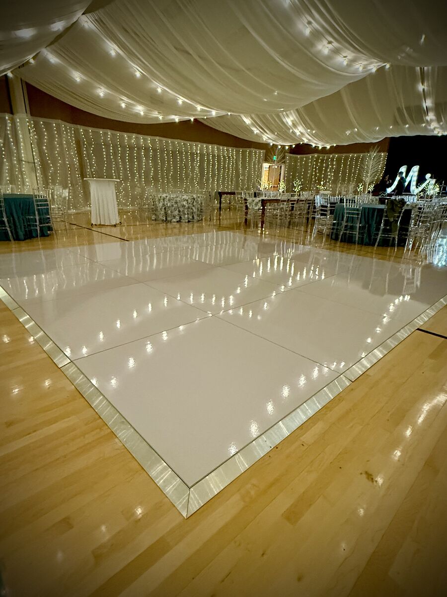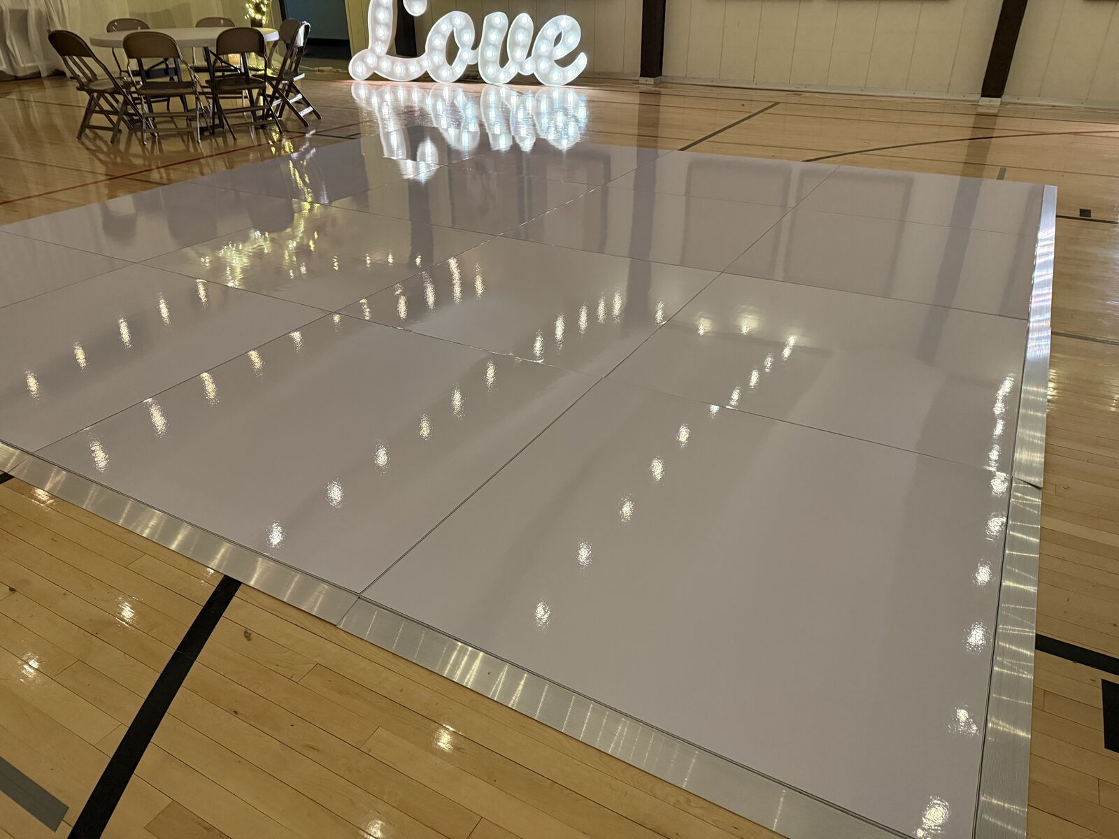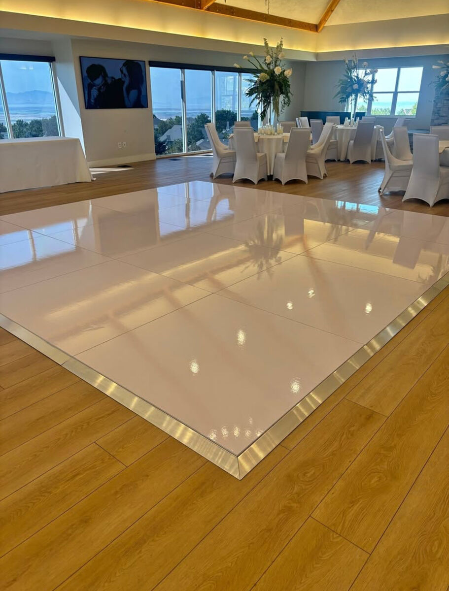 CashAppLet our elegant yet sturdy white gloss dance floor add to your wedding, birthday party, quinceanara, or other event. Measures 16x16ft with solid aluminum edging to add a high quality touch. \