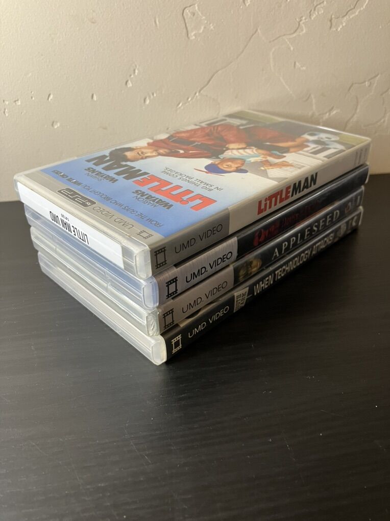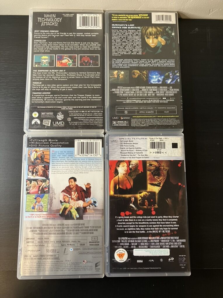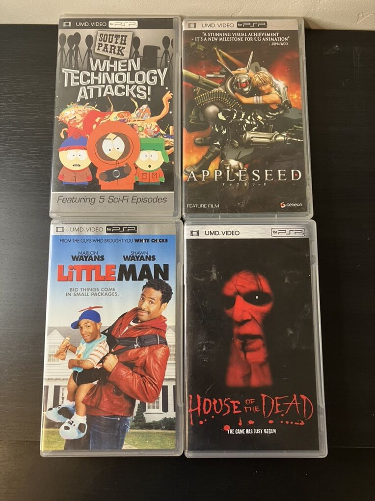 Pre owned Original UMD Videos for the PSP. I am asking $15 each. Little Man is basically new, not sealed but still has seal sticker attached seen in pictures. -Little Man -Appleseed -House of the Dead -Southpark: When Technology Attacks Open to trades of greater value. Located in Orem UT.