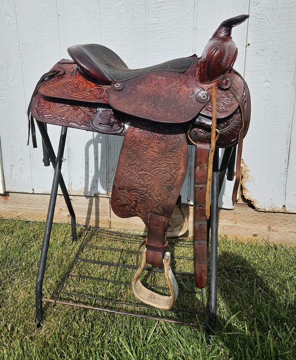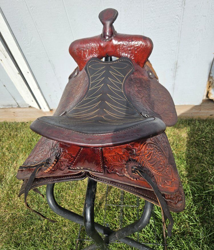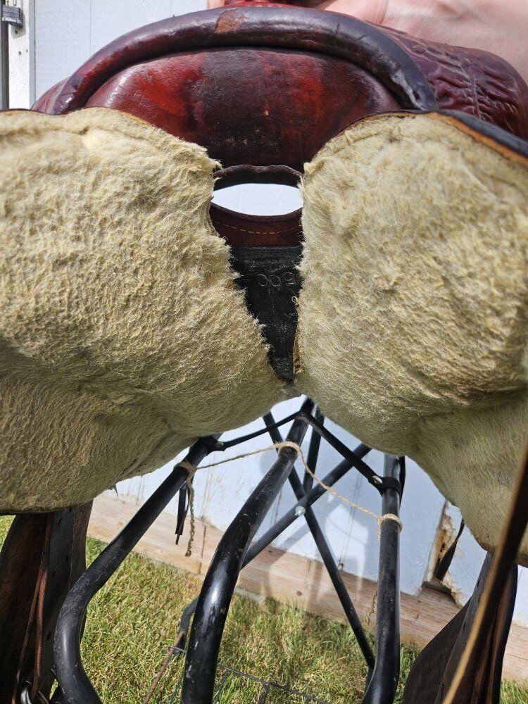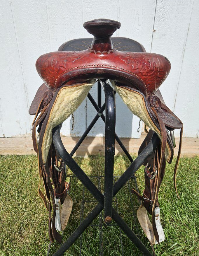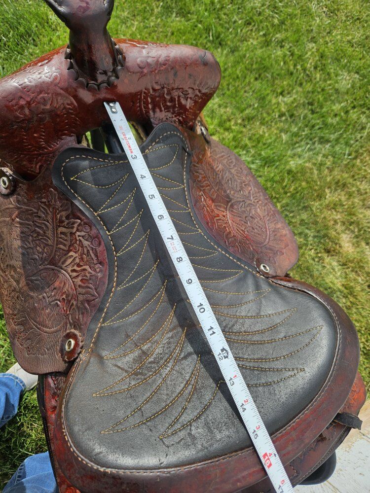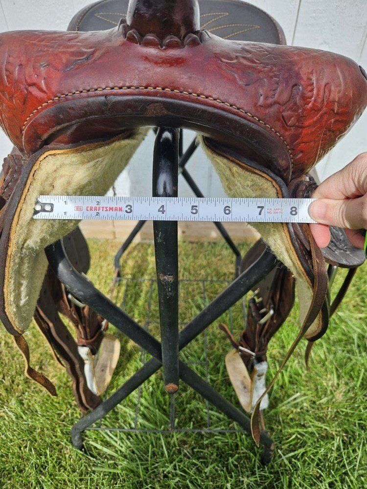 15.5" saddle. 7.5" gullet. Just cleaned and oiled so it's ready to go! Text is best