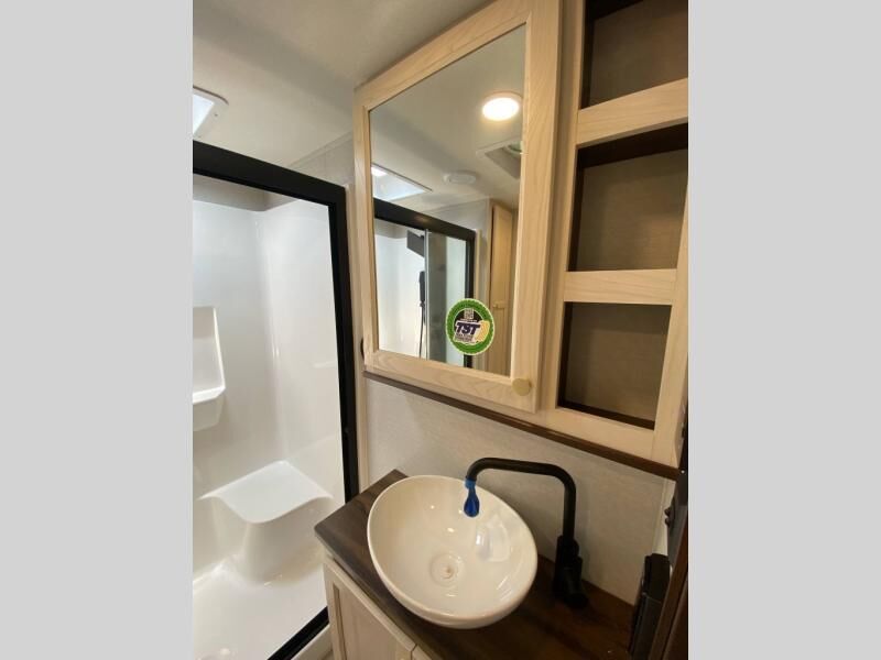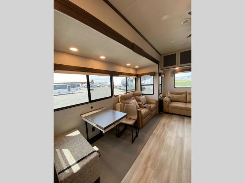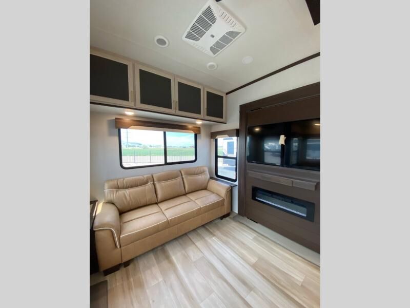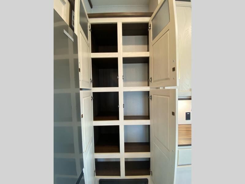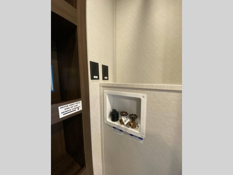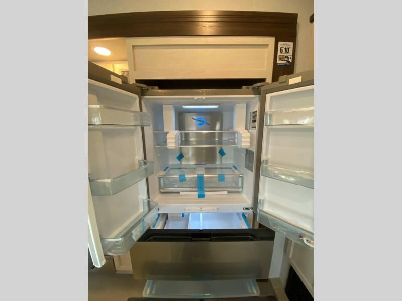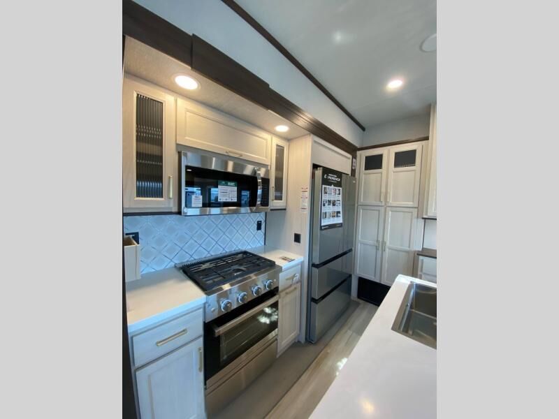 You will love this Cedar Creek Experience fifth wheel! The front bedroom is spacious with a king bed and a wardrobe that keeps on going, with room for hanging garments, shelves, and washer/dryer prep. There's also a standalone dresser with a TV above so you can watch some shows before bed. The bathroom also offers space efficiency with a sliding glass door, and the roomy shower even has a seat for your convenience while bathing. The rear of this unit feels wide open with a lovely living area and kitchen. The kitchen rivals the one at home, with a three-burner cooktop, microwave, and 18 cu. ft. 12V refrigerator with an ice maker. And check out the Murphy pantry that is hidden behind the entertainment center! You'll have tons of storage space with overhead cabinets and a pantry. The kitchen island with a spacious sink is the perfect final touch. After you eat you can relax and watch TV on the power theater seats or the hide-a-bed sofa. There is also a wall mounted dining table and extension with an ottoman for more seating space!