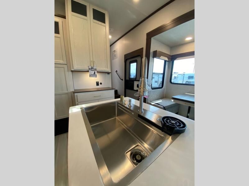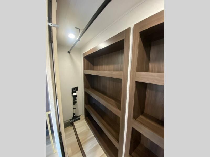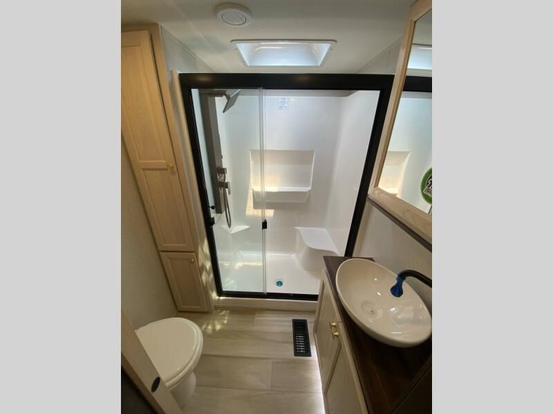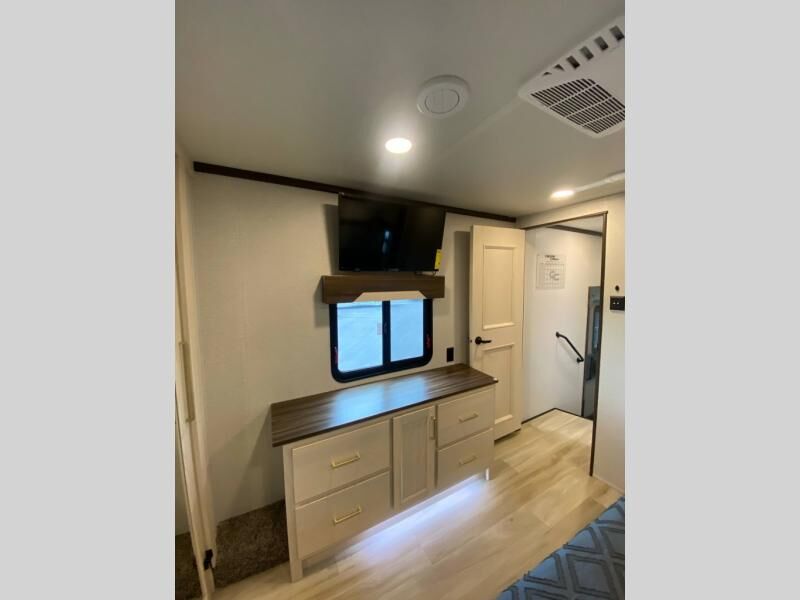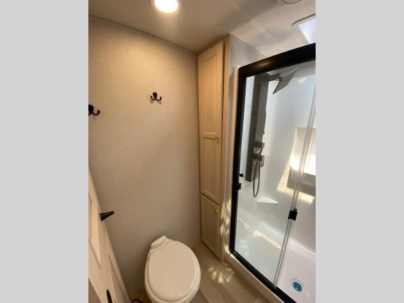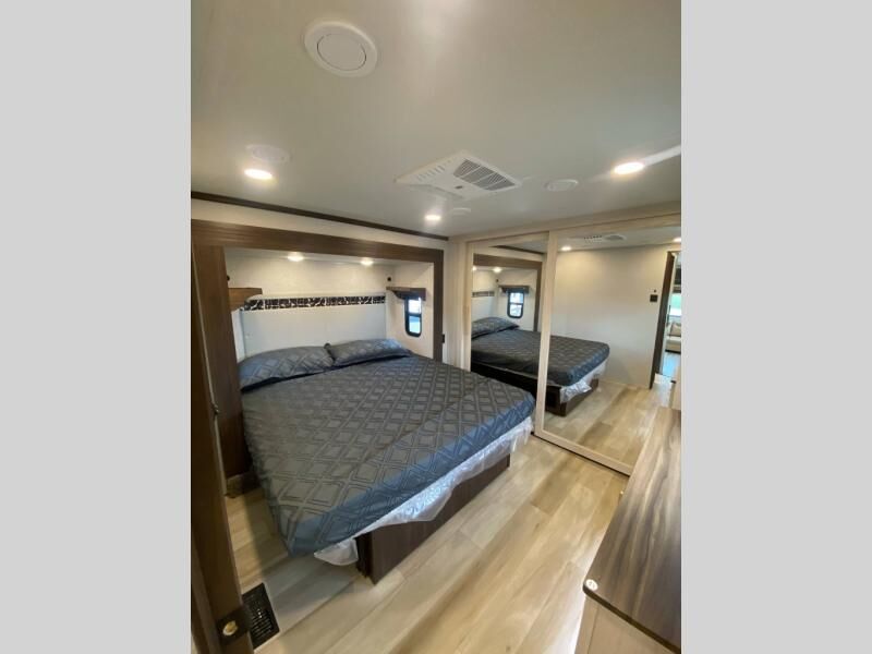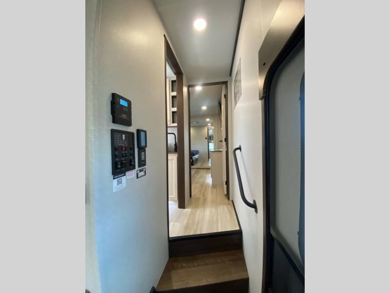 You will love this Cedar Creek Experience fifth wheel! The front bedroom is spacious with a king bed and a wardrobe that keeps on going, with room for hanging garments, shelves, and washer/dryer prep. There's also a standalone dresser with a TV above so you can watch some shows before bed. The bathroom also offers space efficiency with a sliding glass door, and the roomy shower even has a seat for your convenience while bathing. The rear of this unit feels wide open with a lovely living area and kitchen. The kitchen rivals the one at home, with a three-burner cooktop, microwave, and 18 cu. ft. 12V refrigerator with an ice maker. And check out the Murphy pantry that is hidden behind the entertainment center! You'll have tons of storage space with overhead cabinets and a pantry. The kitchen island with a spacious sink is the perfect final touch. After you eat you can relax and watch TV on the power theater seats or the hide-a-bed sofa. There is also a wall mounted dining table and extension with an ottoman for more seating space!