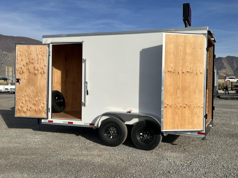 Stock #: SL3938 Trailer Specs: Color: White .030 Bonded Aluminum Overall: Length: 17'10" Width: 8'6" Height: 9'0" Interior/Bed: Length: 14' Box + V-Nose Width: 6'8" Height: 7'0" Door/Ramp: Rear Barn Door (Width: 72" x Height: 80") Weight: 2,421 lbs. | GVWR: 11,464 lbs. | Payload: 9,043 lbs. Axle(s): 5,200 lb. Lippert Spring Electric Axle w/ EZ Lube Hubs Tire/Wheel: ST225/75R15 | Load Range C Coupler: Type: Bumper Pull | Size 2 5/16" | 7-Way 12V Connector 16" OC Vertical Posts | 16" OC Crossmembers | 24" OC Tube Roof Bows Standard Features: HSS Structural Tubing Steel Frame Side Man Door (28" wide x 77" tall) 3/8 Plywood Interior Walls 3/4" Plywood Floor Enclosed Wiring Interior Lights w/ Wall Switch Automotive Style Undercoating 24" Diamond Plate Rock Guard Electric Breakaway Kit Side Cross Flow Vents Aluminum Diamond Plate Fenders Common Addons: Wall Mounted Spare Tire 10 ft. E-Track Stick Recessed 2,500# D-Ring Additional Colors Available Call for Availability WASATCH TRAILER SALES - LARGEST TRAILER SELECTION IN UTAH Springville: (801) 528-1581 | 1180 S 2000 W, Springville UT, 84663 View More Inventory: www.wasatchtrailer.com
