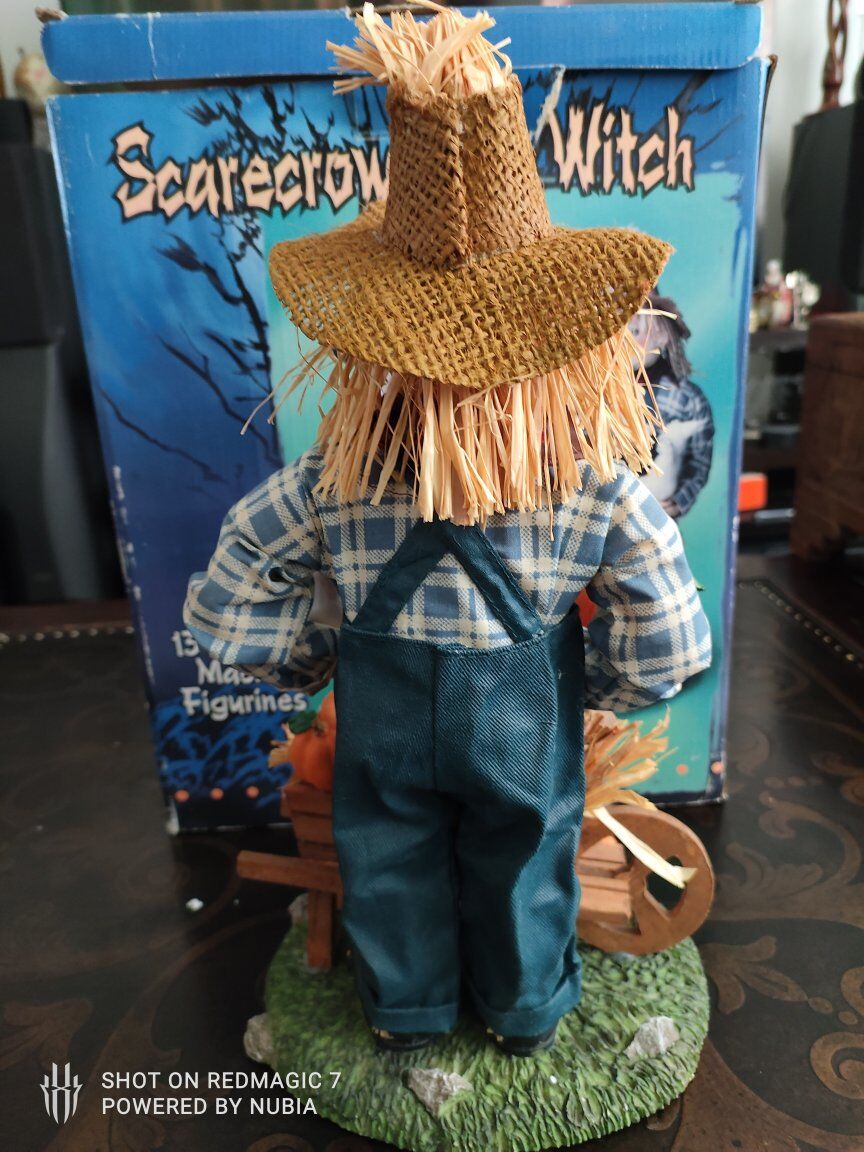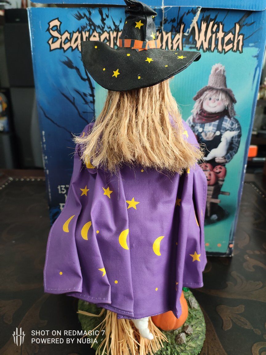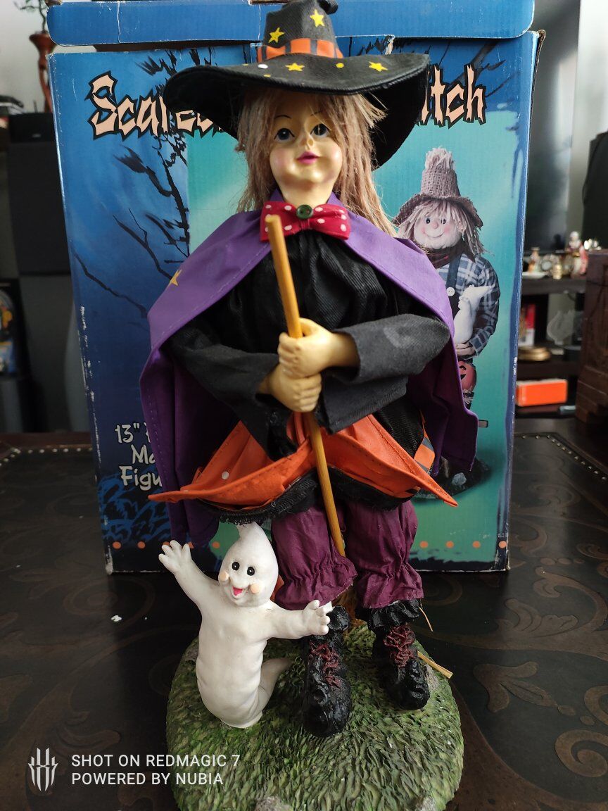 13" fabric mache figures scarecrow and witch 🧹 in great condition and shape,came with box . beautiful set for Halloween decorations.
