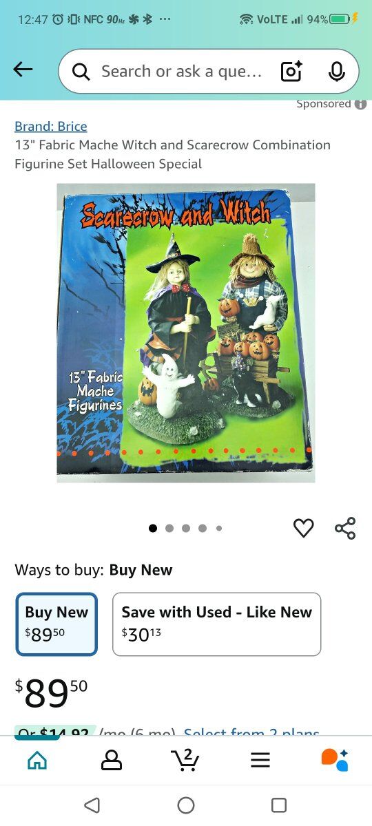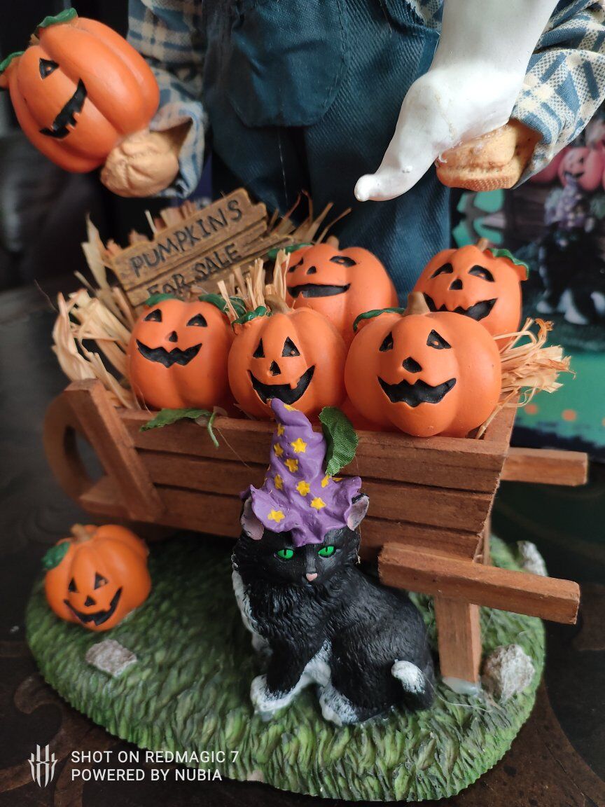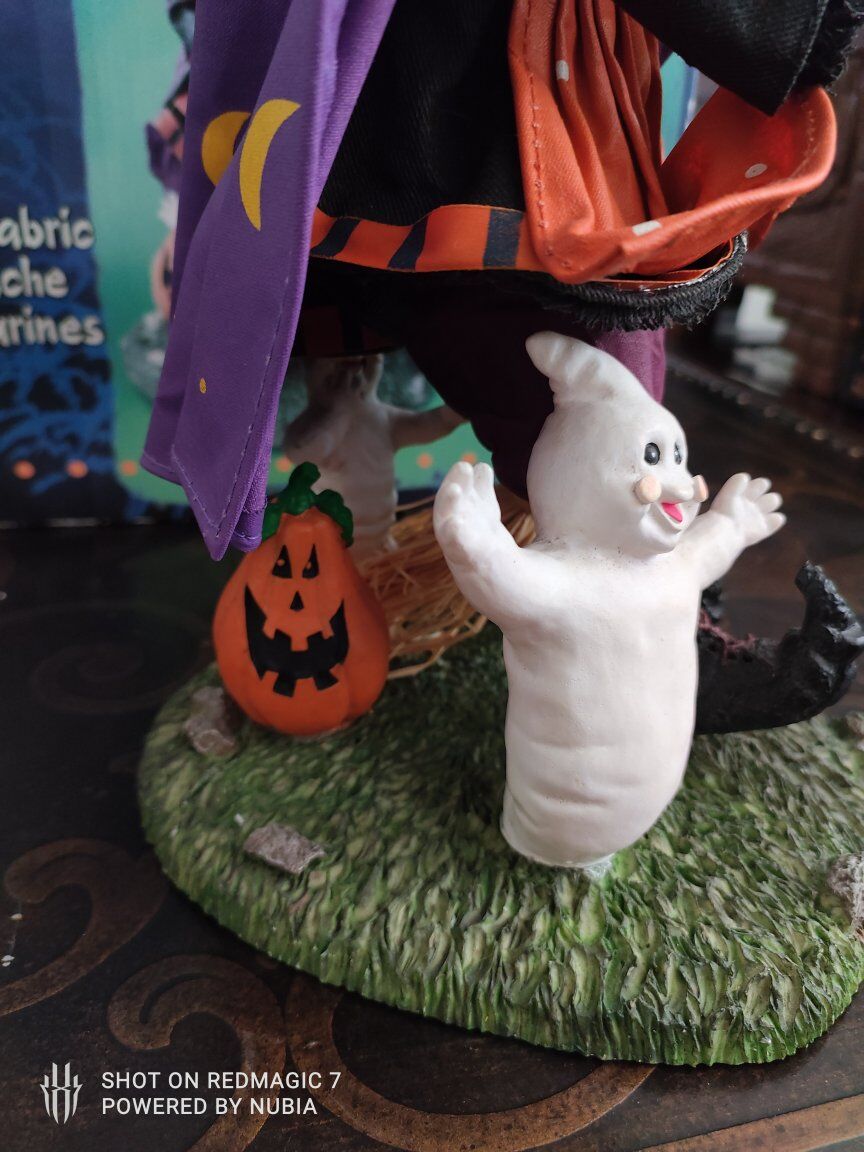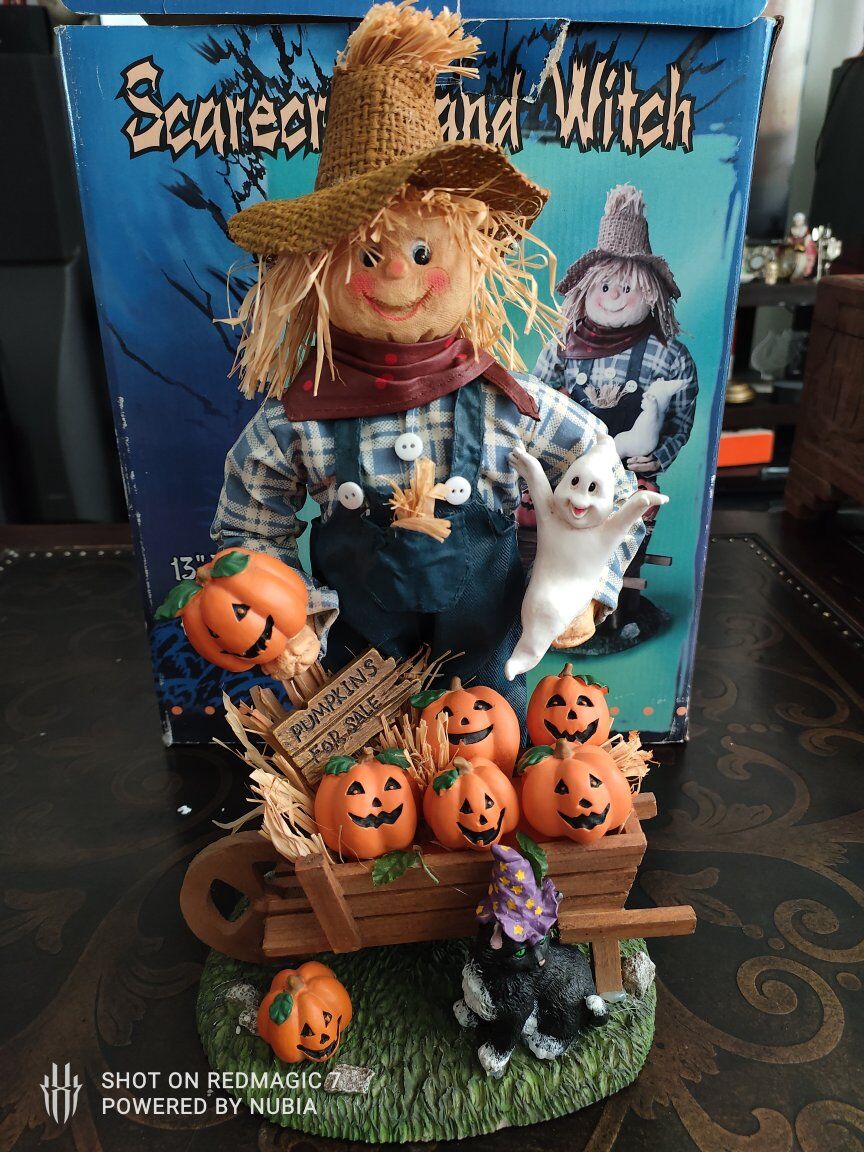 13" fabric mache figures scarecrow and witch 🧹 in great condition and shape,came with box . beautiful set for Halloween decorations.