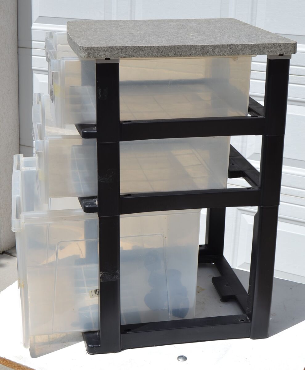 Storage bin/table 16" x 16" x 25" ,top 2 drawers 5" deep, bottom drawer will hold hanging file folders, has wheels to make it a roll-around