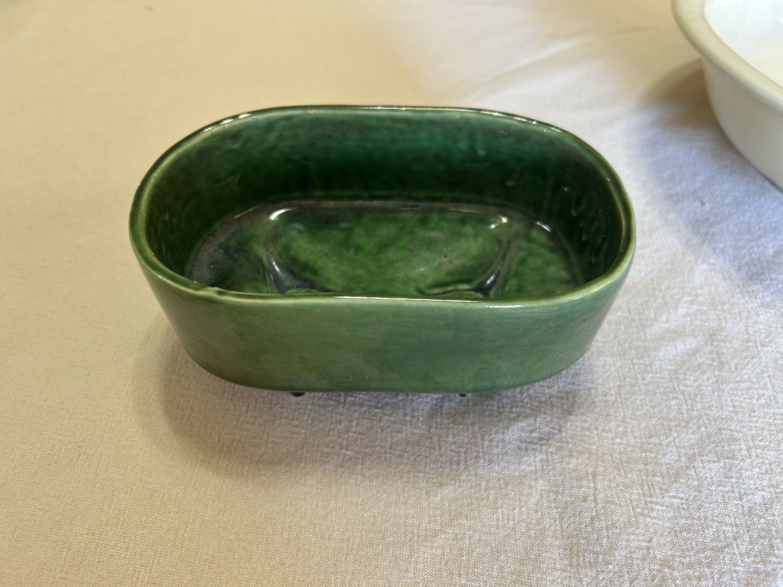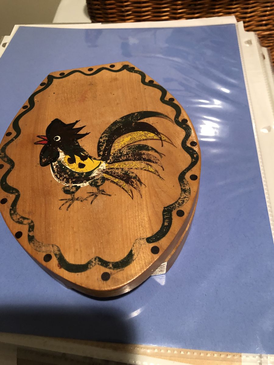 5" x 11" round metal cover for cake taker, saver; green with black details, from the 1920-30"s. cover only no bottom, green from that time period, $15 for cover, Mc Cormick distilling and bottling plant in Weston, MO, Platt valley corn whiskey jug with lid like new condition $45, glass flower frog $5, glass insulator $4, vintage sewing book $5, vintage wood hamburger press $5, 2 sets of Sant cola tins $6, , small McCoy planter about 4" wide, likenew condition green $12, blue spongeed loaf pan $10, wood hamburger press $5, wood tool box with drill bits, etc inside from grndpa's barn