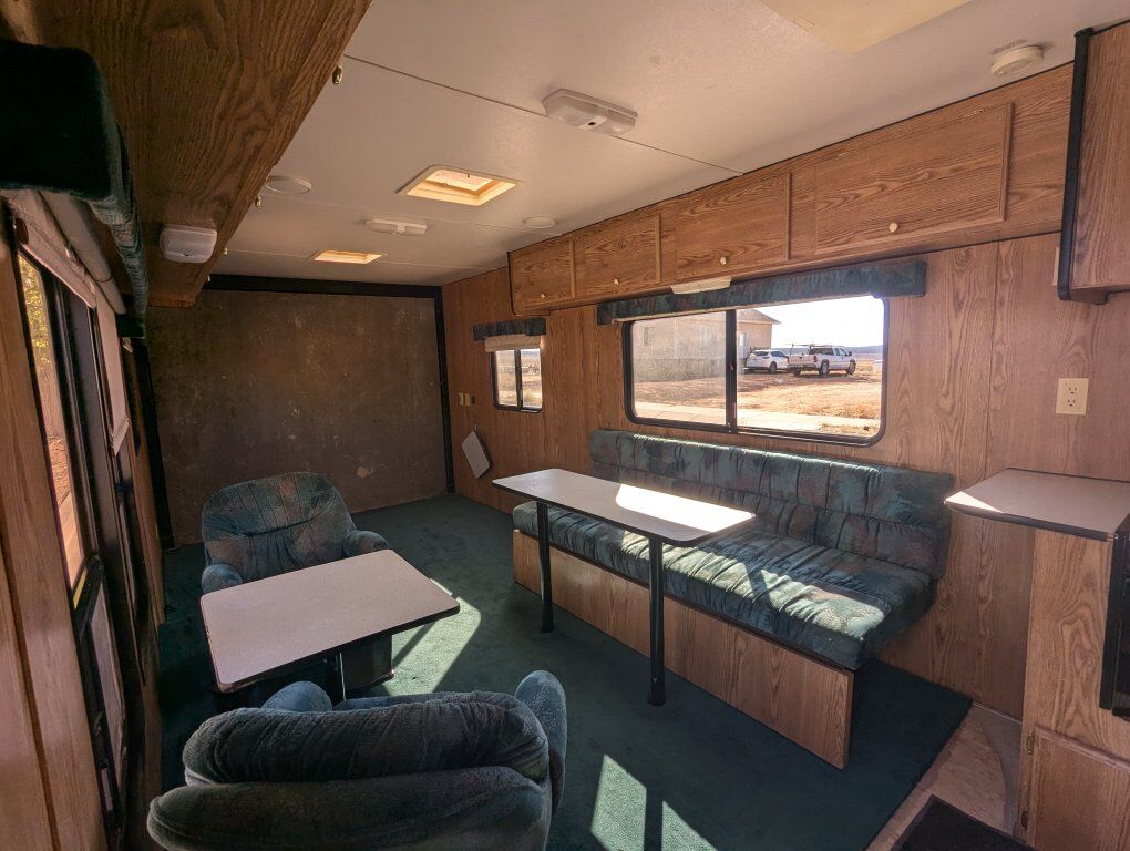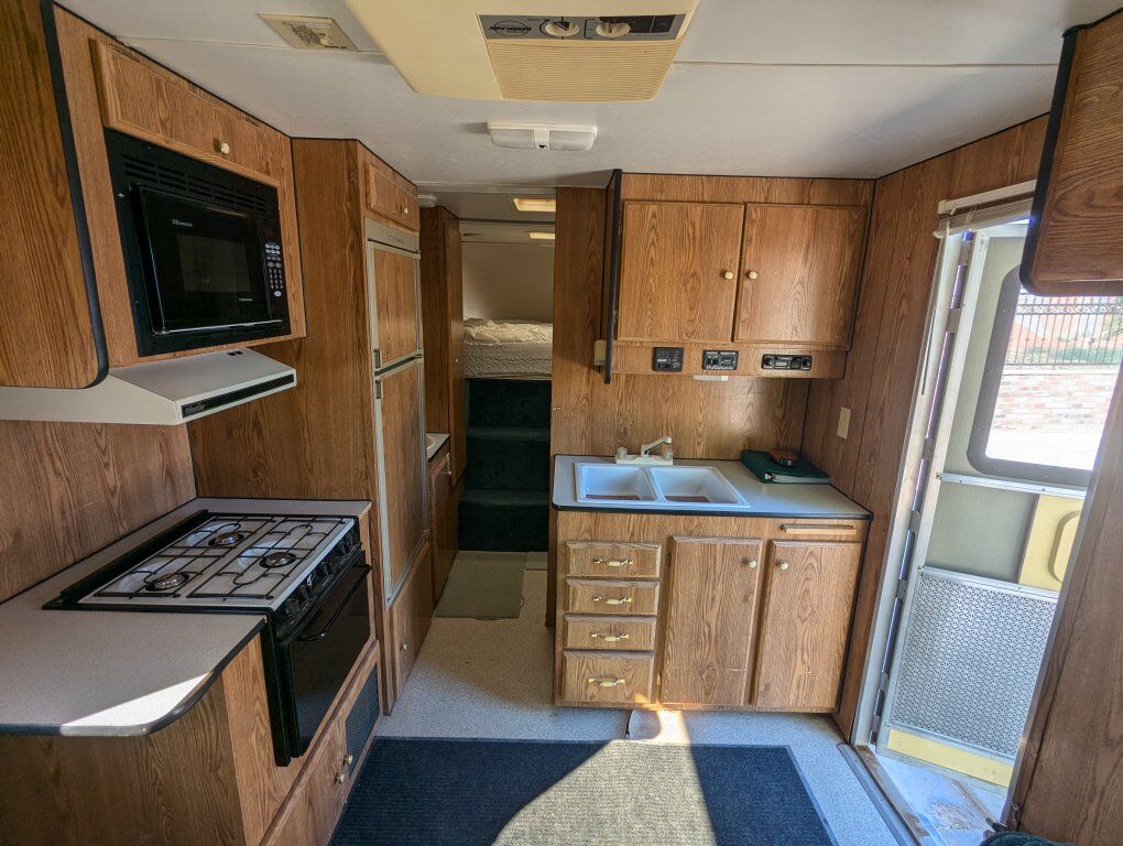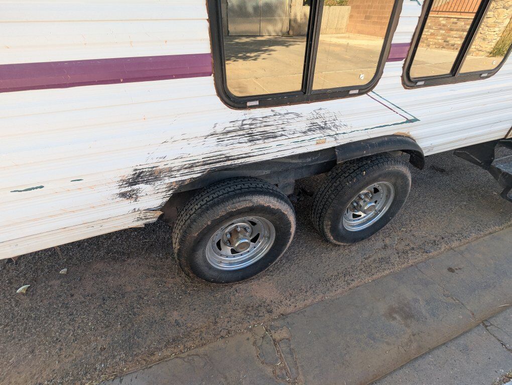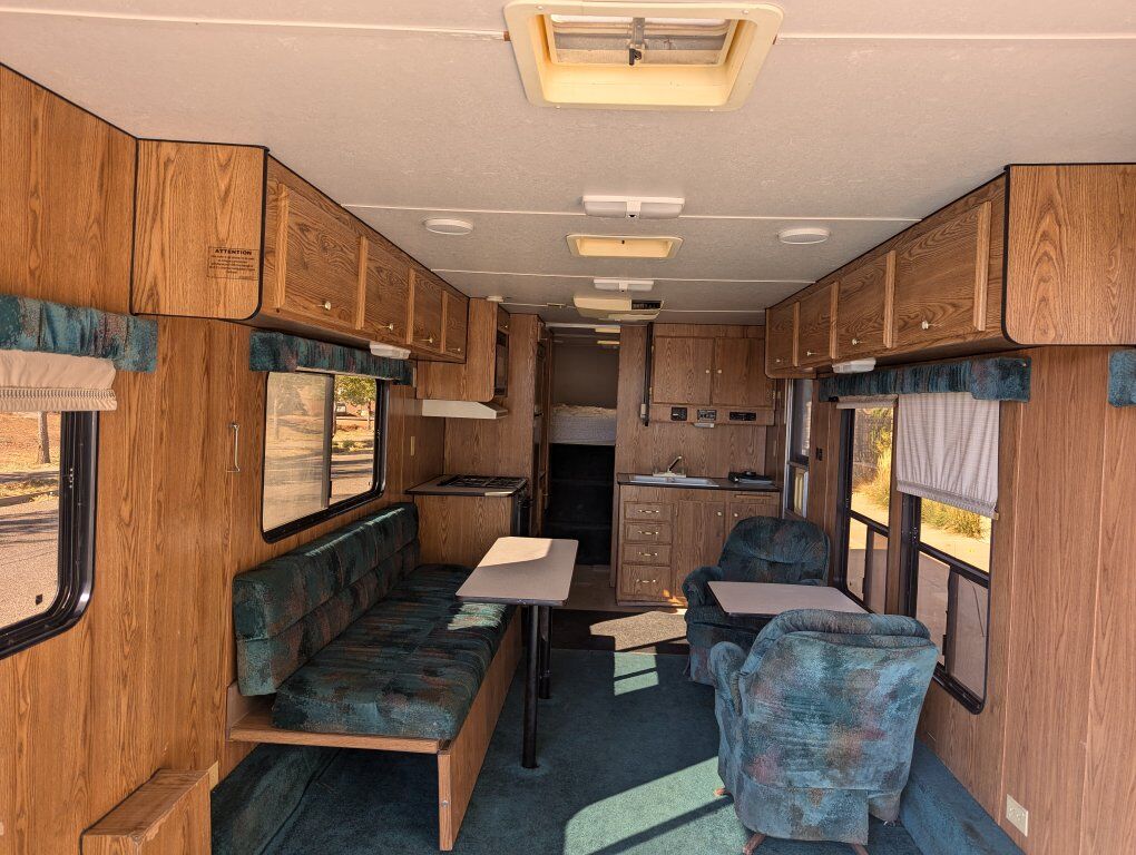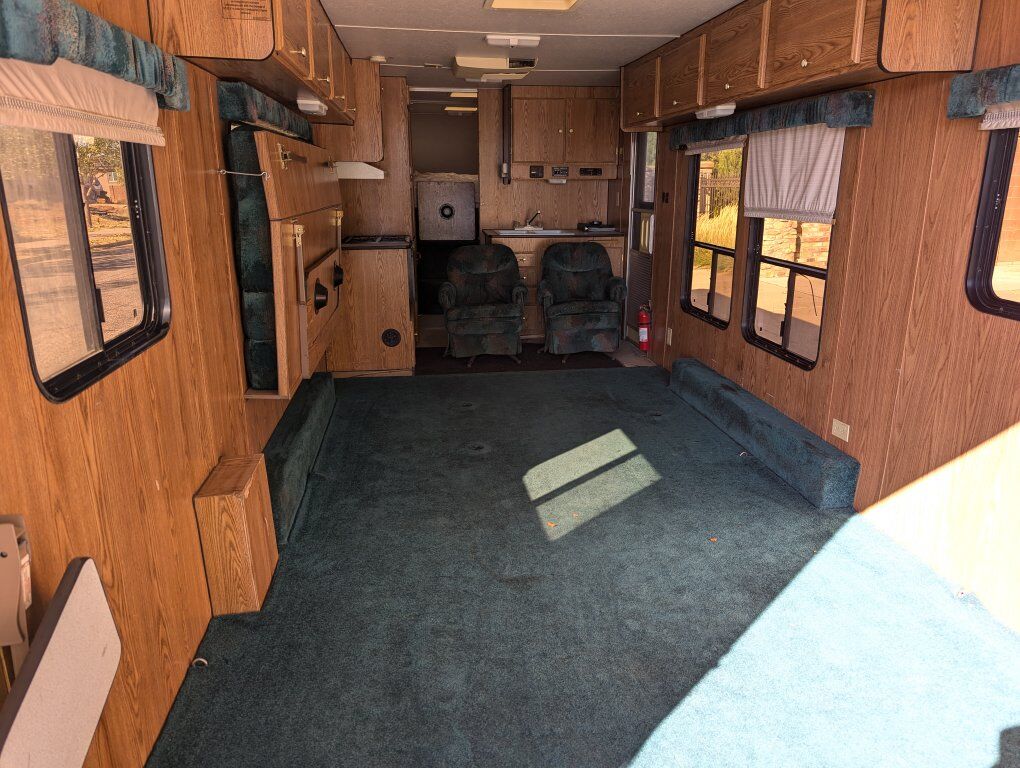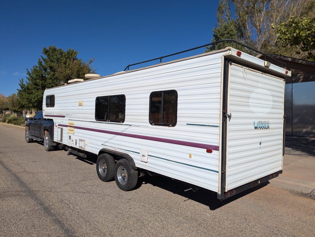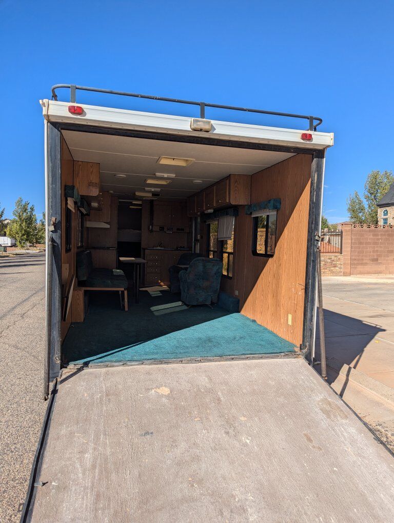 1997 Weekend Warrior Toy Hauler. We have owned it for about 20 years and basically used only once a year to go the sand dunes. We got a newer Toy Hauler and haven't used this one since. The garage is 14'10 to the cabinet and 6'8 in the skinniest spot. We used it to haul a Sand Rail but it would fit 4 seat Can am Maverick X3, Maverick R, Polaris RZR, Pro R. It comes with 3 spares but the tires on it are Hercules brand and have much more life in them. The shower and sinks worked when we parked it several years ago. The generator would start but it stays at full rev instead of idling down, so we would bring a generator to plug it into. The linoleum is peeling up in the kitchen area underneath the black rug. We had a blowout that took part of the fender off and blackened the side. The leaf springs were replaced several years ago by a professional shop. The couch folds out to a bed and we put a blow mattress in the back of the trailer. If interested please call or text 434-703-3576. This has been good to us but it is ready for a new home. Would be willing to consider offers.