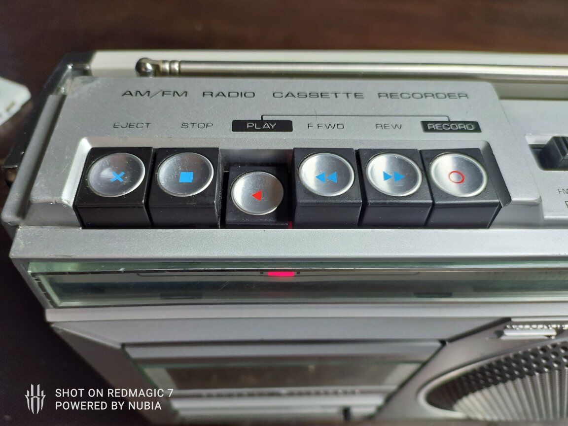 Item has been tested and does work. . The cassette player does work, No staticky sound on the volume or power switch The record buttons do depress appropriately but I was unable to test the recording feature as I do not have a blank tape.