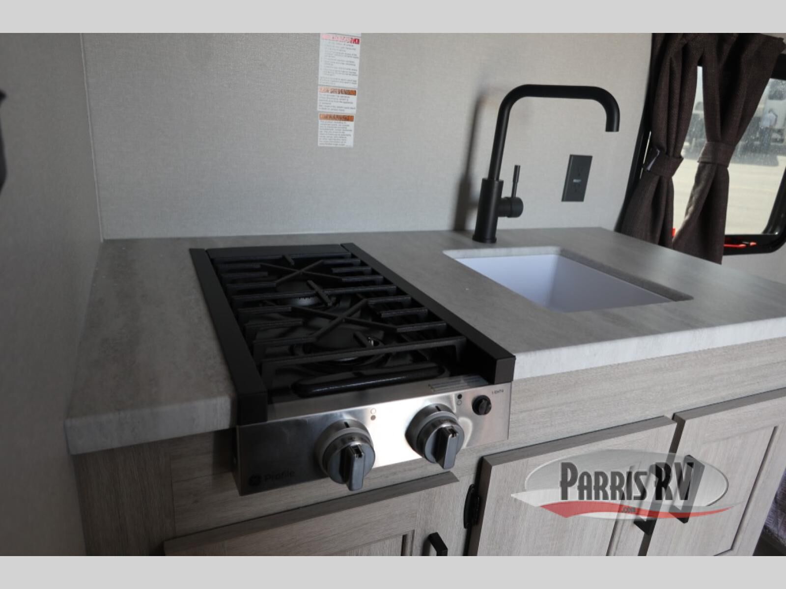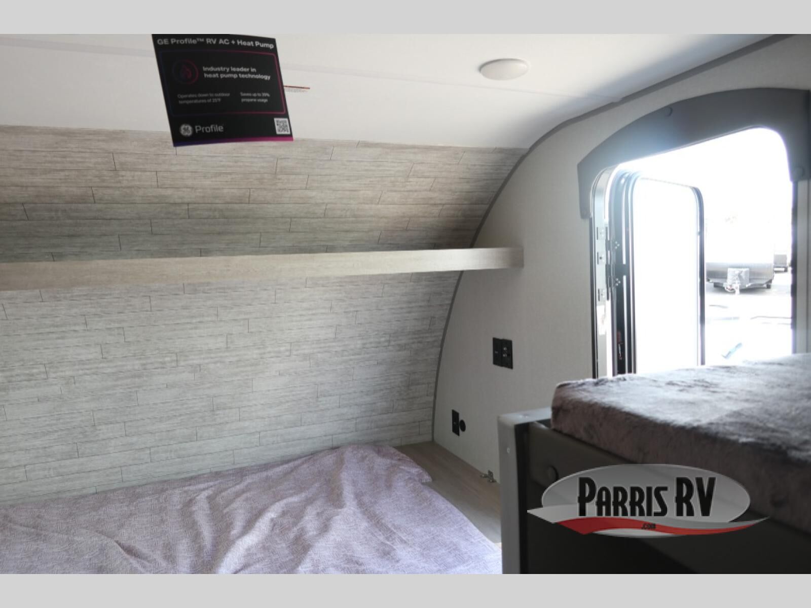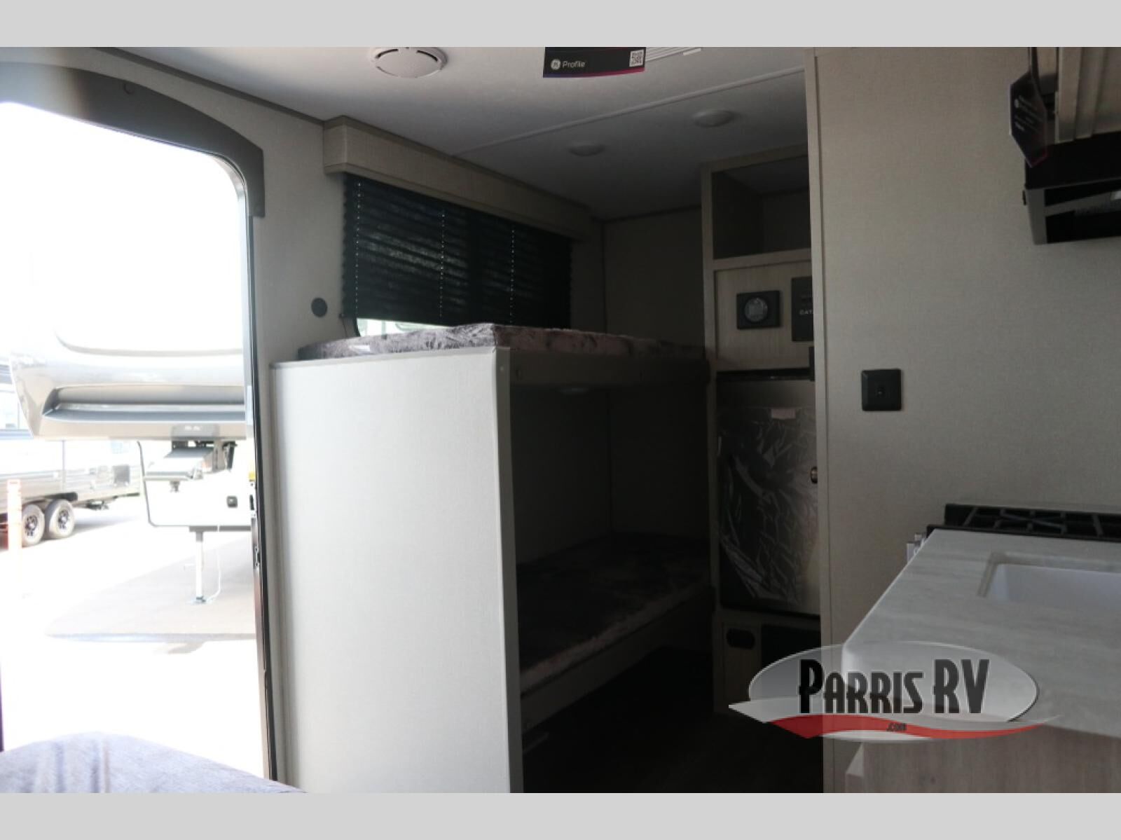 Lightweight camping is easier than you think with this travel trailer in tow! The front 54" x 74" queen bed will provide a great night's rest each night, while the little ones or your guests take the bunk beds. There is a handy shelf above the front bed for your belongings plus additional bedroom storage. A private bath includes a 24" x 32" shower and a toilet with a mirror behind it so you can freshen up each day. You'll also find a two burner cooktop and microwave oven to make meals each day plus a 3.3 cu. ft. 12V refrigerator for food storage!