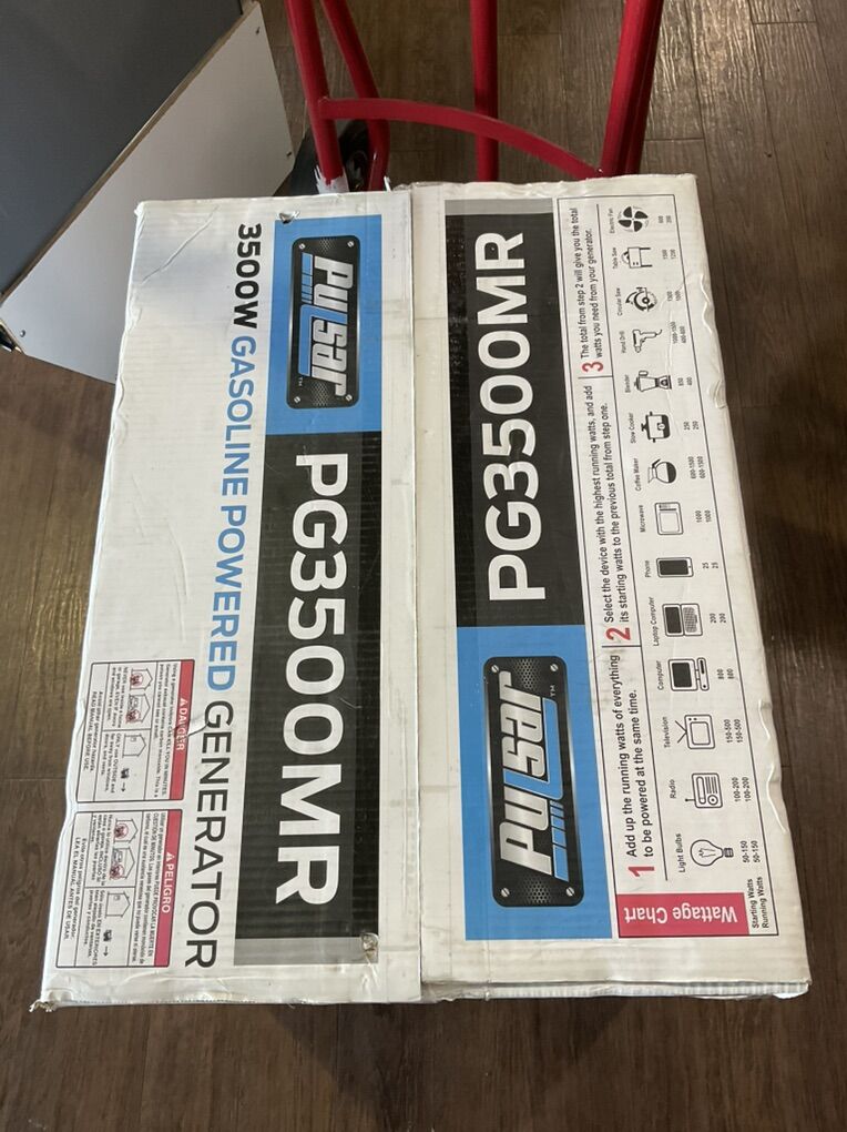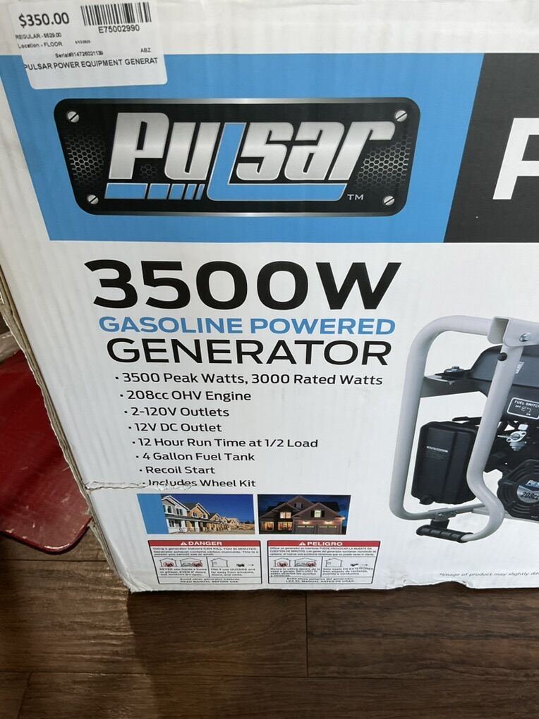 Pulsar PG3500MR -3500W gasoline powered generator for sale.3500 peak watts,3000 rated watts,208cc OHV engine,2-120V outlets,12V DC outlet,12 hour run time at 1/2 load,4 gallon fuel tank,recoil start.Asking 350.00 obo. 1946 west 5600 south Roy, Utah. 801-776-1122. #E75002990