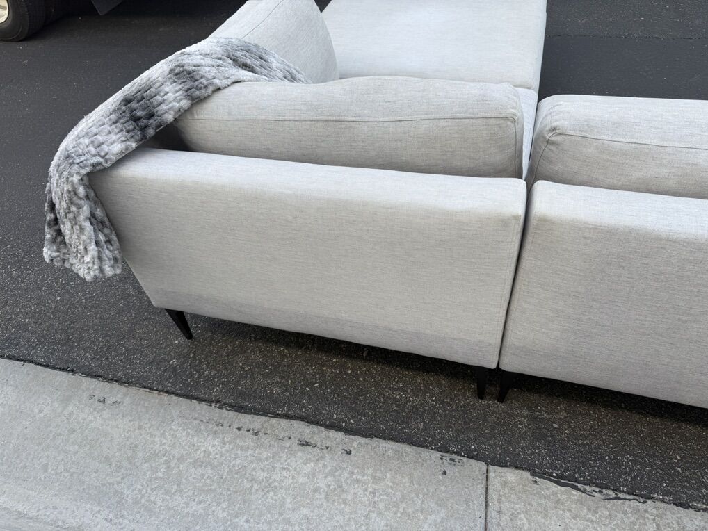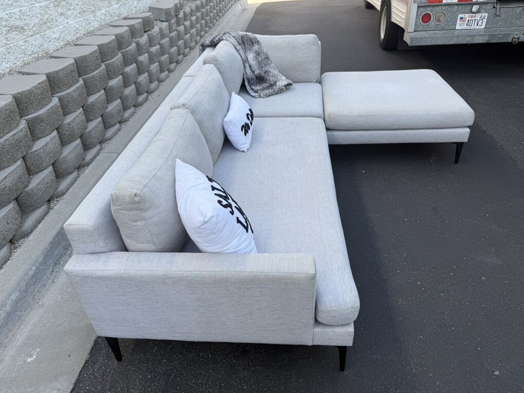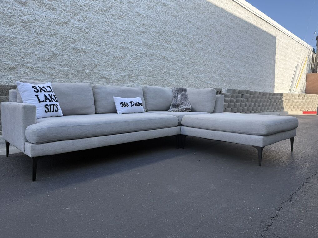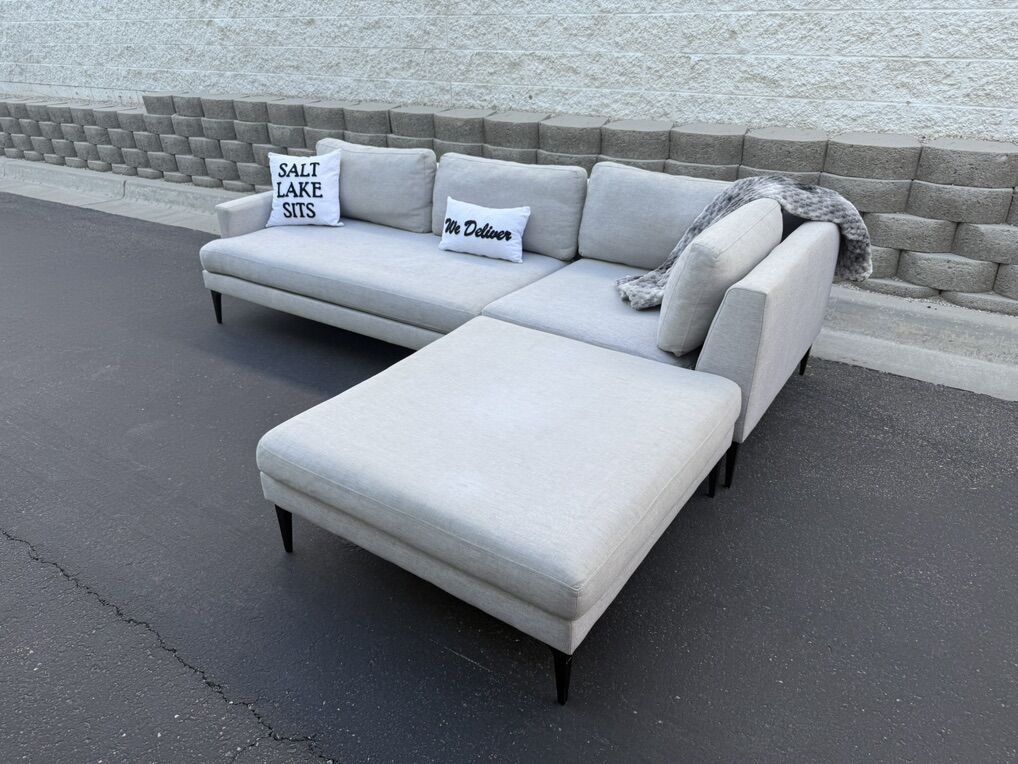Follow Us On Instagram: SaltLakeSits Retail Price: $4500 Your Price: $800 ️ West Elm Andes sectional in dove coastal performance linen with pewter-toned black metal legs. Sleek, modern silhouette with wide track arms and a deep, spacious chaise. Upholstery is soft, durable, and easy to maintain. excellent condition throughout. Stylish, comfortable, and built to last. 🫧 Cleaned 🫧 Dimensions: 107” x 80”