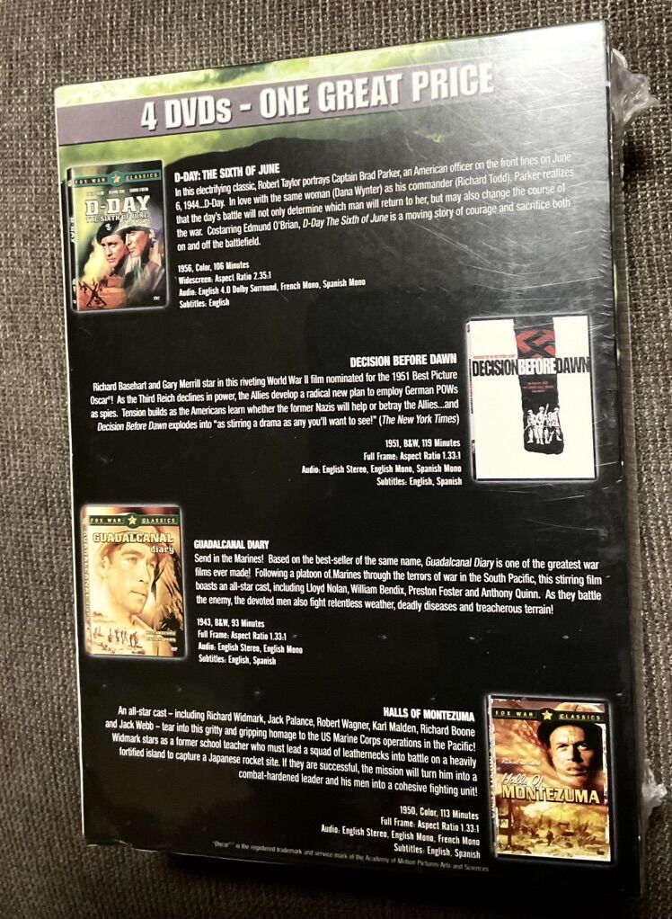 GUADALCANAL DIARY: Wartime account of the Marine invasion of the Solomon Islands during WWII. Clearly intended to bolster home-front morale, but the better-than-average cast of tough guys and the proximity of the release to the events themselves give the action an added urgency.DECISION BEFORE DAWN: At the close of WWII, German defeat is almost within Allied grasp and many Germans are defecting, offering their services as spies behind German lines. Col. Devlin is not taken in by their wiles, but there is one prisoner whose claims seem genuine, and he decides to send Karl Maurer (Oscar Werner) on a dangerous, top-secret mission. Will he prove trustworthy, or will he negate all that the Allies have gained so far? Klaus Kinski (AGUIRRE, WRATH OF GOD; MY BEST FIEND) appears in a cameo.HALLS OF MONTEZUMA: Richard Widmark stars as Lt. Carl Anderson, a tough Marine officer who has been ordered to take a patrol and capture prisoners who must be interrogated about a Japanese experimental rocket-launching facility in the Pacific Islands. His platoon is split between weary veterans like Lt. Gilfilan (Richard Boone) and Pidgeon Lane (Jack Palance), and nervous recruits such as Coffman (Robert Wagner) and Cpl. Stuart Conroy (Richard Hylton). Despite his own ailments, Anderson must motivate this group of individuals to work as a unit.D-DAY: THE SIXTH OF JUNE: Hollywood once again looks back at the undeniably compelling story of D-Day, this time through the device of two officers, one American and one British, facing the coming battle and recalling their love for the same woman. The movie is full of solid battle sequences, but the atypical plot is the hook. Please take a look at my other listings