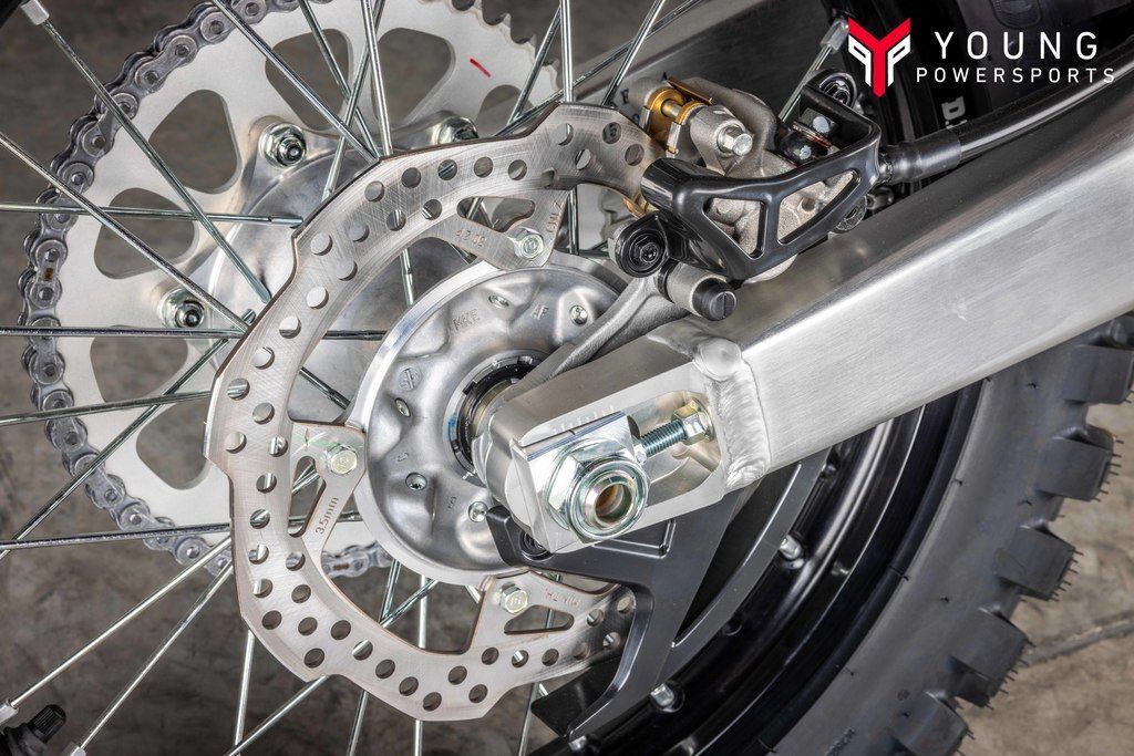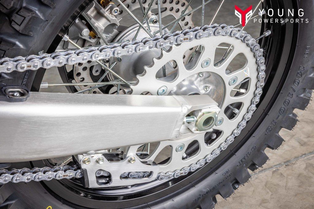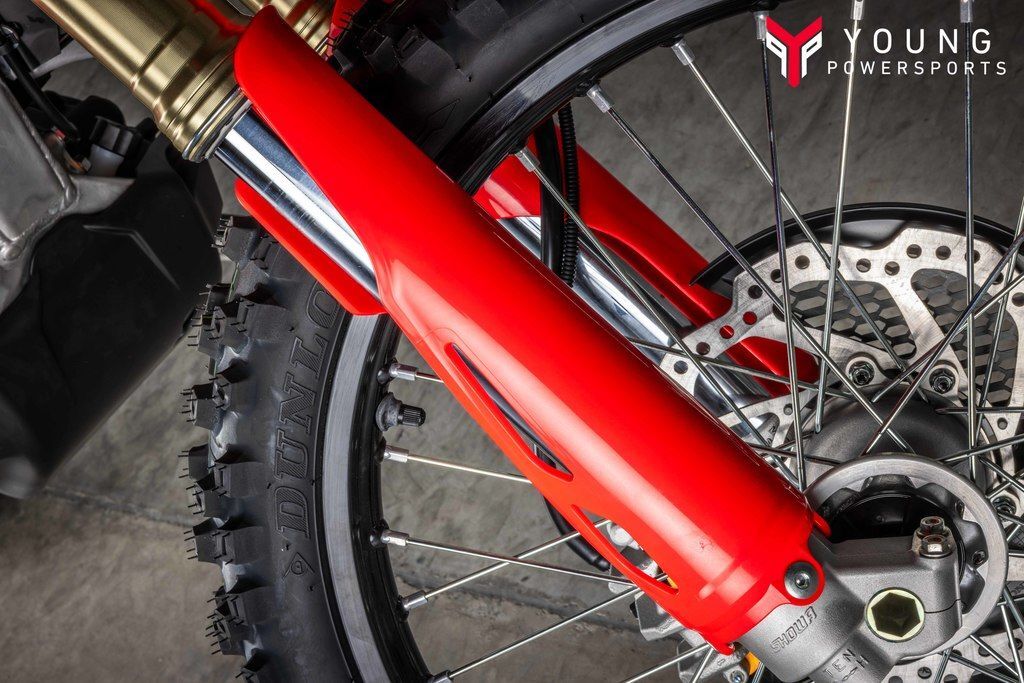 The CRF450RX’s Dunlop Geomax tires are specially designed for Enduro use. The AT81 tires are spec’d at 21 inches for the front and 18 inches for the rear. You read that right: the CRF450RX rolls on an 18-inch rear wheel.