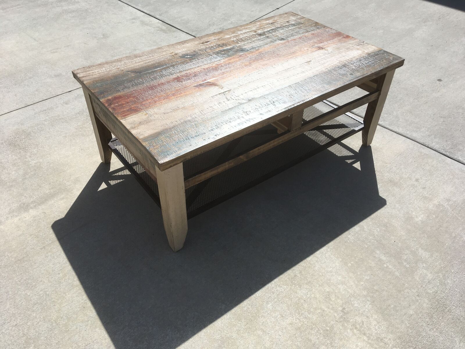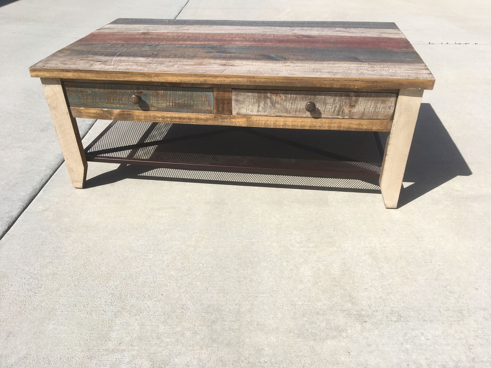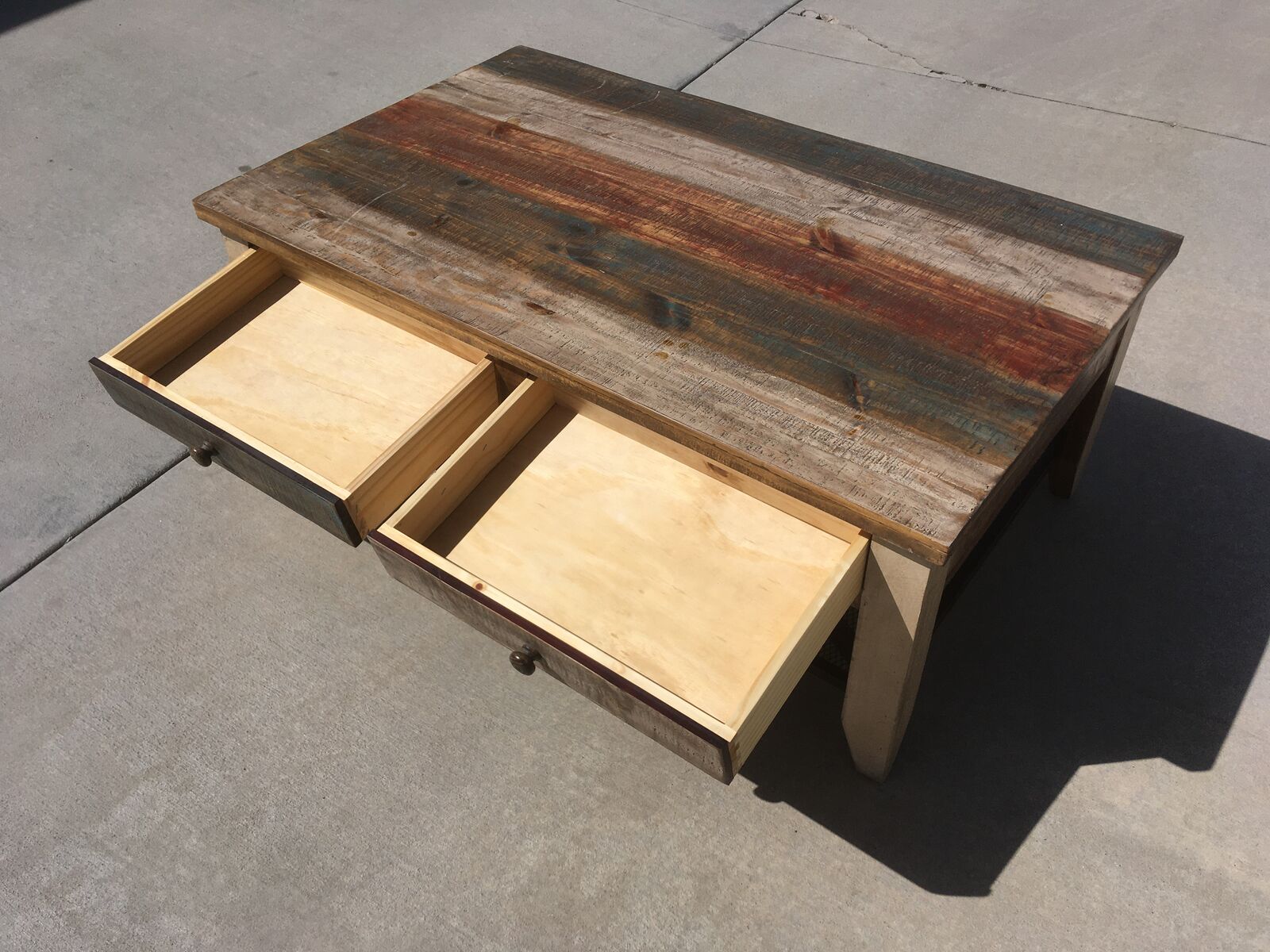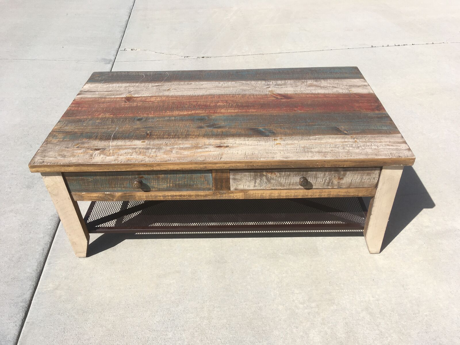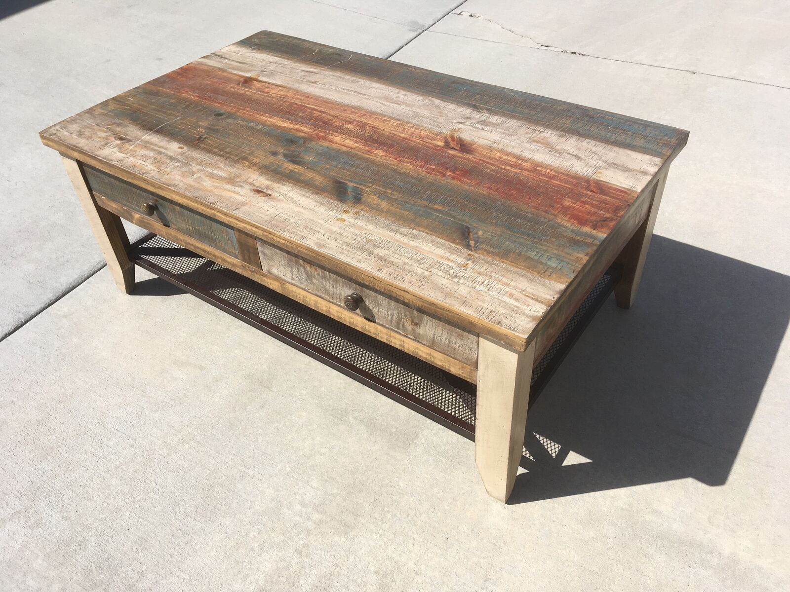 Multicolor striped distressed finish on hand-brushed wood. All tops are smooth and soft to the touch.