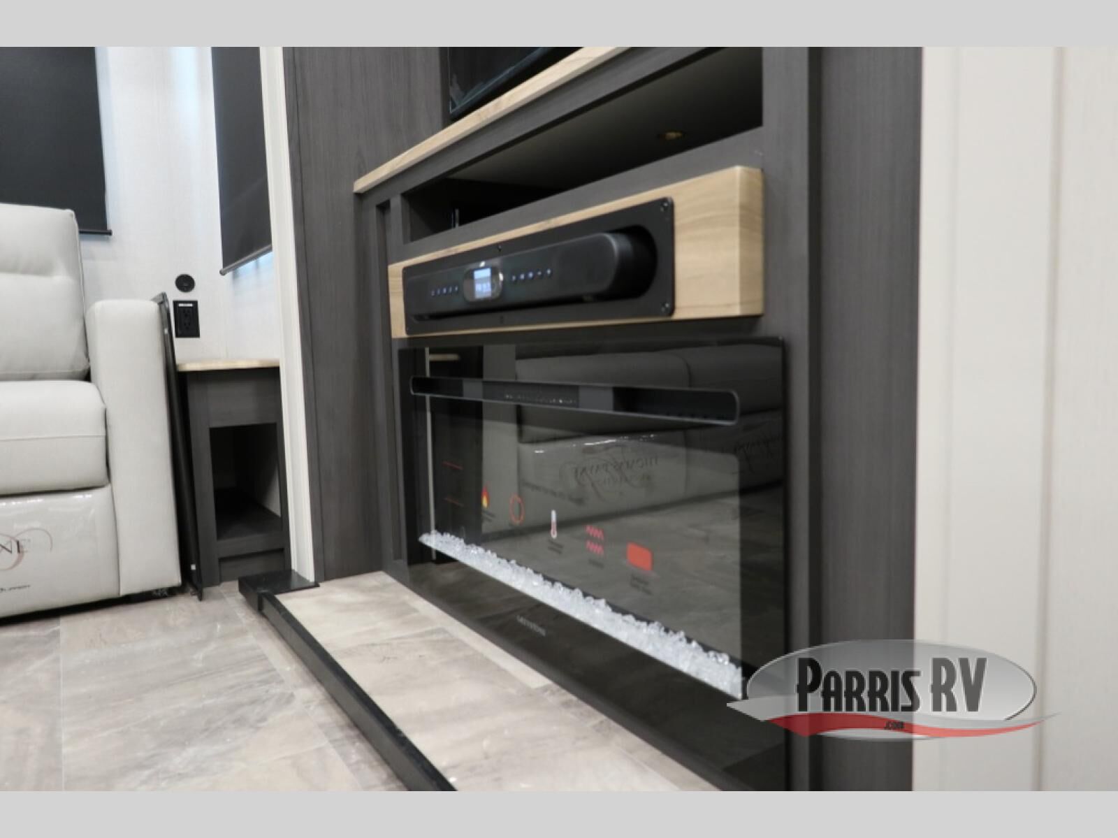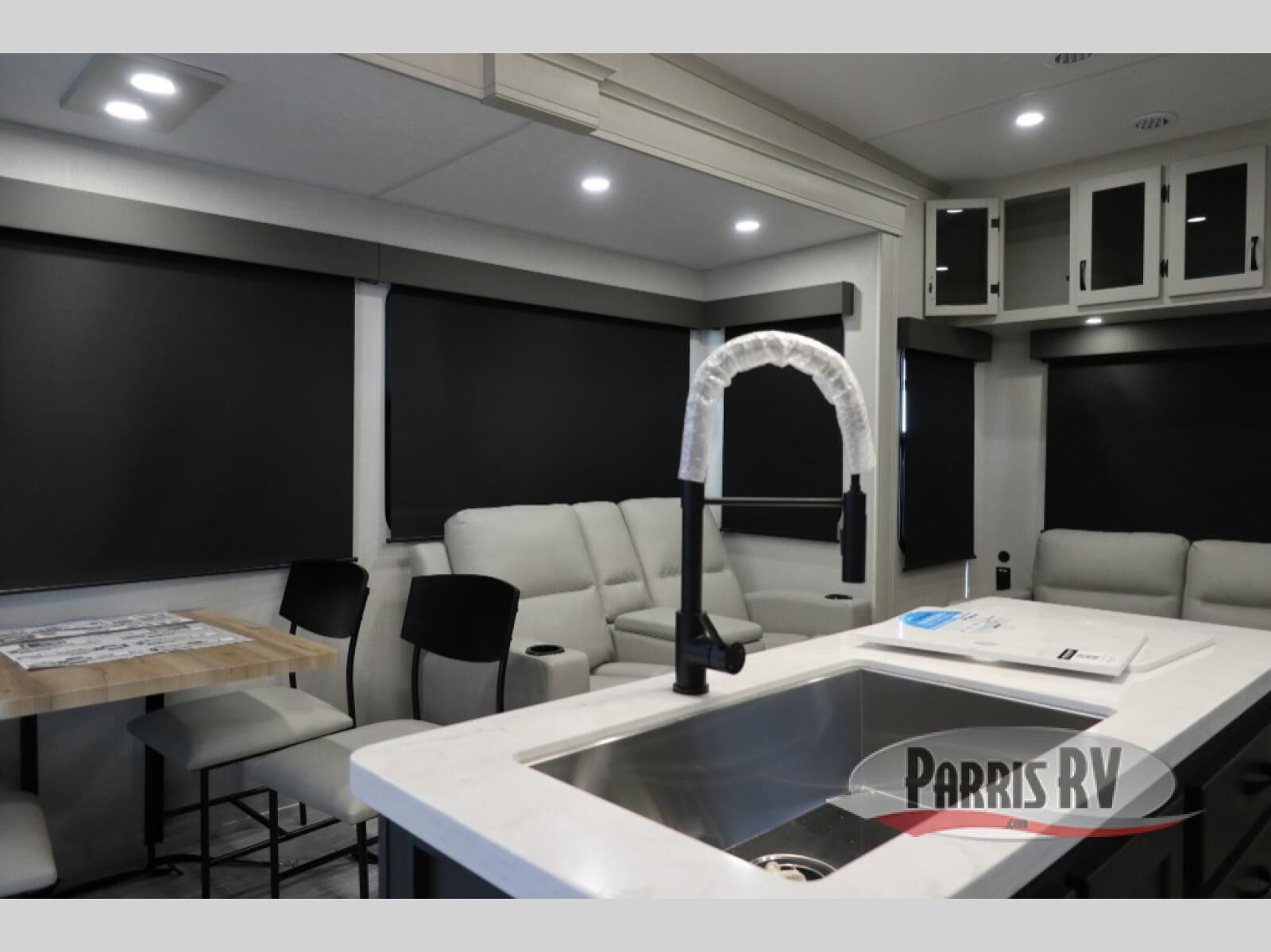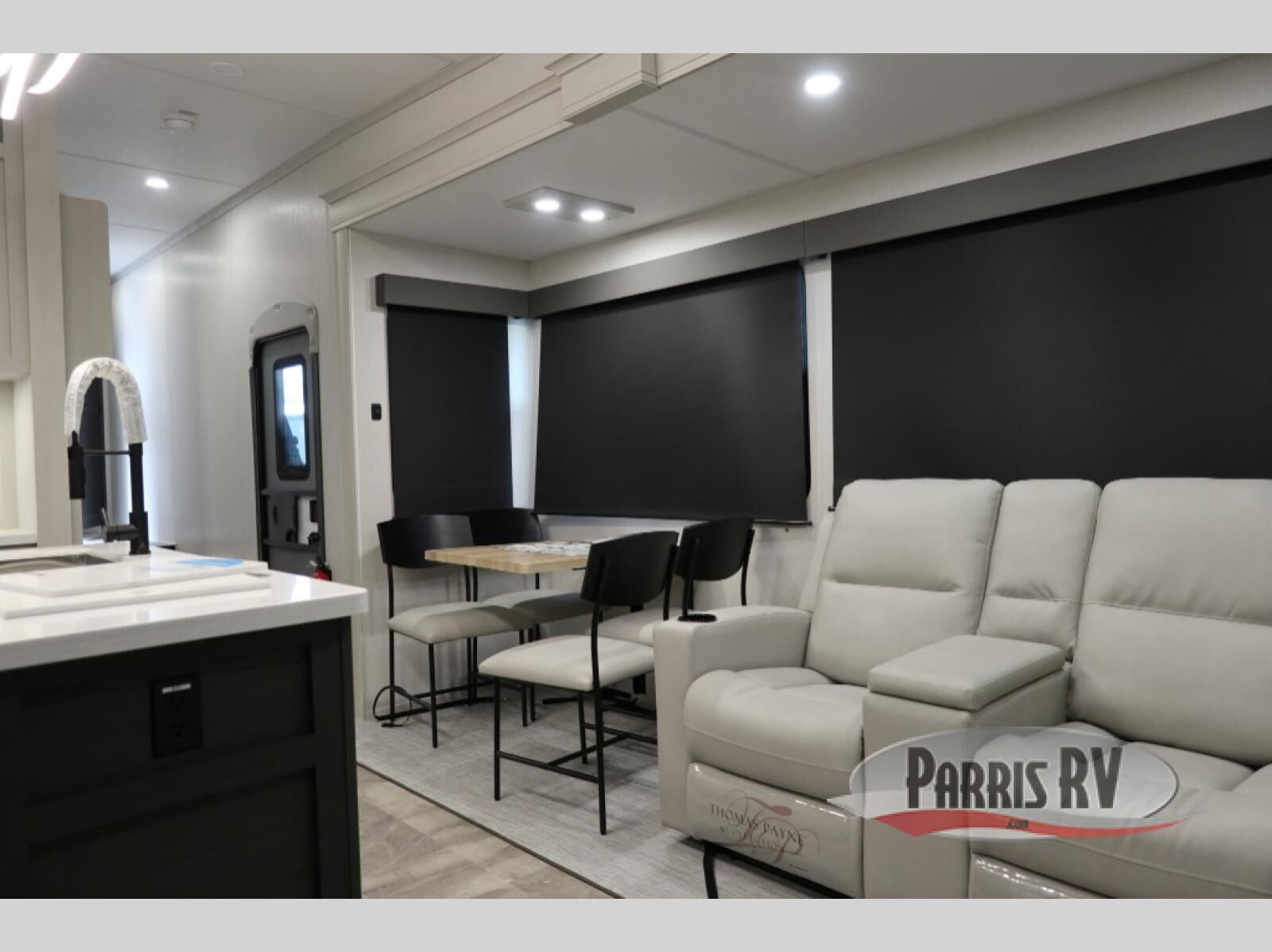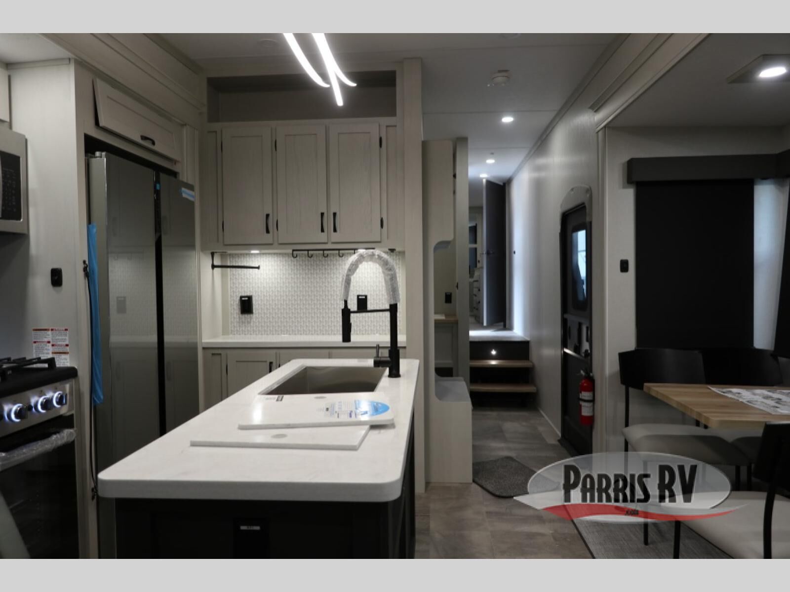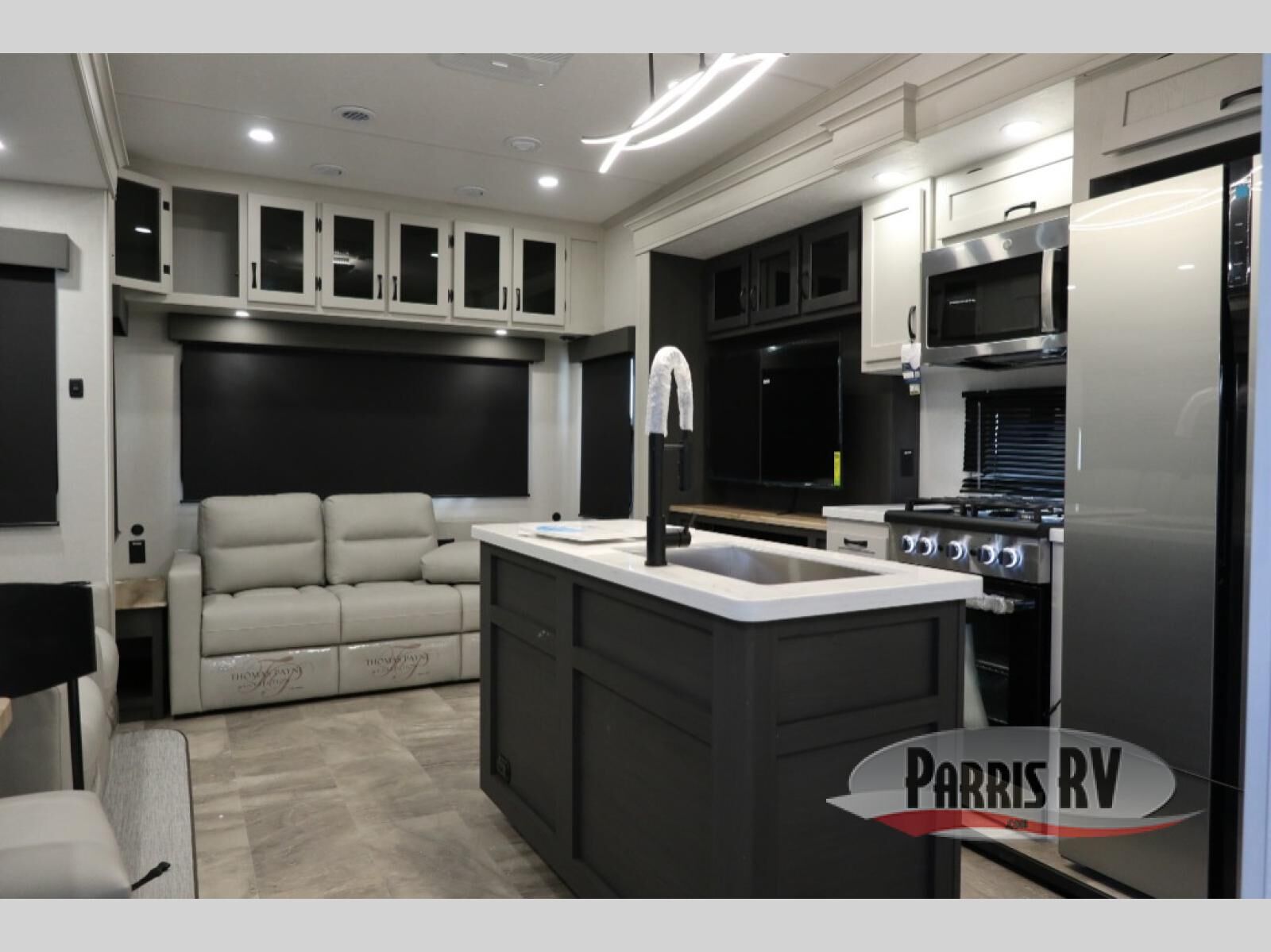 The rear living room is the perfect place to unwind, featuring a 78" trifold sofa, theater seating, overhead cabinets, and an entertainment center. Whether you're watching a movie, reading a book, or simply enjoying the company of loved ones, this room has everything you need to relax and recharge. The spacious kitchen is fitted with a kitchen island, refrigerator, microwave, free-standing table, hutch, and overhead cabinets. Perfect for preparing your favorite meals and enjoy with family. With a convenient coat bench, desk with flip-up storage, washer, and dryer, you'll have everything you need to stay organized and comfortable on the go. The full bathroom is an enormous oasis with a linen closet for added convenience. Also with a front bedroom featuring a king bed, dresser, shelves, and wardrobe, you'll have the perfect place to rest and recharge after a long day of adventure, also plenty of space for storing all your belongings and staying organized on the road.