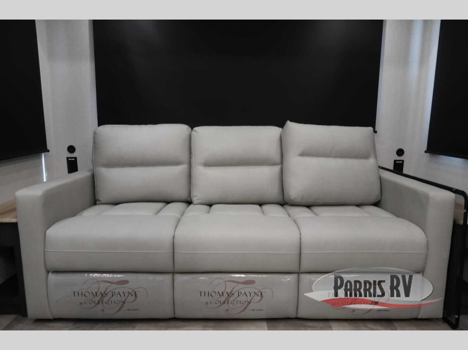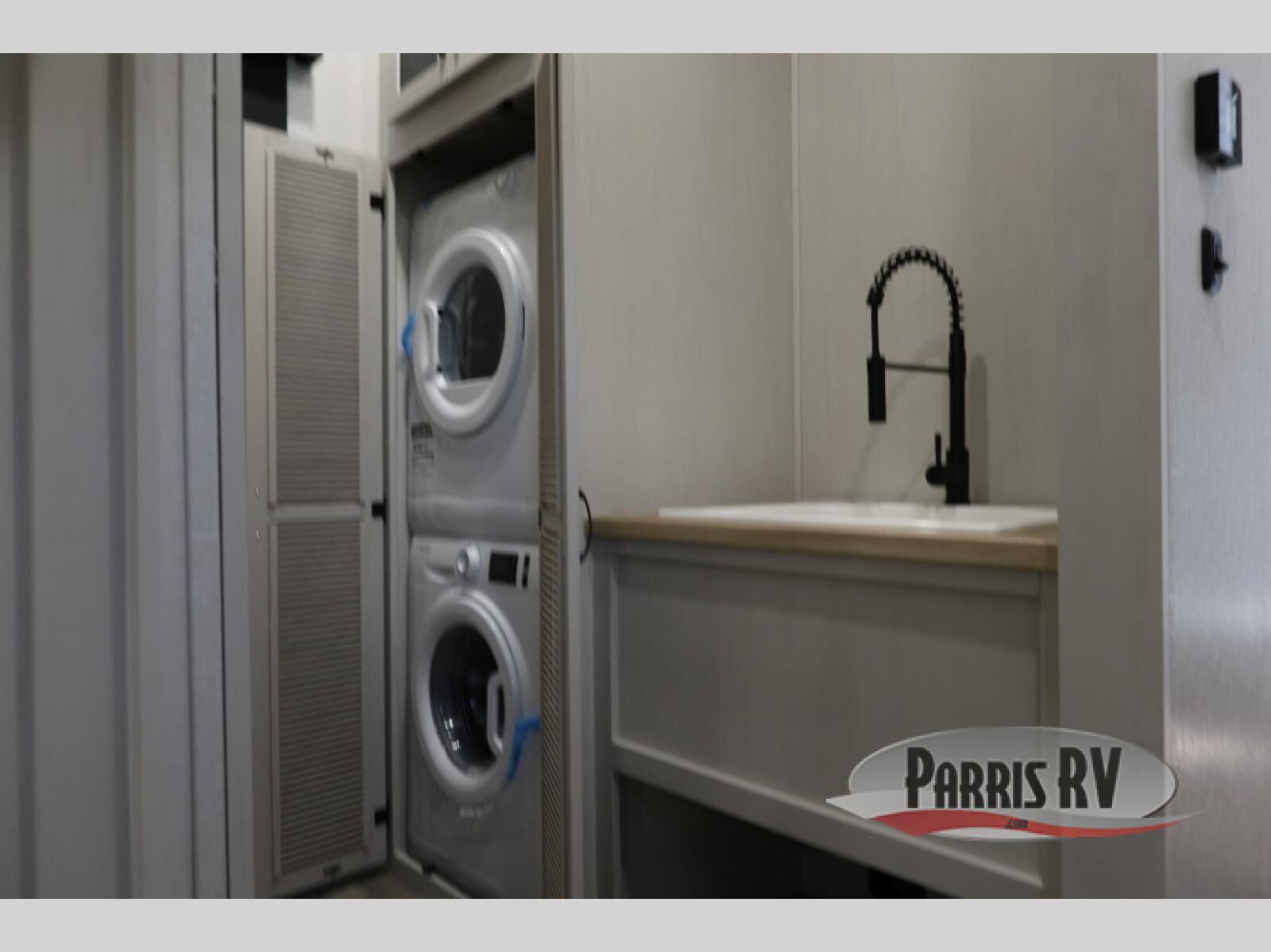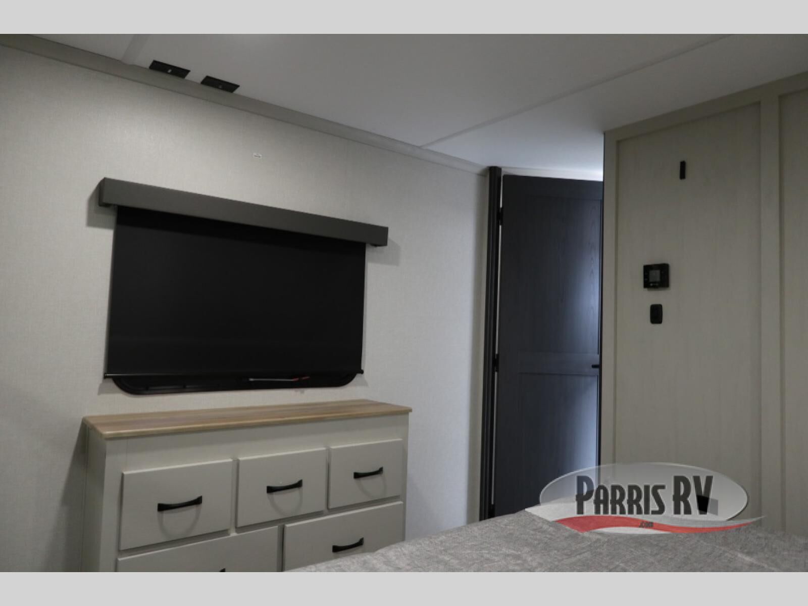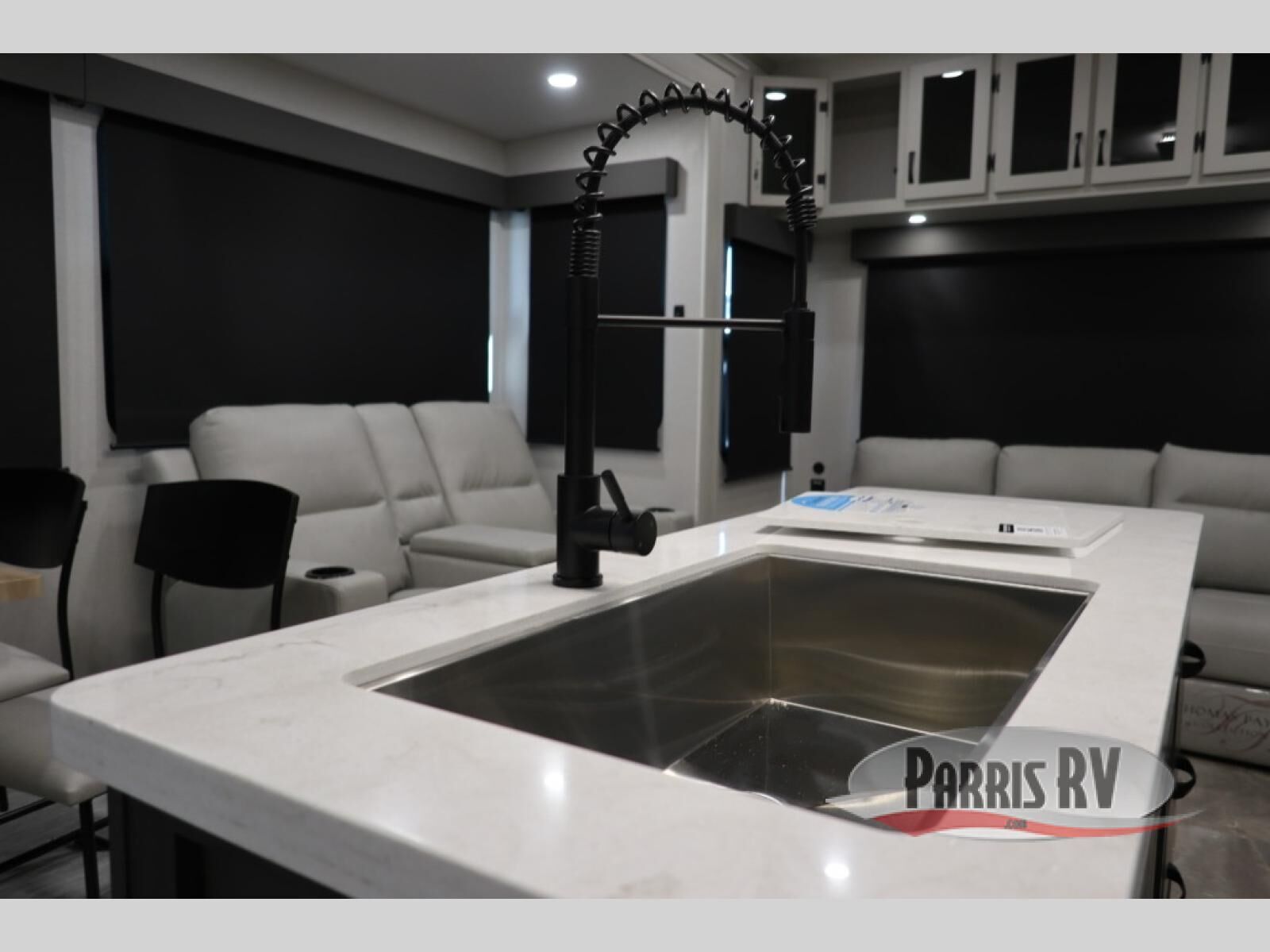 The rear living room is the perfect place to unwind, featuring a 78" trifold sofa, theater seating, overhead cabinets, and an entertainment center. Whether you're watching a movie, reading a book, or simply enjoying the company of loved ones, this room has everything you need to relax and recharge. The spacious kitchen is fitted with a kitchen island, refrigerator, microwave, free-standing table, hutch, and overhead cabinets. Perfect for preparing your favorite meals and enjoy with family. With a convenient coat bench, desk with flip-up storage, washer, and dryer, you'll have everything you need to stay organized and comfortable on the go. The full bathroom is an enormous oasis with a linen closet for added convenience. Also with a front bedroom featuring a king bed, dresser, shelves, and wardrobe, you'll have the perfect place to rest and recharge after a long day of adventure, also plenty of space for storing all your belongings and staying organized on the road.