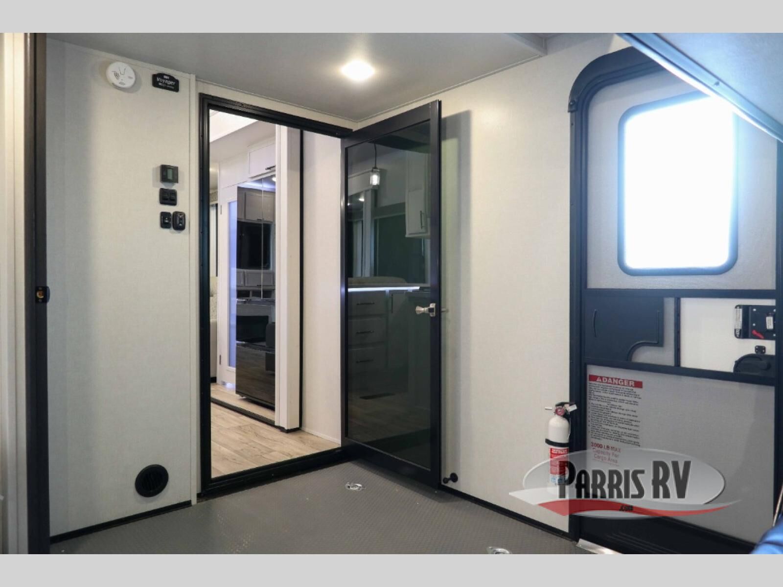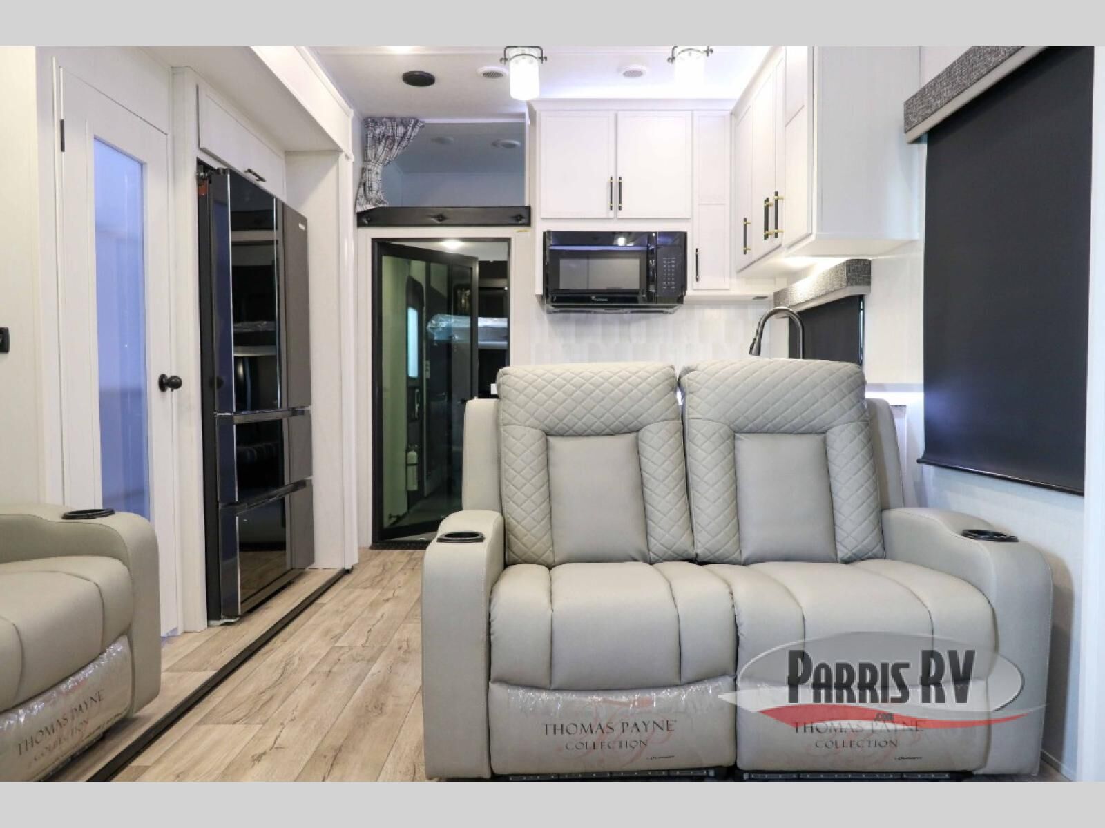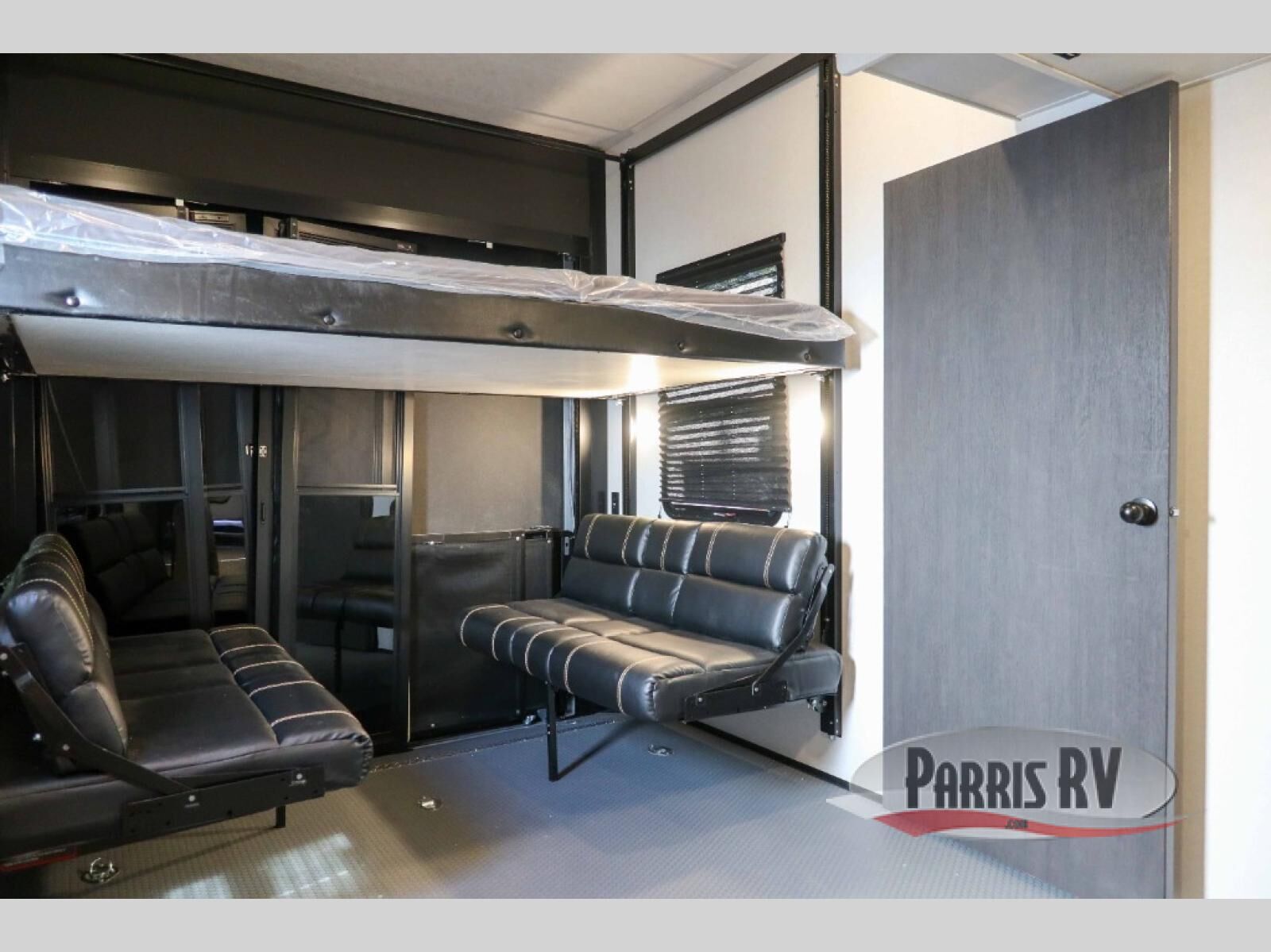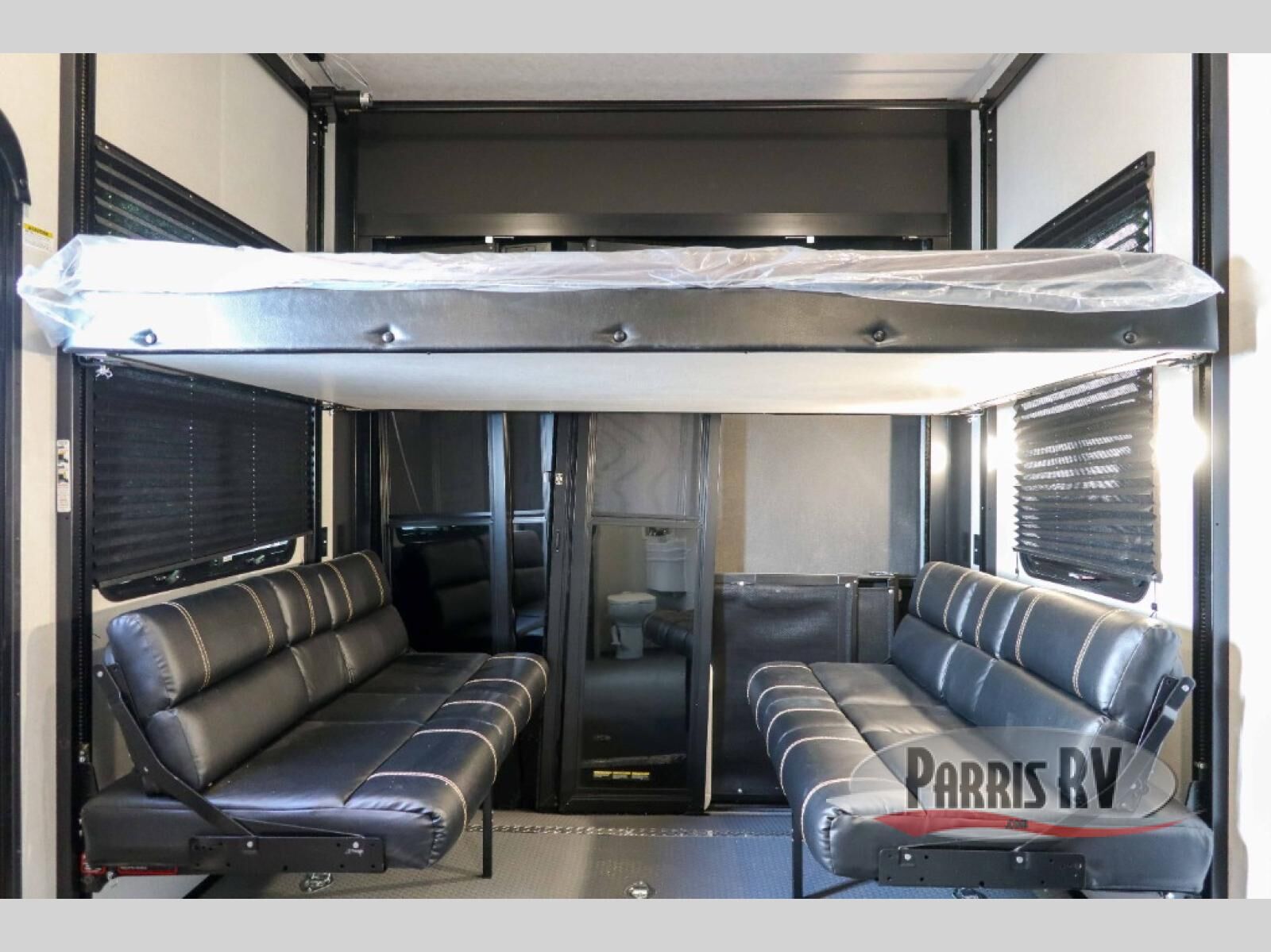 This Voltage toy hauler is going to get you pumped to start traveling! You will have your own master suite in the front which has private access to the dual-entry bathroom, and you can offer a guest suite with half bathroom, power bunk, sofas, TV, and exterior entry to your friends or family. A loft bed adds even more sleeping space, and you'll have a great relaxation area with the three sofas in the main living room. A pantry sits next to the 18-cubic foot refrigerator for food storage, and the rest of the kitchen appliances will help you prepare dinner in a flash.