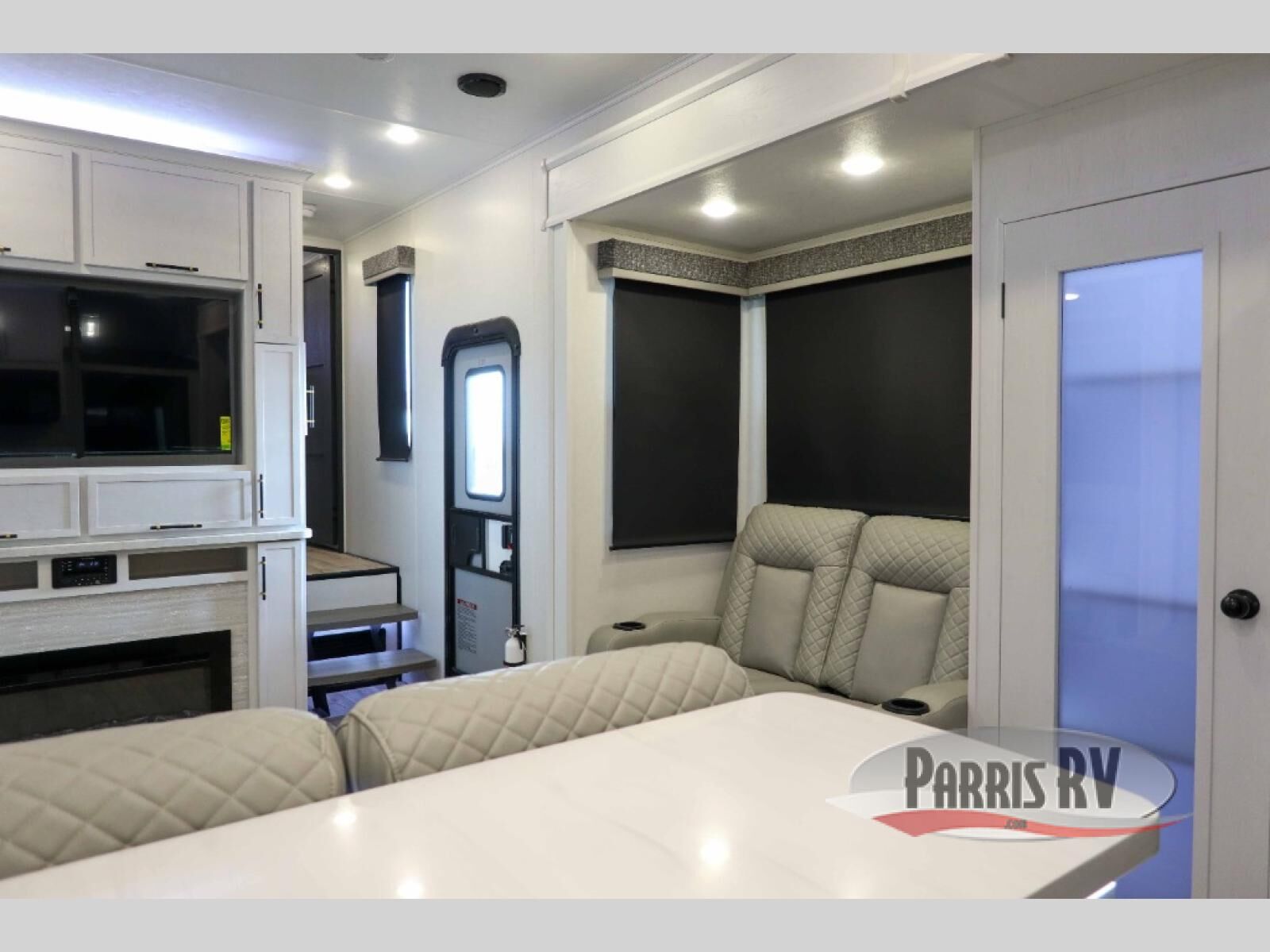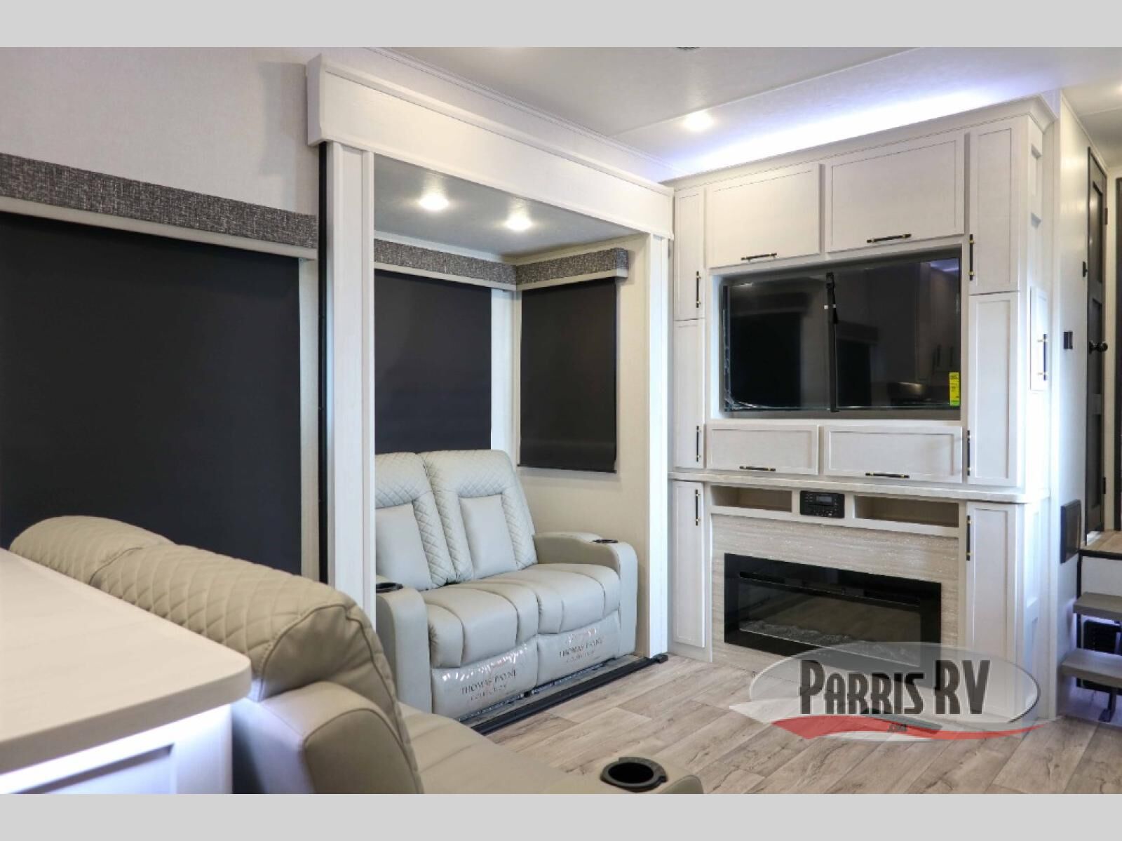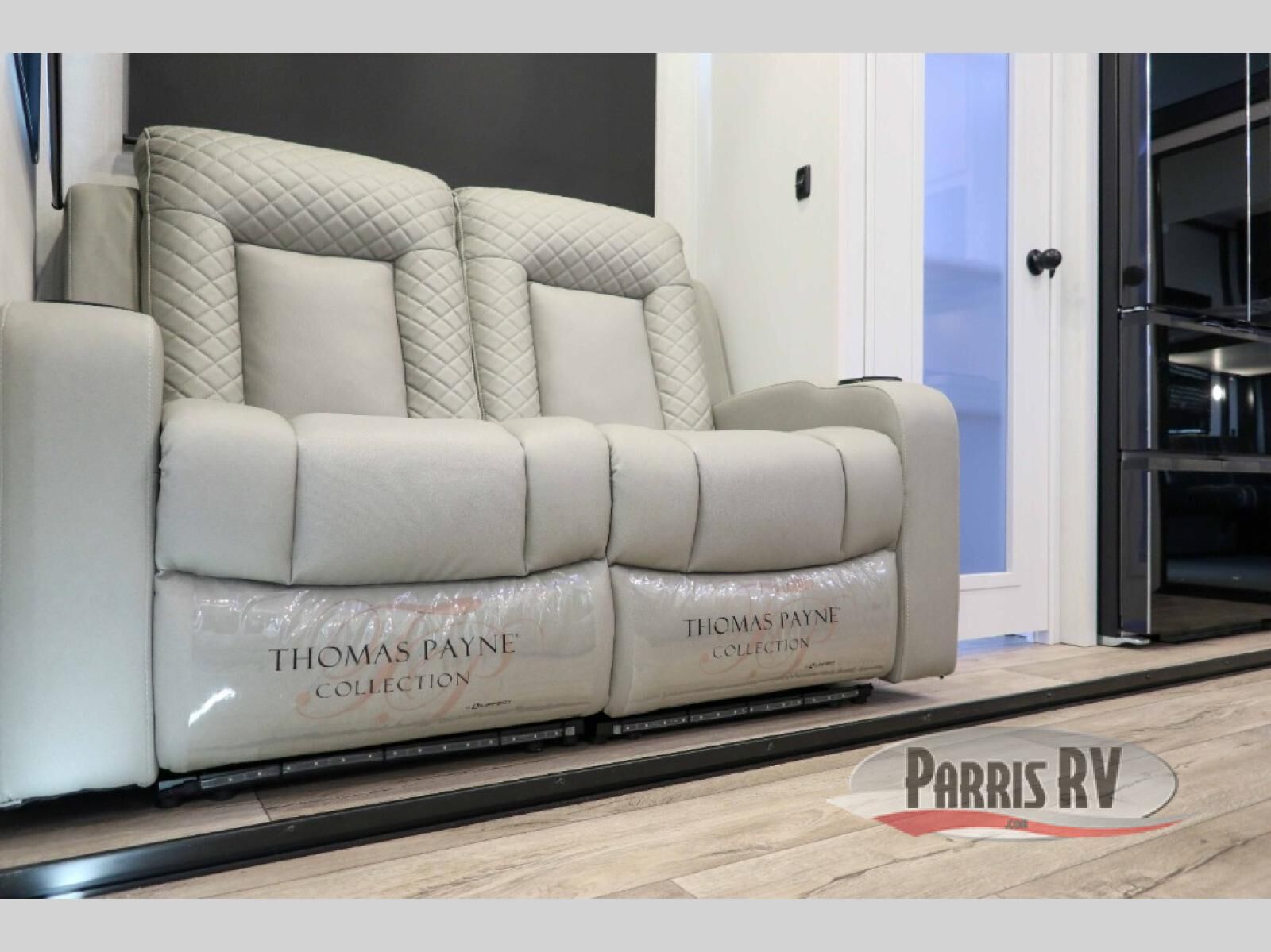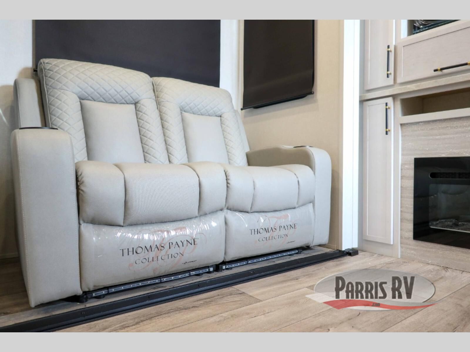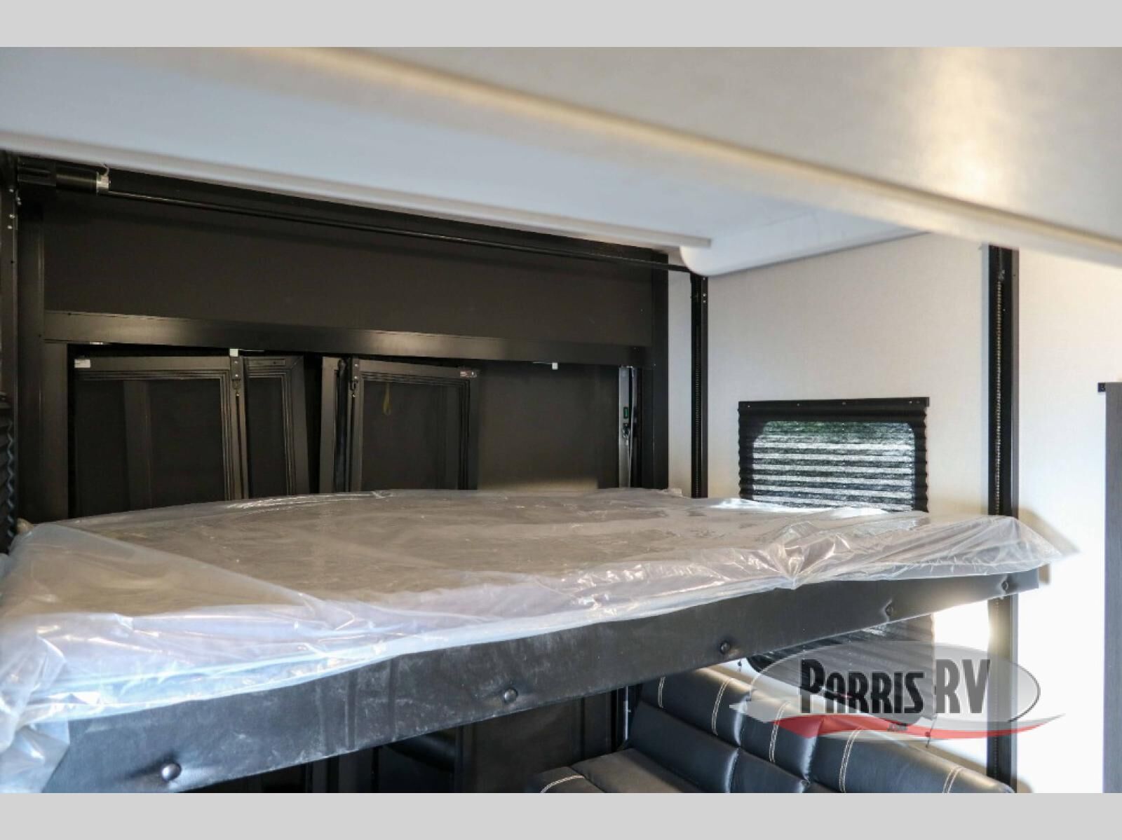 This Voltage toy hauler is going to get you pumped to start traveling! You will have your own master suite in the front which has private access to the dual-entry bathroom, and you can offer a guest suite with half bathroom, power bunk, sofas, TV, and exterior entry to your friends or family. A loft bed adds even more sleeping space, and you'll have a great relaxation area with the three sofas in the main living room. A pantry sits next to the 18-cubic foot refrigerator for food storage, and the rest of the kitchen appliances will help you prepare dinner in a flash.