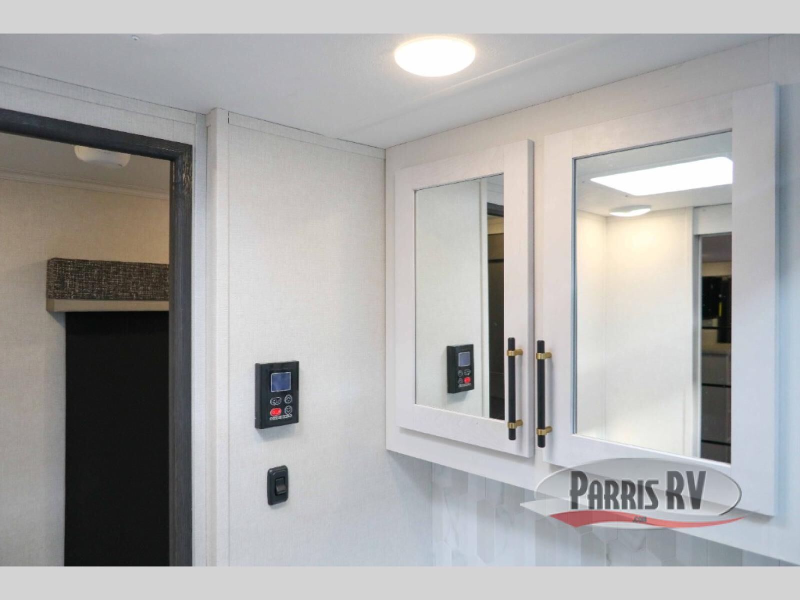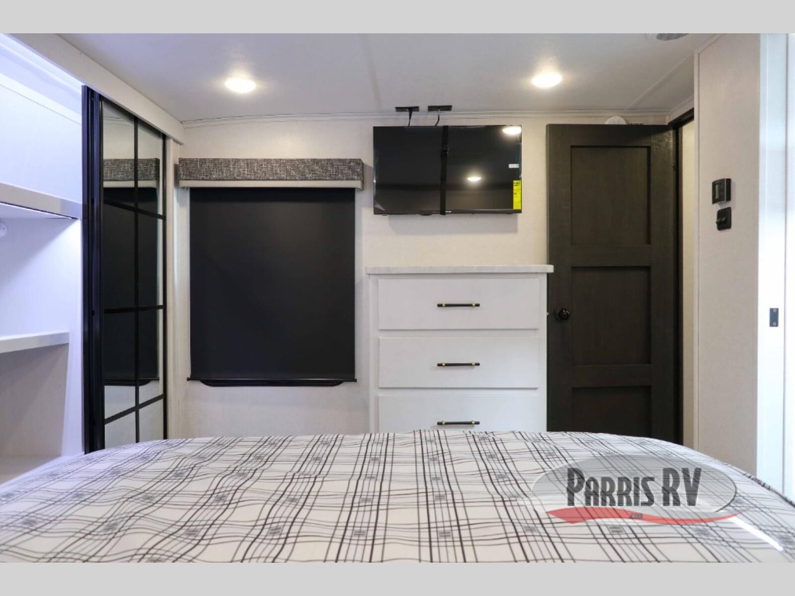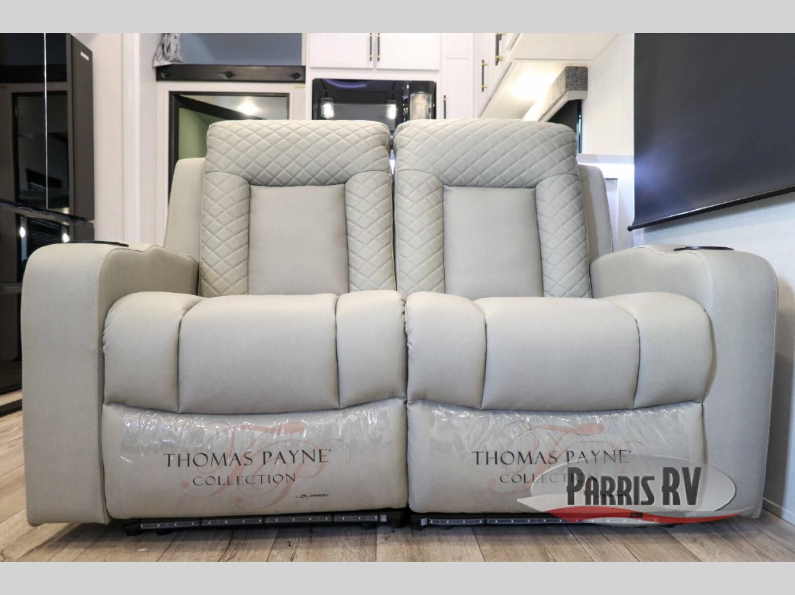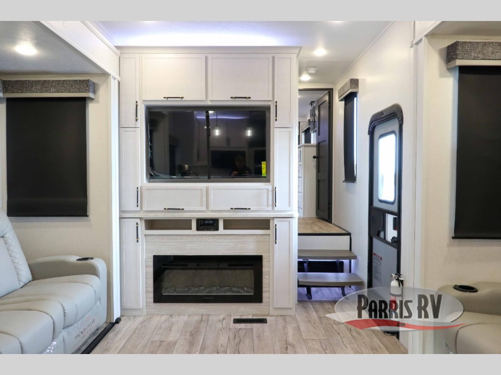 This Voltage toy hauler is going to get you pumped to start traveling! You will have your own master suite in the front which has private access to the dual-entry bathroom, and you can offer a guest suite with half bathroom, power bunk, sofas, TV, and exterior entry to your friends or family. A loft bed adds even more sleeping space, and you'll have a great relaxation area with the three sofas in the main living room. A pantry sits next to the 18-cubic foot refrigerator for food storage, and the rest of the kitchen appliances will help you prepare dinner in a flash.