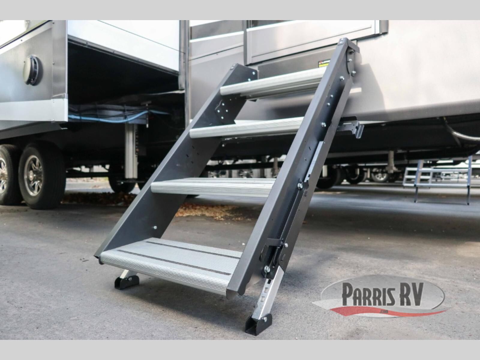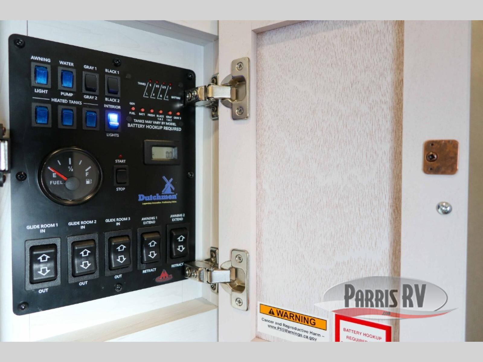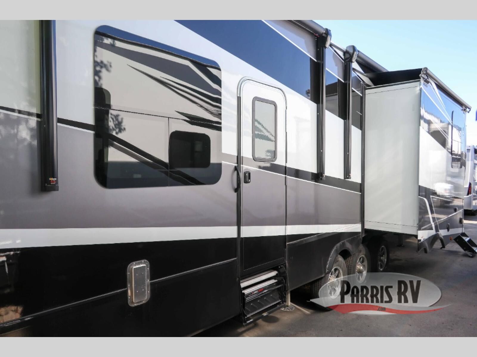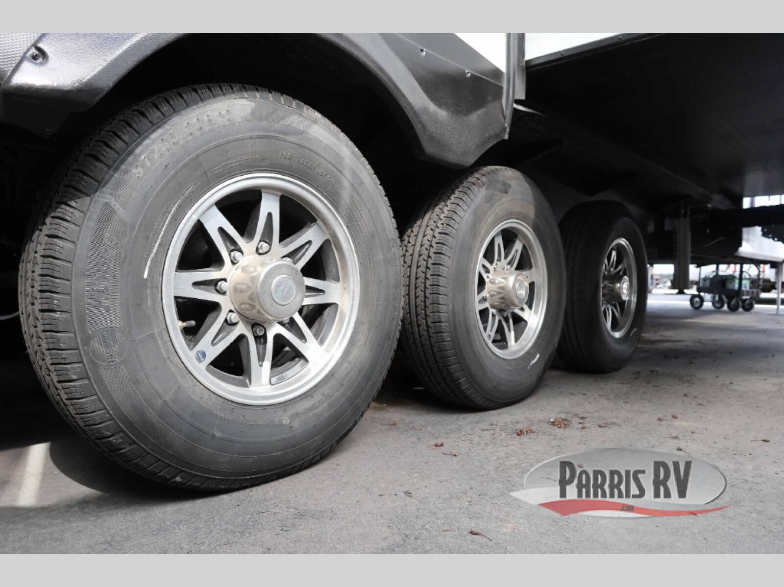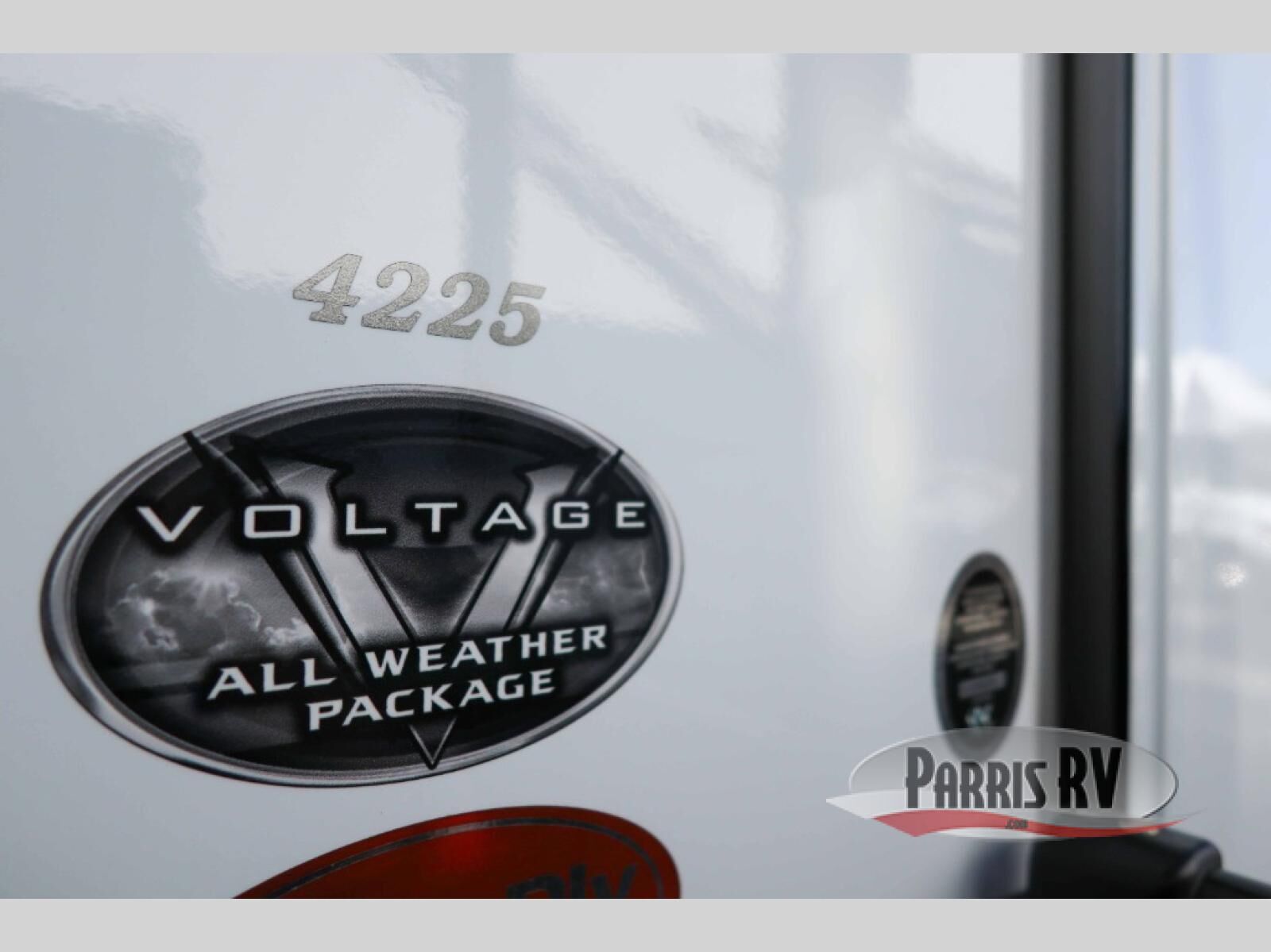 The Dutchmen Voltage toy hauler is an amazing RV that won't disappoint! These elegant units have more durability and luxury than you ever thought possible. They include an All Weather Package, 16" custom wheels, MorRyde CRE 3000 suspension, and a second fuel tank for a total of 60 gallons. There is a second power awning over the garage entry door, and you will even find a third awning above the ramp patio. The tinted frameless windows will protect you from outside prying eyes and harsh sunlight, and the interior solid-surface countertops in the kitchen will withstand many years of chopping and dicing. You'll also have a 12" diamond plate in the garage for protection, and there is an on-demand tankless water heater for hot showers after trail riding!
