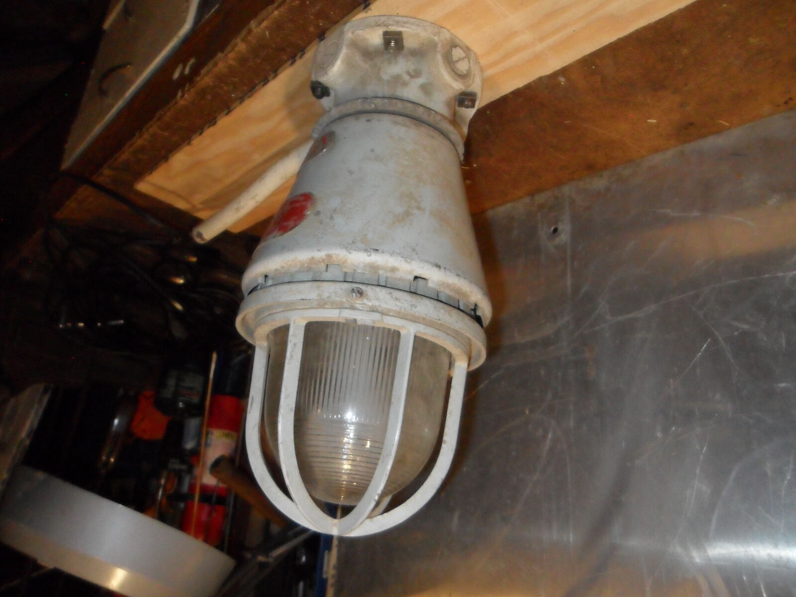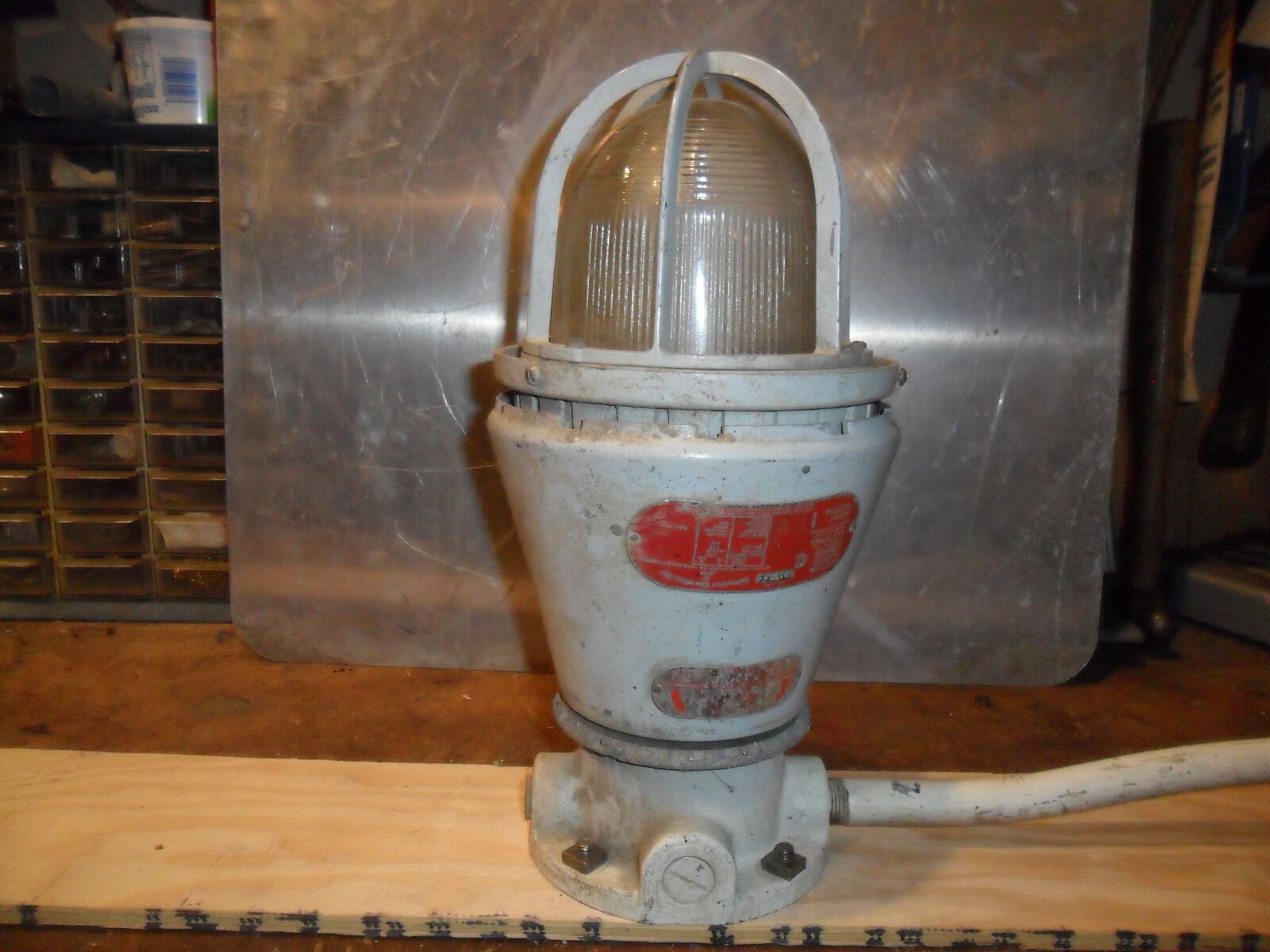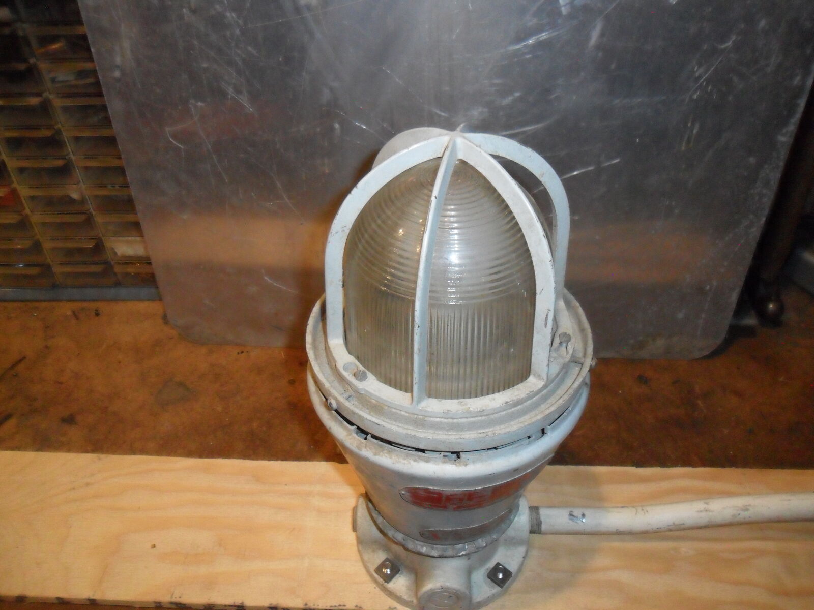 This old industrial light measures about 14"x7" and is in working condition . Right now it has a 130 watt bulb in it that can be changed to any standard bulb wattage you want. Leave it bright or turn it into a colored mood light. It will make a great industrial or steam punk addition to home or shop. Offers considered. Thanks for looking.