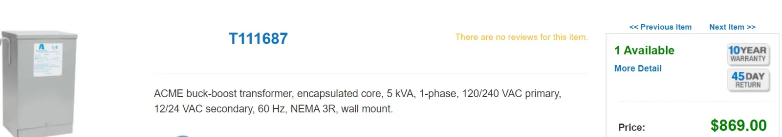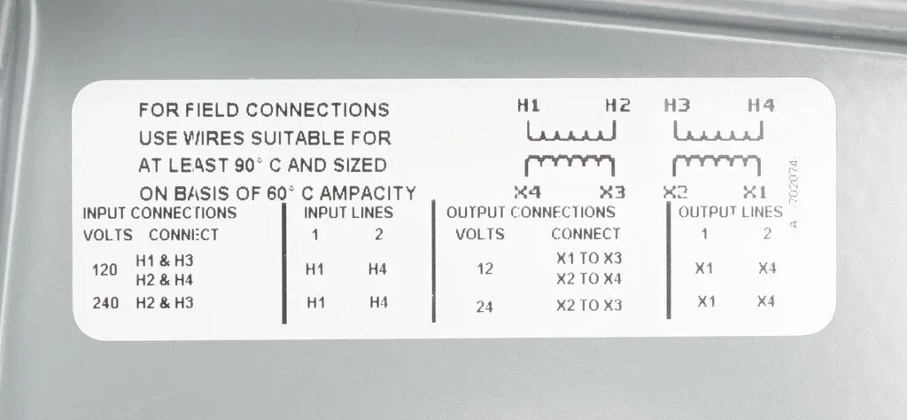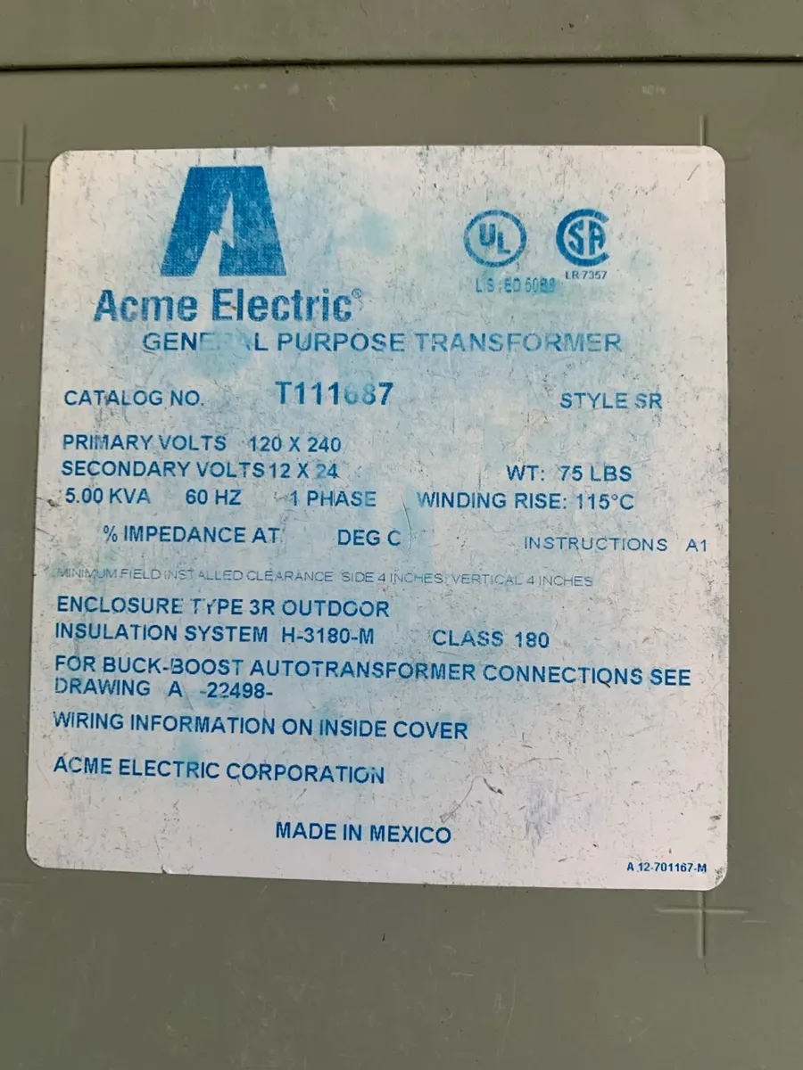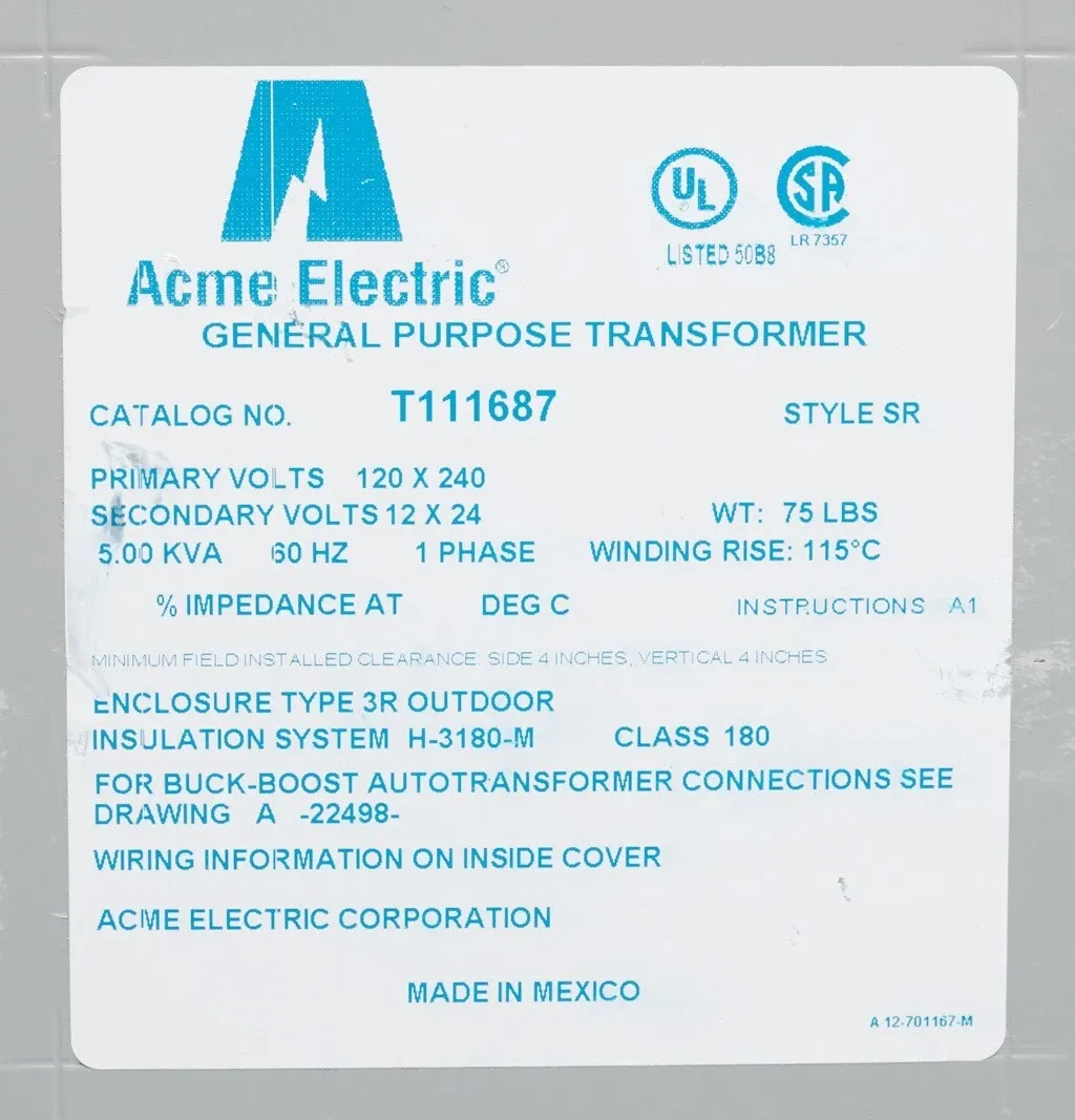 Brand ACME Item Transformer Core Type Encapsulated Power Rating 5 kVA Number of Phases 1 Primary Voltage 120/240 VAC Secondary Voltage 12/24 VAC Frequency 60 Hz Electrostatic Shield No NEMA Rating 3R Mounting Wall Application Suitable for use as isolation transformer in 1-Phase applications or an auto transformer in 1-Phase or 3-Phase applications