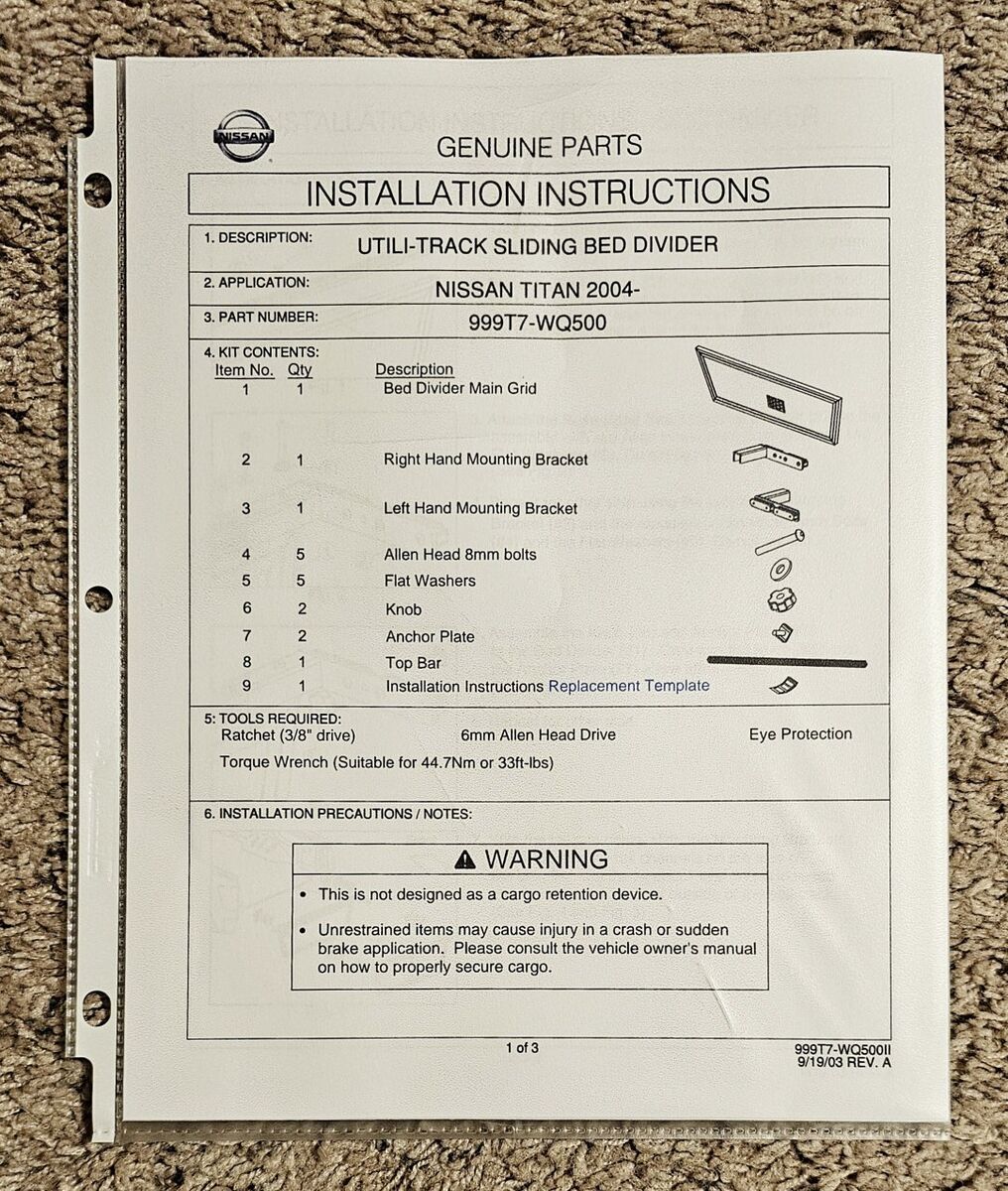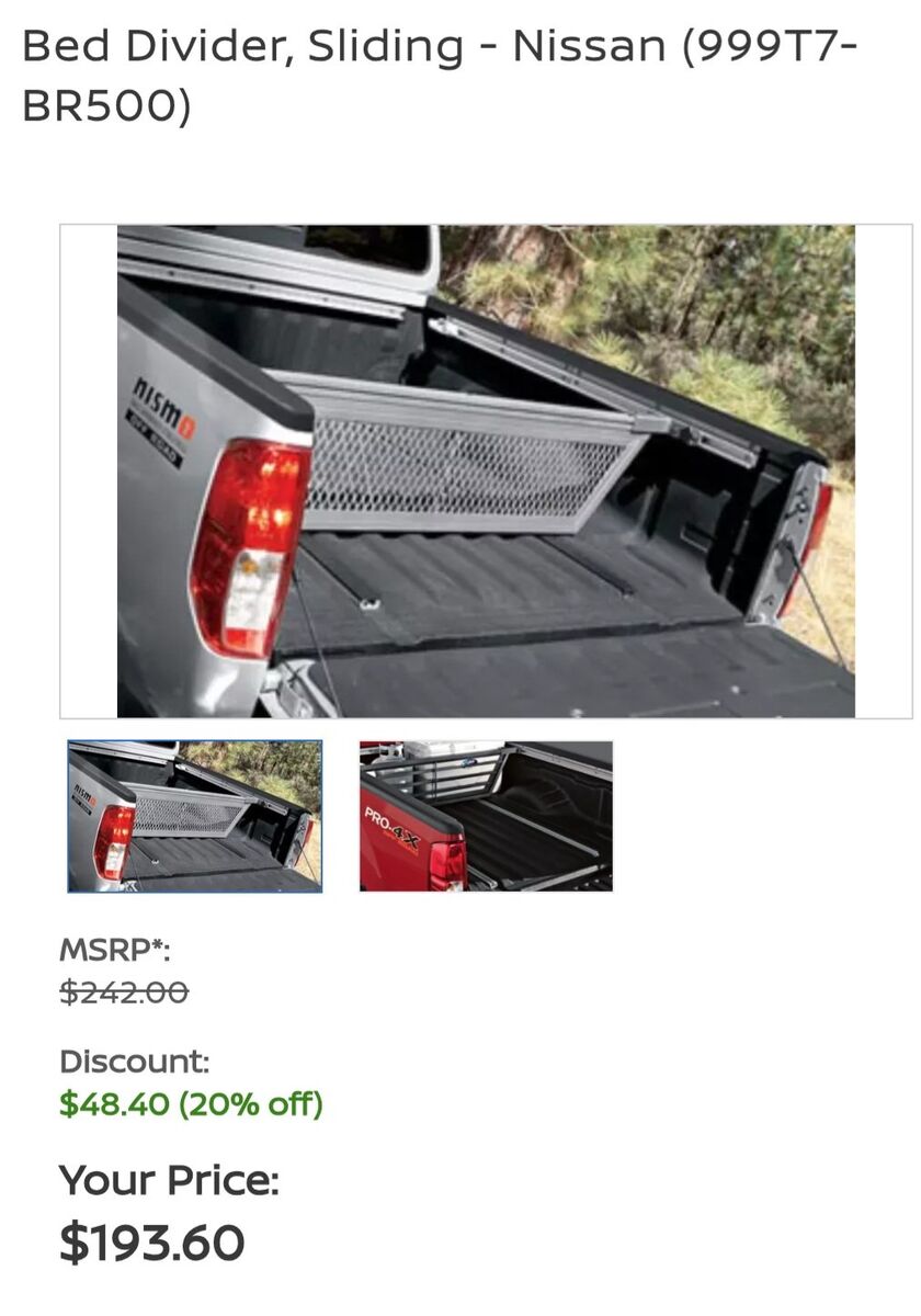 WHAT’S FOR SALE: OEM Nissan Titan / Frontier Bed Divider. It is in near mint condition. Divides the cargo area to create partitions or compartments and stabilizes cargo to prevent movement. Possibly capable of being placed in other makes and models of pickup trucks, review the photo, showing the dimensions to see if it'll work in your truck. Great for keeping your groceries at the back of the truck by the tailgate.