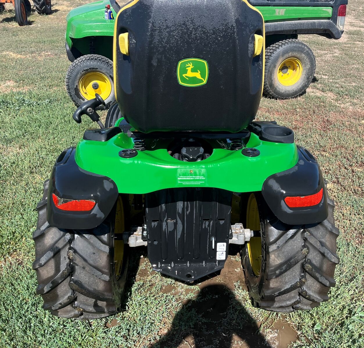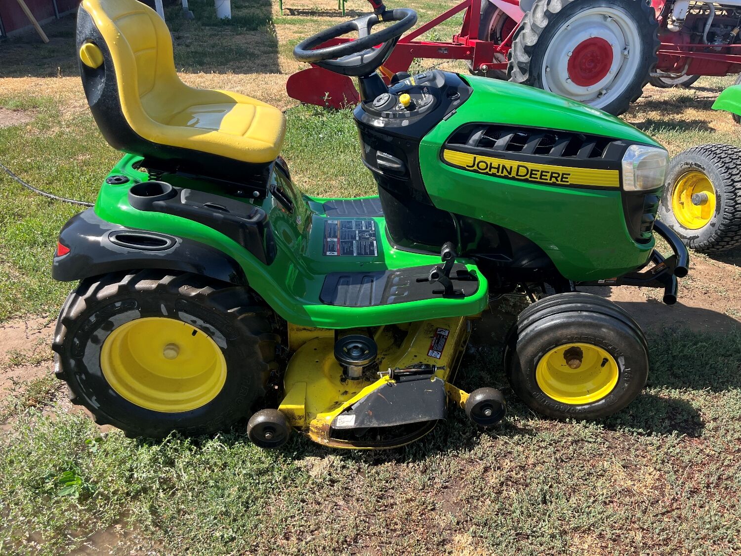 Bought new from Lowe's : John Deere E170 CARB 48-in 25-HP V-twin Riding Lawn Mower. We put new ag tires on it so it has really good traction. It is ready to go to work, makes it easy to maintain large spaces, really good turning.